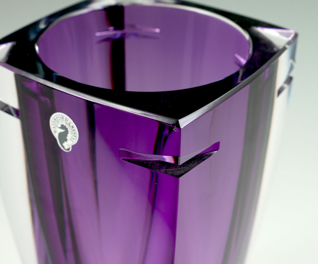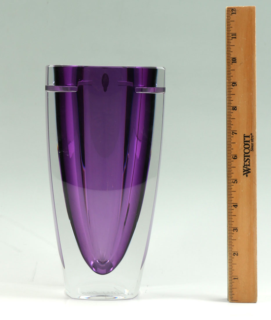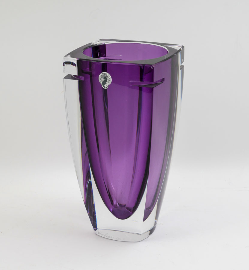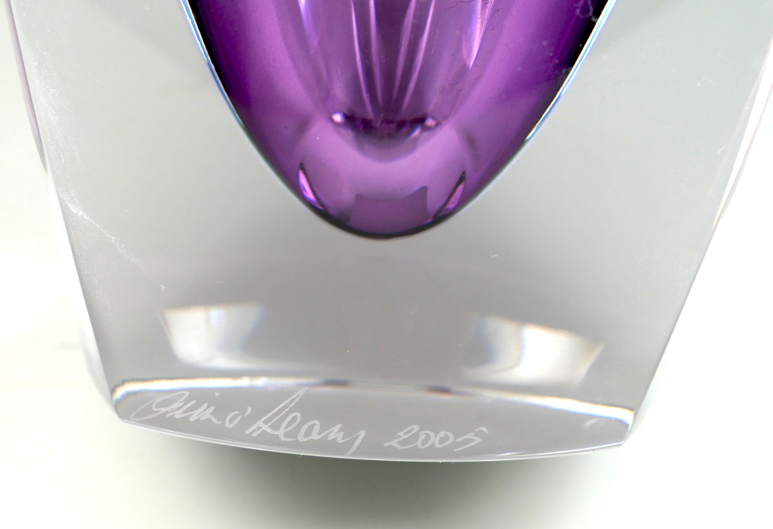 WATERFORD JIM O'LEARY SIGNED AMETHYST VASE: Amethyst and clear crystal vase designed and signed by Jim O'Leary, Design Director for Waterford, dated 2005, sold with COA. Overall measures 9 3/4'' h. x 5 1/8''