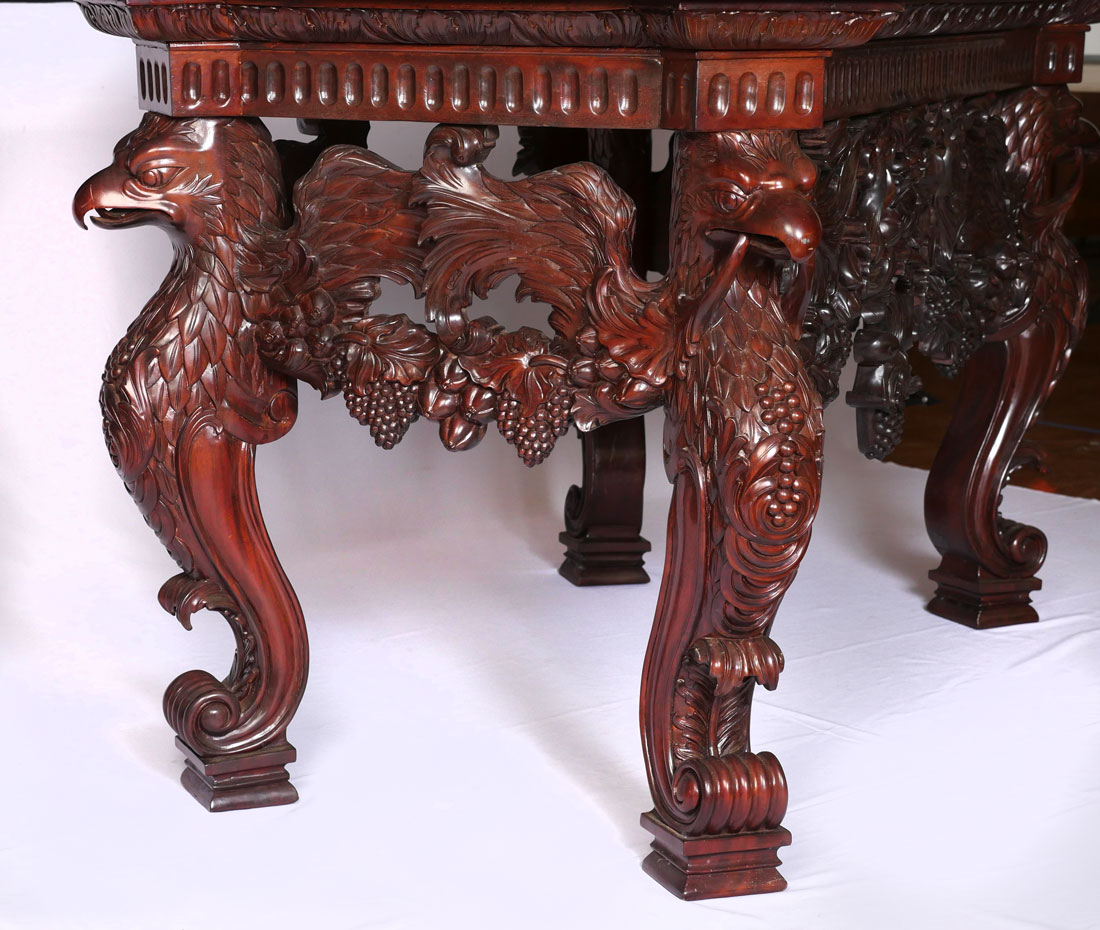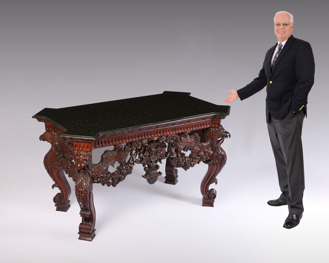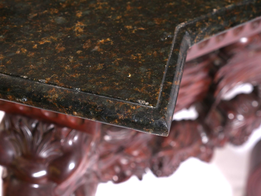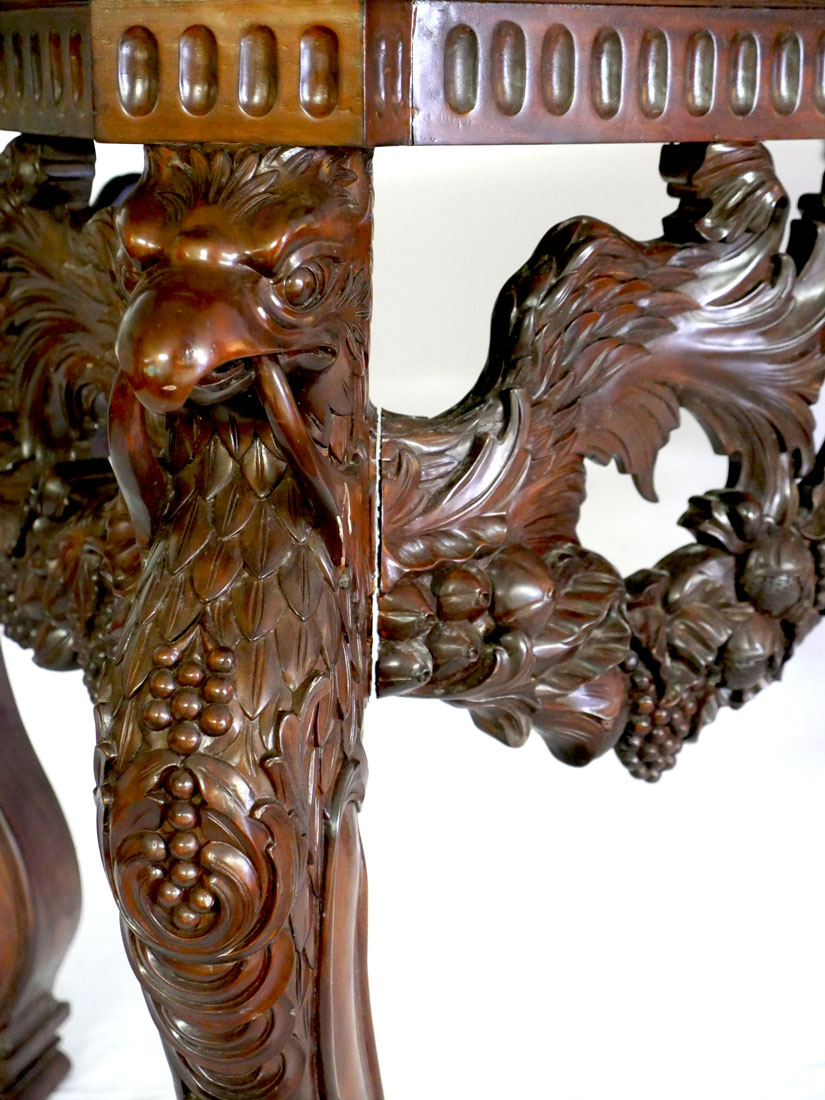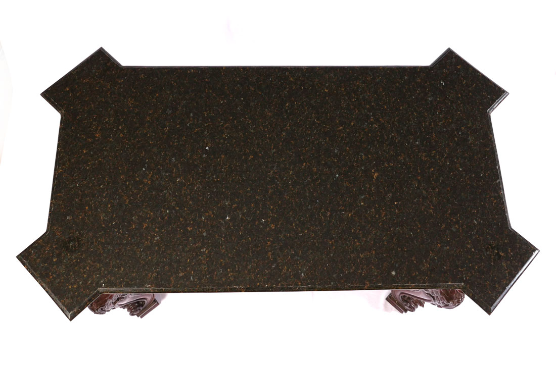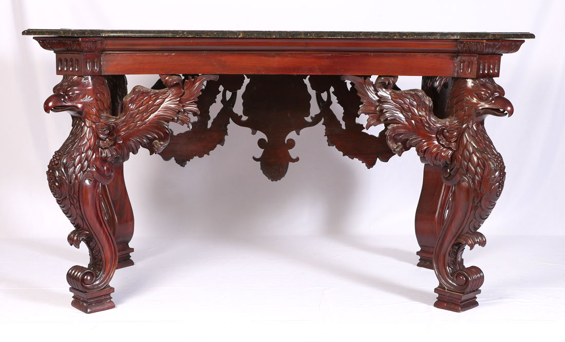 FIGURAL CARVED GRIFFIN MAHOGANY LIBRARY TABLE: Contemporary mahogany carved base with figural griffin busts at joints, wings spreading to open work skirt, additional foliate designs. Granite top with extended canted corners, overall measures 36 1/2'' h. x 66'' x 38 1/2''.