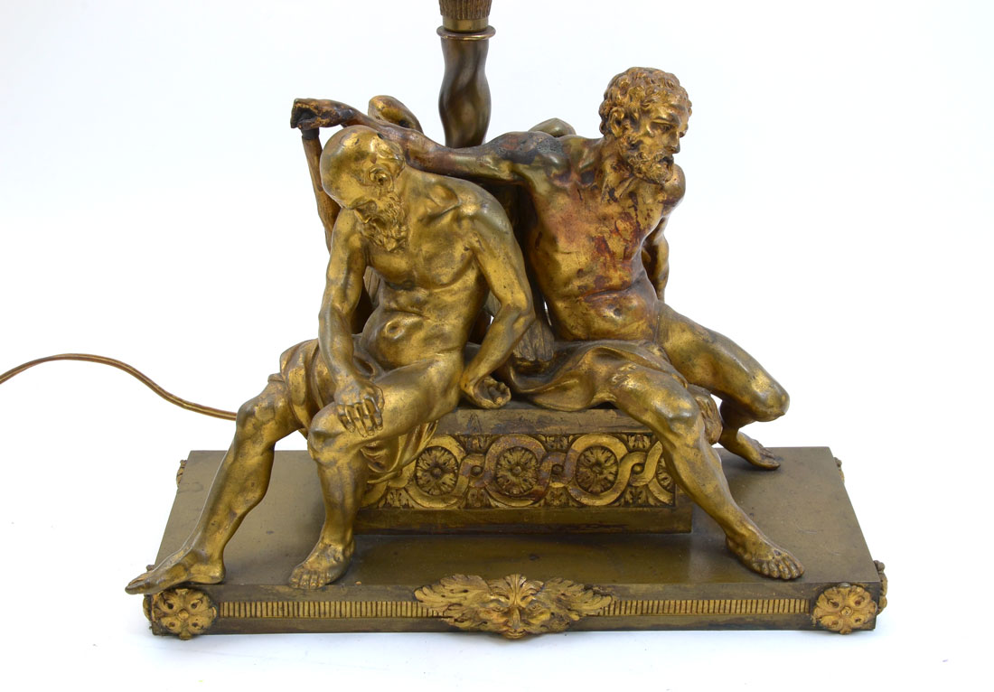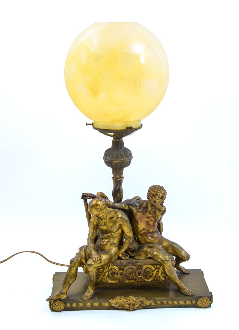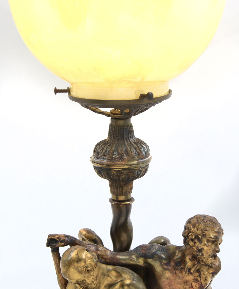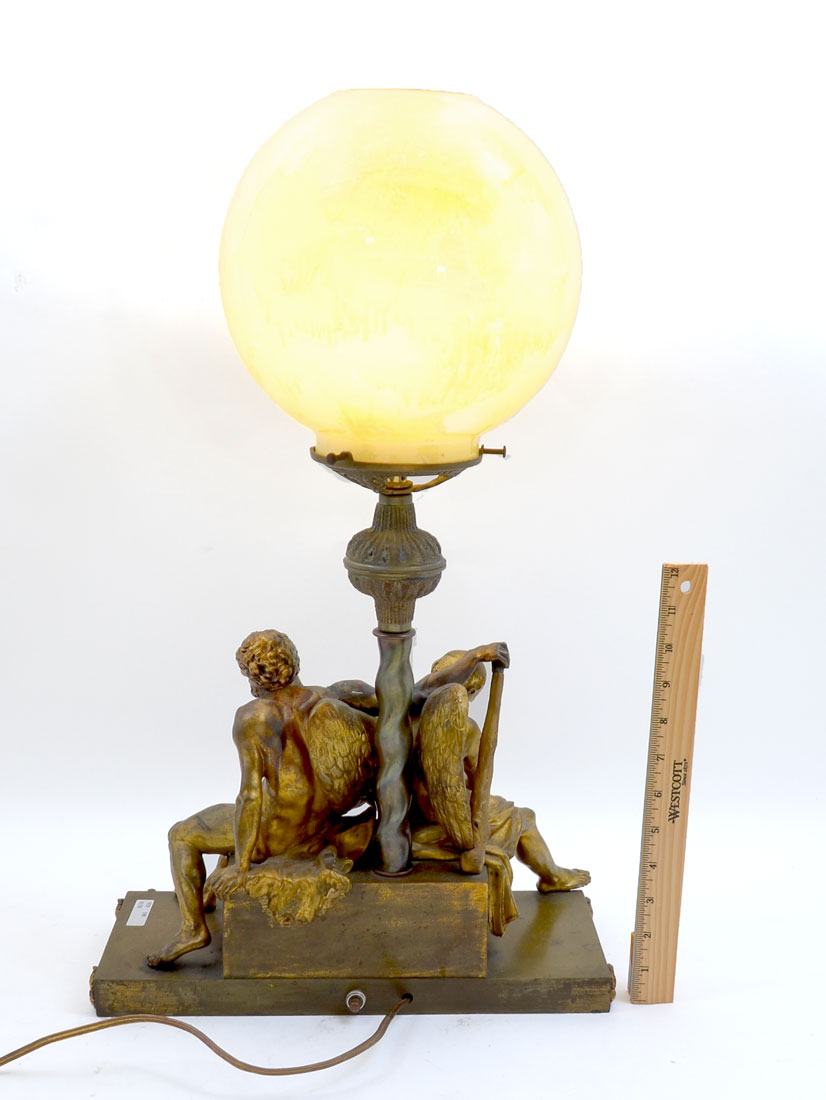 SEMI NUDE FIGURAL CAST BRONZE LAMP: Heavy cast bronze, neo-classical style with 2 seated figural semi nude men on base with masqueron and rosettes, single socket fixture, 15 1/4'' h. x 14 1/4'' x 6 1/2''. Sold with a iridescent glass globe, 8 3/4'' h. x 8 1/2'', fitter rim 4''.