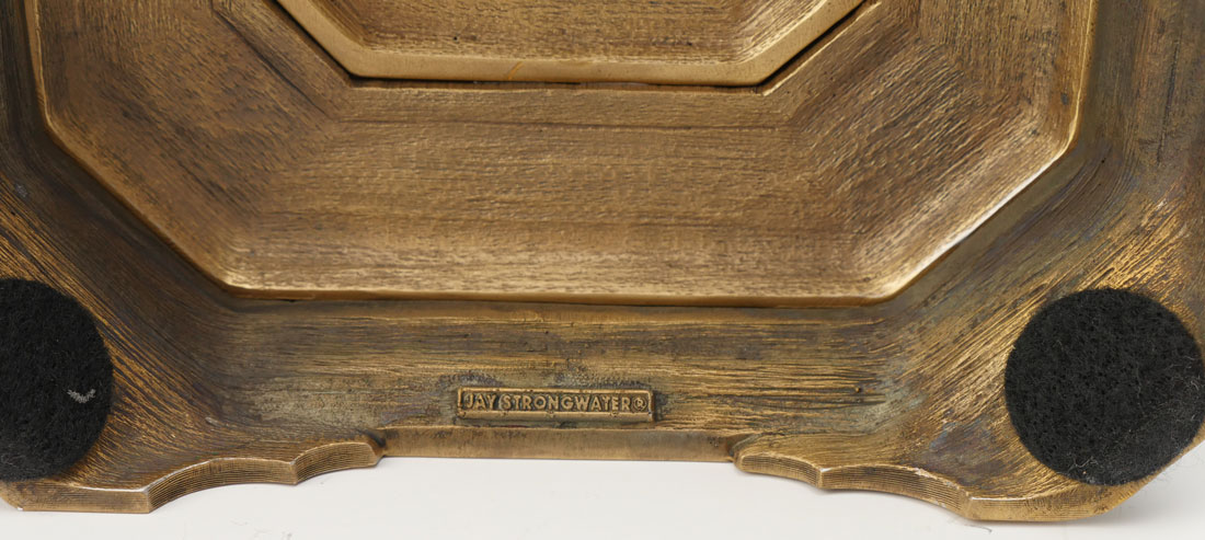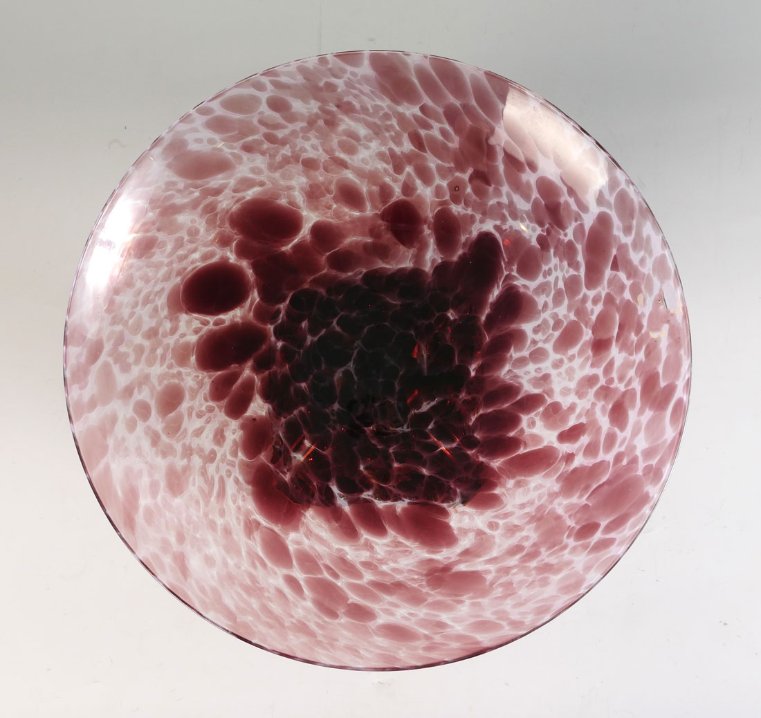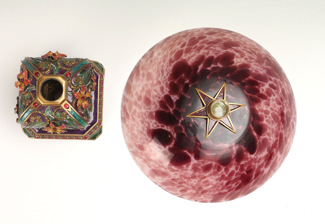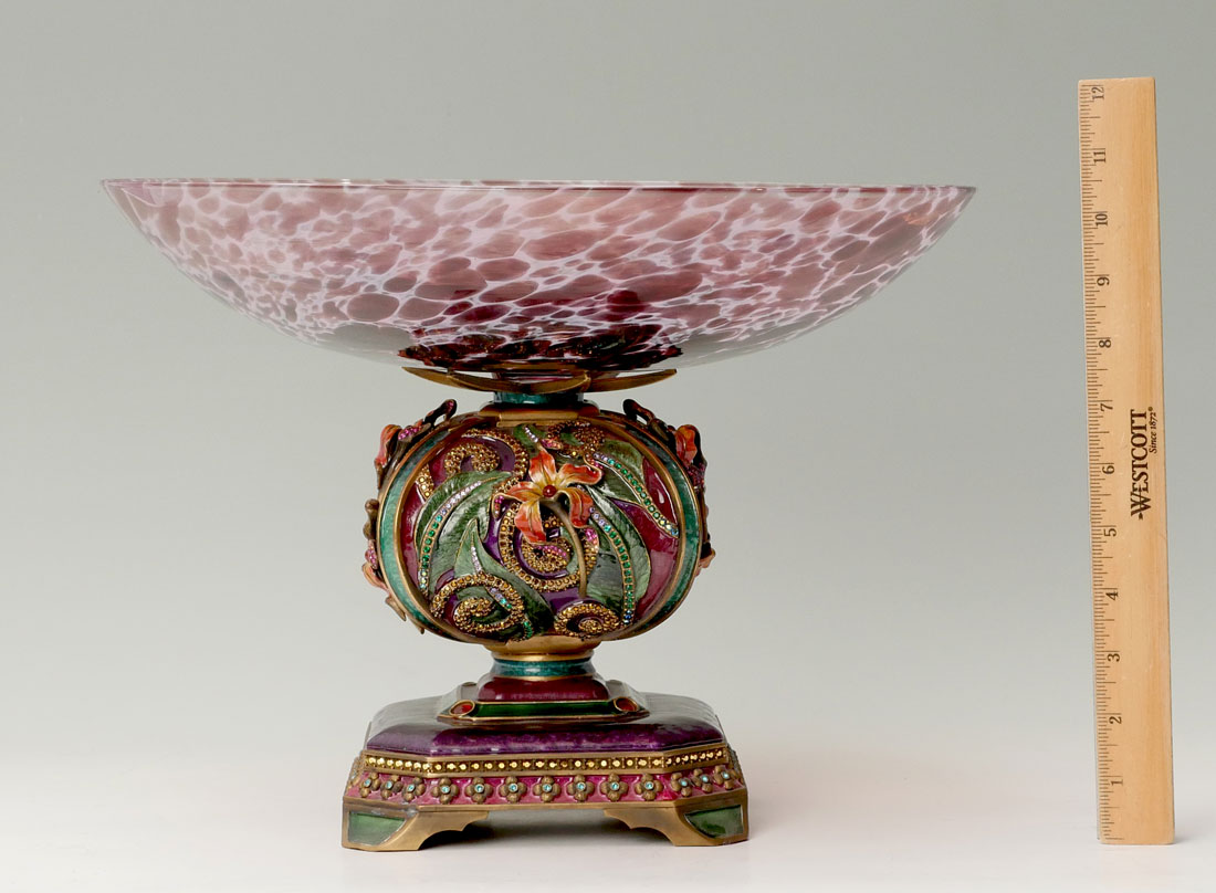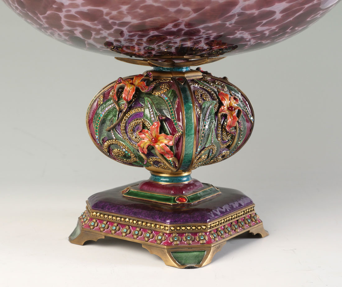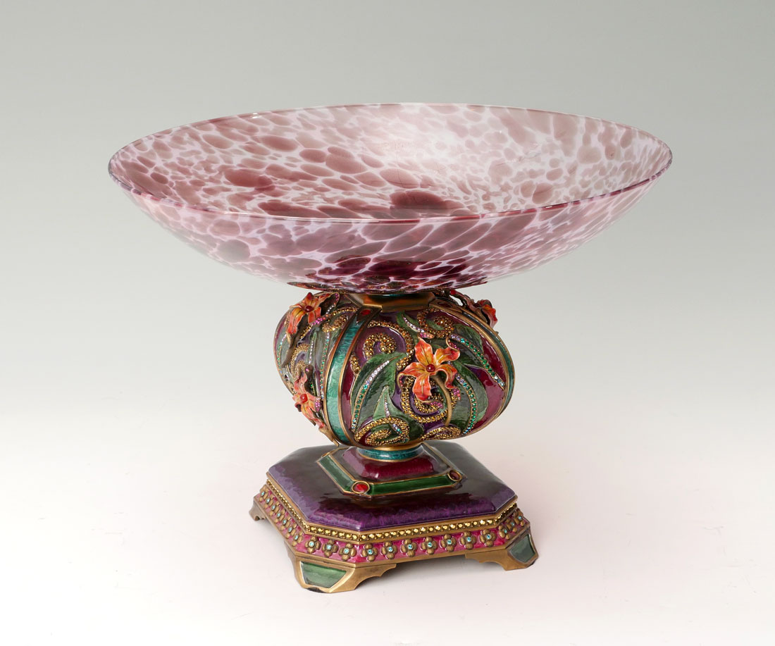 JAY STRONGWATER ENAMEL & GLASS COMPOTE: Oilspot amber glass bowl above enameled floral motif metal base on 4 bracket feet. Original price tag of $3,500 on bowl. Overall measures 10 3/4'' h. x 14 3/4''.