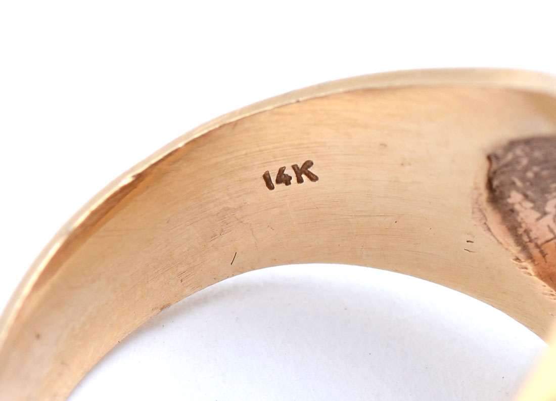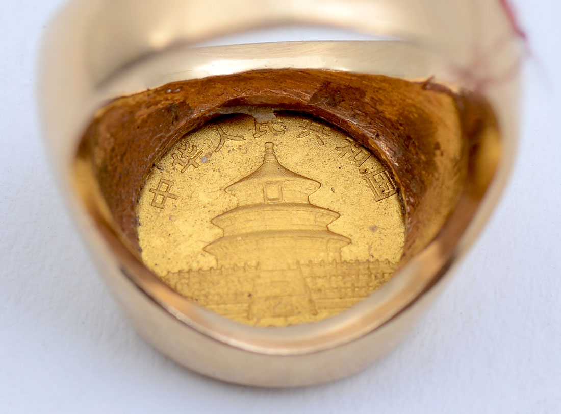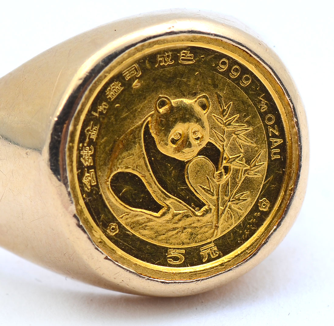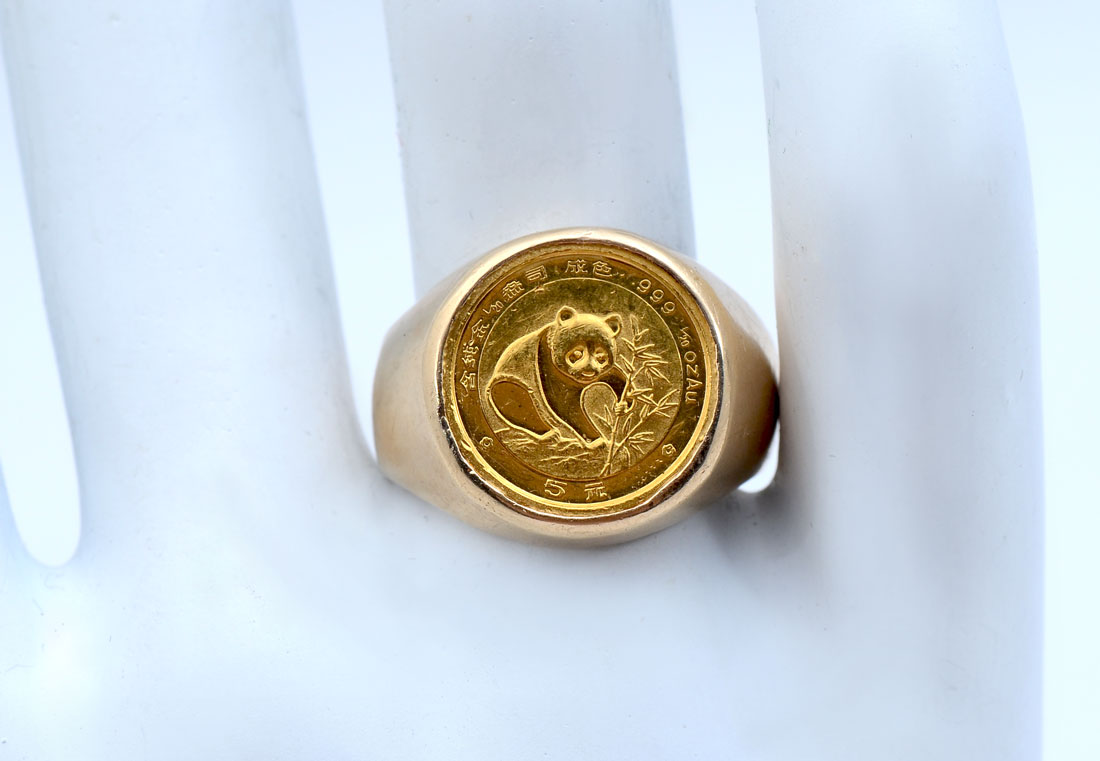 .999 GOLD 1/20 PANDA COIN in 14K RING: 24kt gold 1/20 oz. panda coin mounted in a beautiful 14kt gold ring, size 7. Weight 11.1 grams.