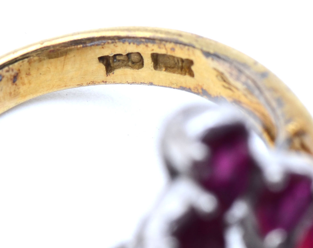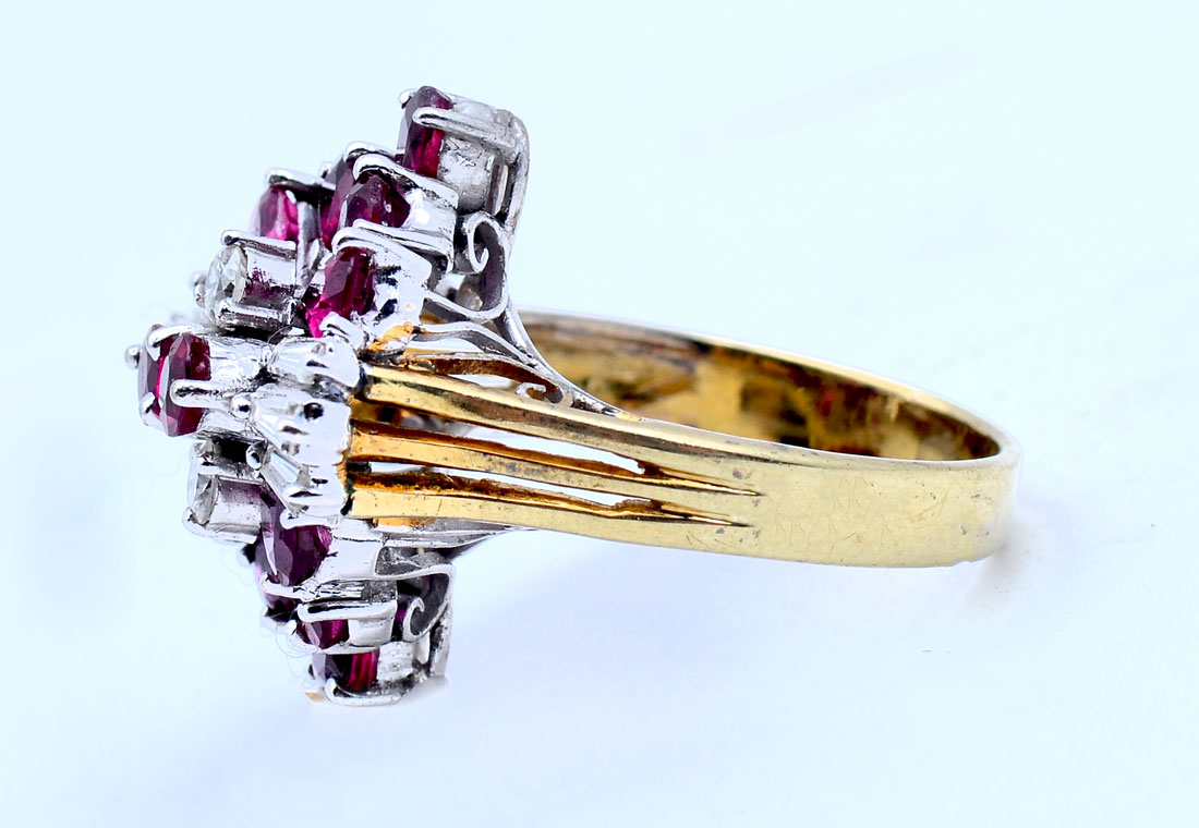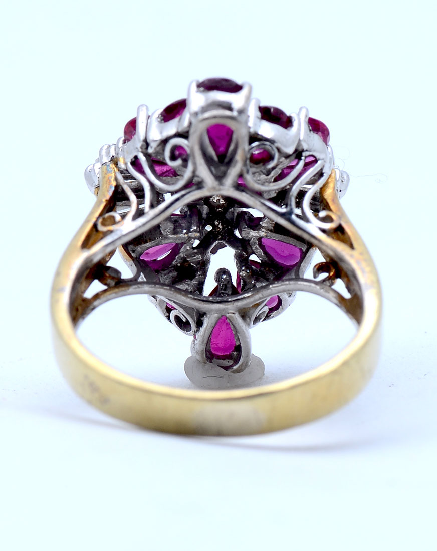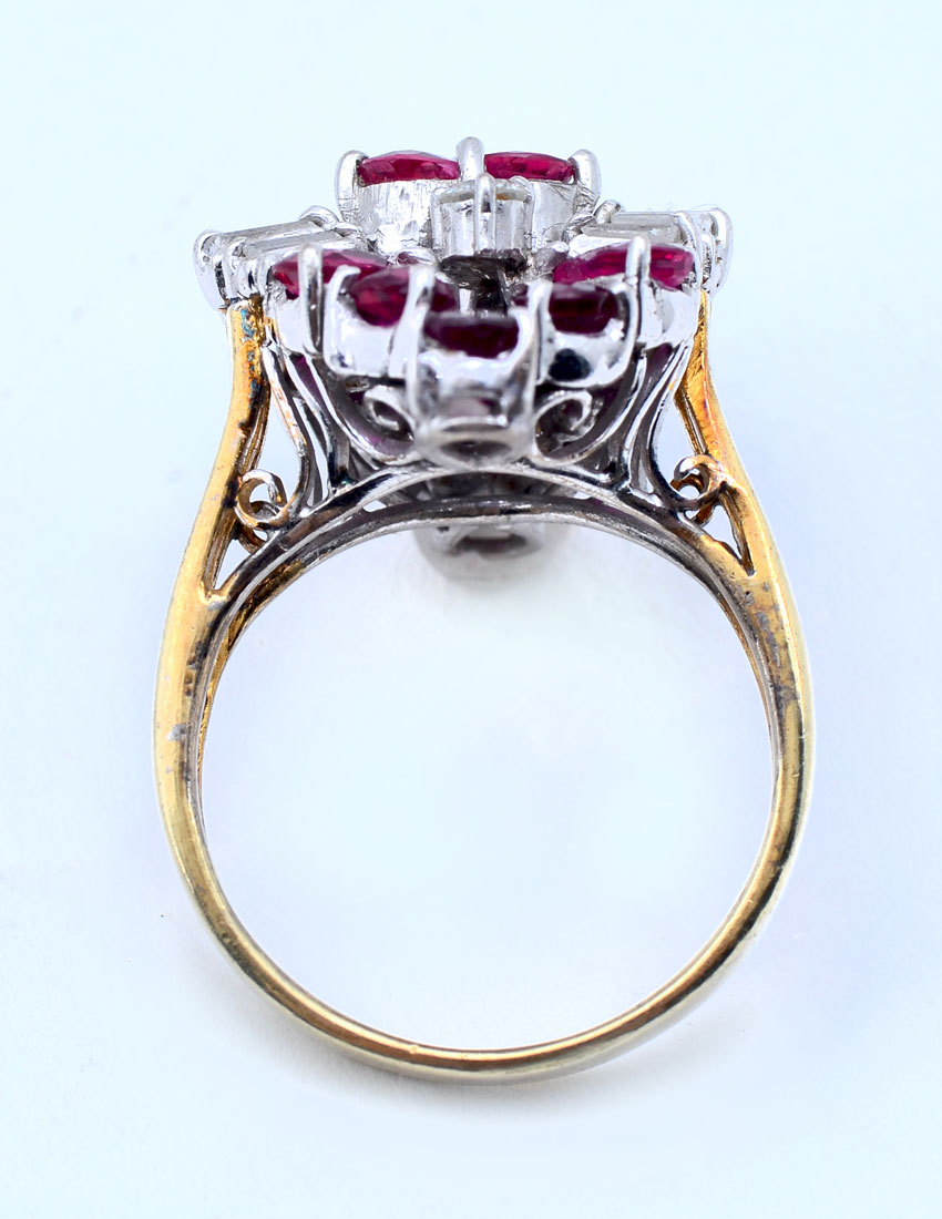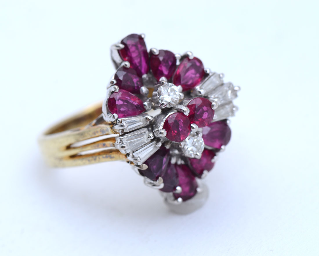 2 TONE 18K RUBY & DIAMOND CLUSTER RING: 12 pear cut rubies are featured in this vintage cocktail ring balanced by 6 baguette and 2 round cut diamonds set in white gold. Band is yellow gold. Size 6. Weight approx 7.3 grams.