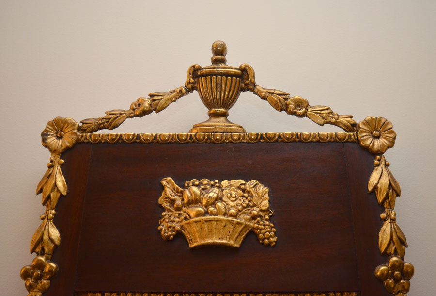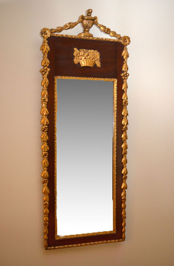 FEDERAL STYLE GILT WOOD AND GESSO WALL MIRROR: 19th century, mahogany frame with carved gilt wood and gesso accents, urn finial, floral swags and side trim. 44 1/2'' h. x 17 1/2'' x 2 1/4''.