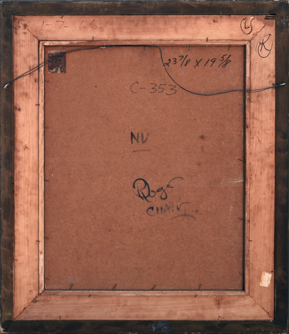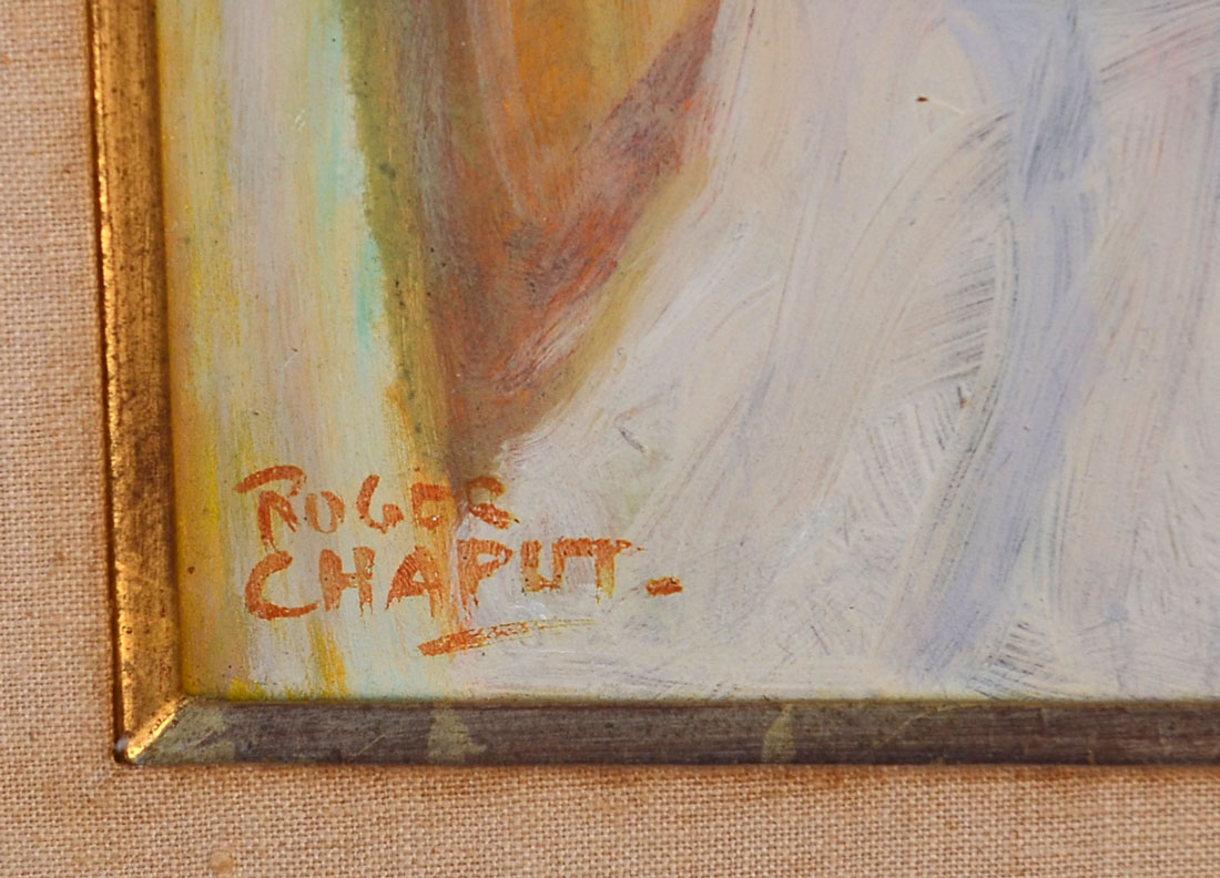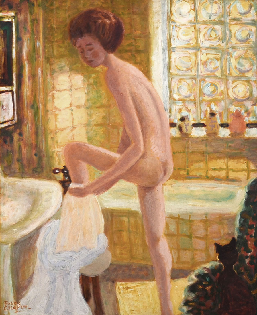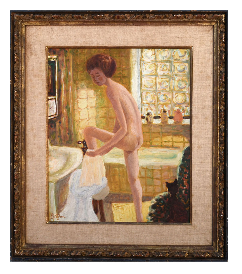 CHAPUT, Roger, (French, 1909- ): ''Young Female Nude Readying for the Bath'', Oil/Masonite, sight size is 24'' x 20'', signed lower left and signed verso, framed 33'' x 28.50''.