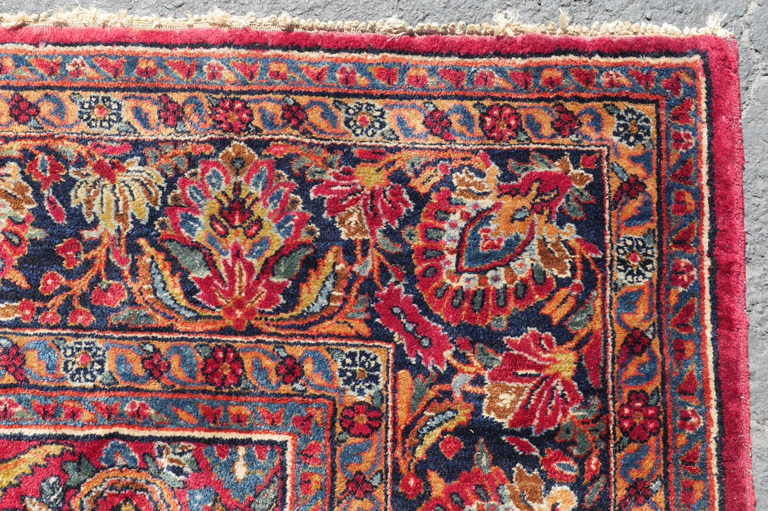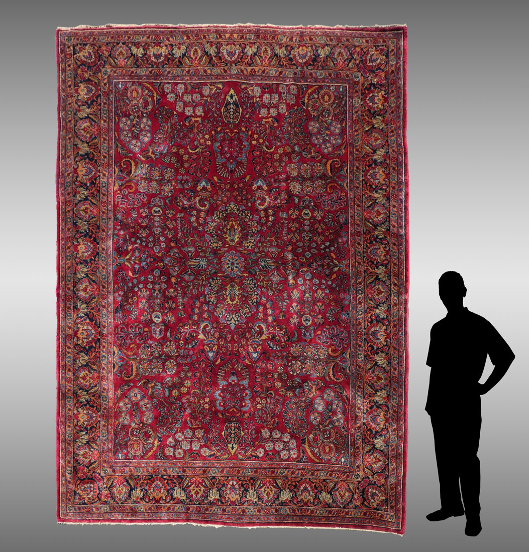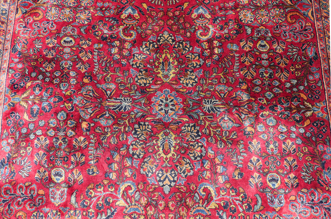 SEMI-ANTIQUE PERSIAN SAROUK HAND KNOTTED WOOL RUG, 8'9'' x 11'7'': This beautiful example of a traditional Persian Sarouk has been made with a silky looking red colored field covered with sprays and arrangements of sprays of various flowers. The flowers are done in colors that include shades of blue, yellow, ivory, red, and peach. This rug would be an elegant addition to any home.