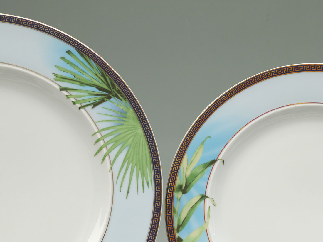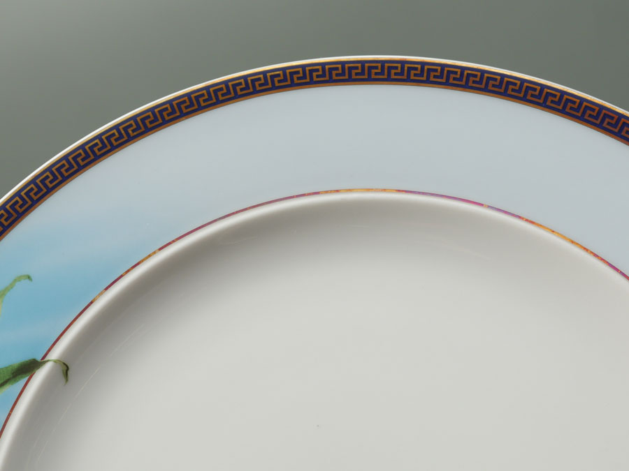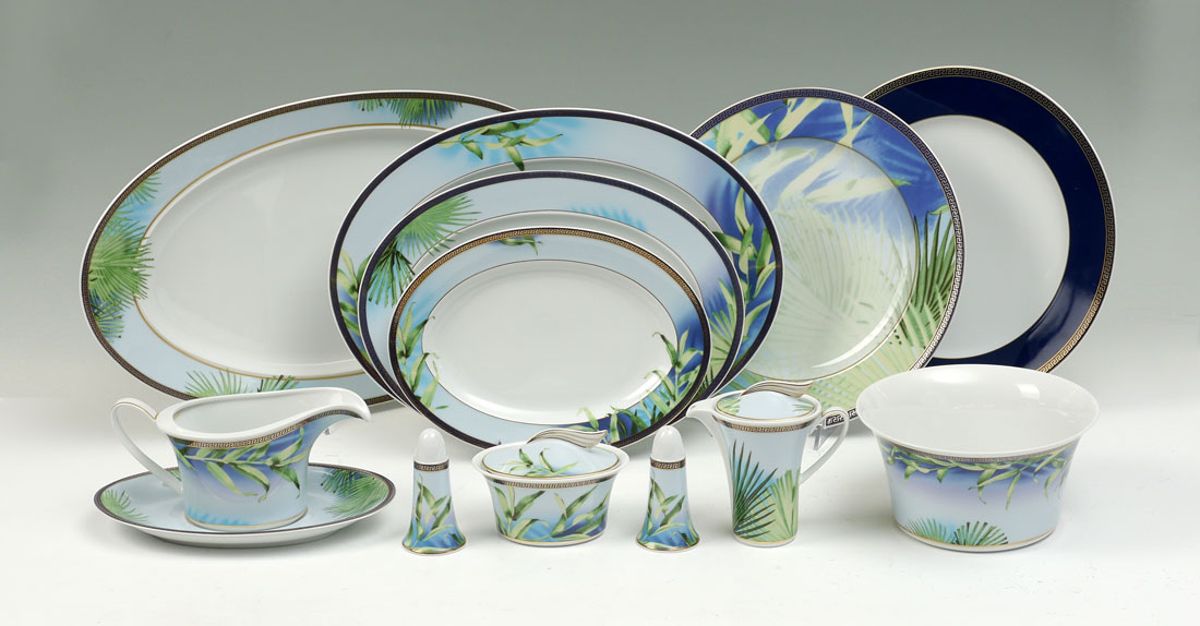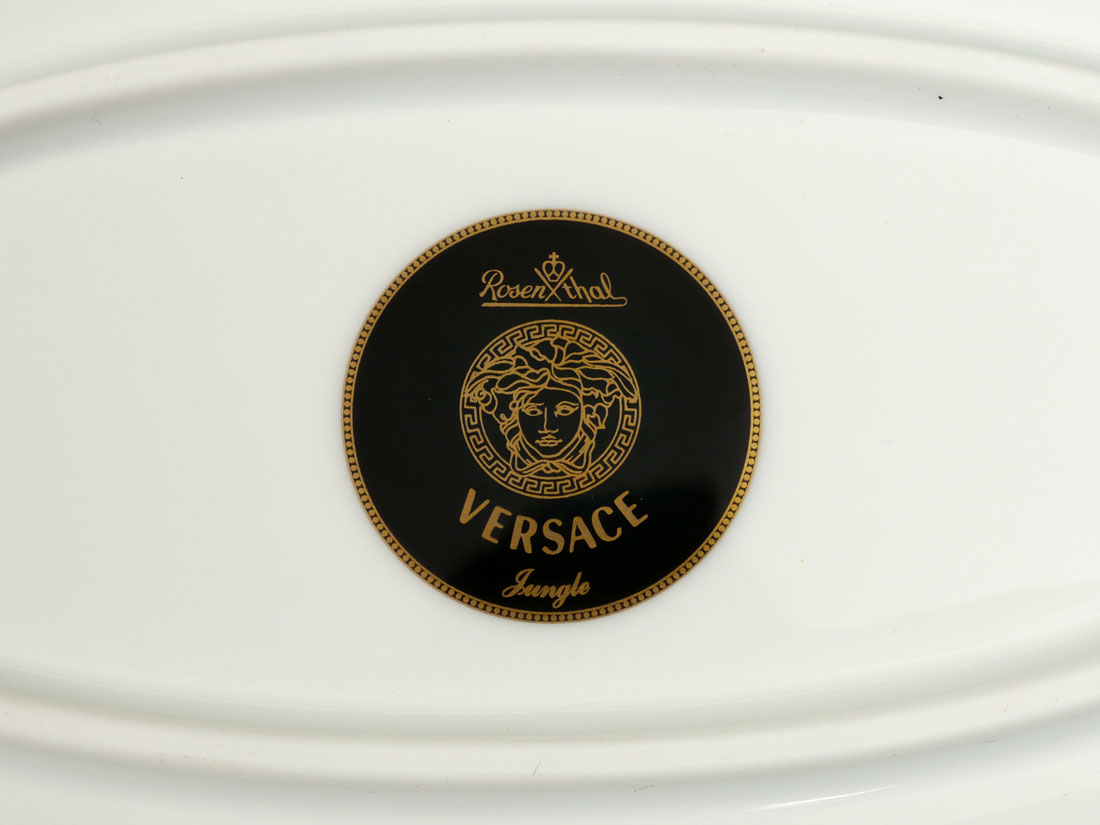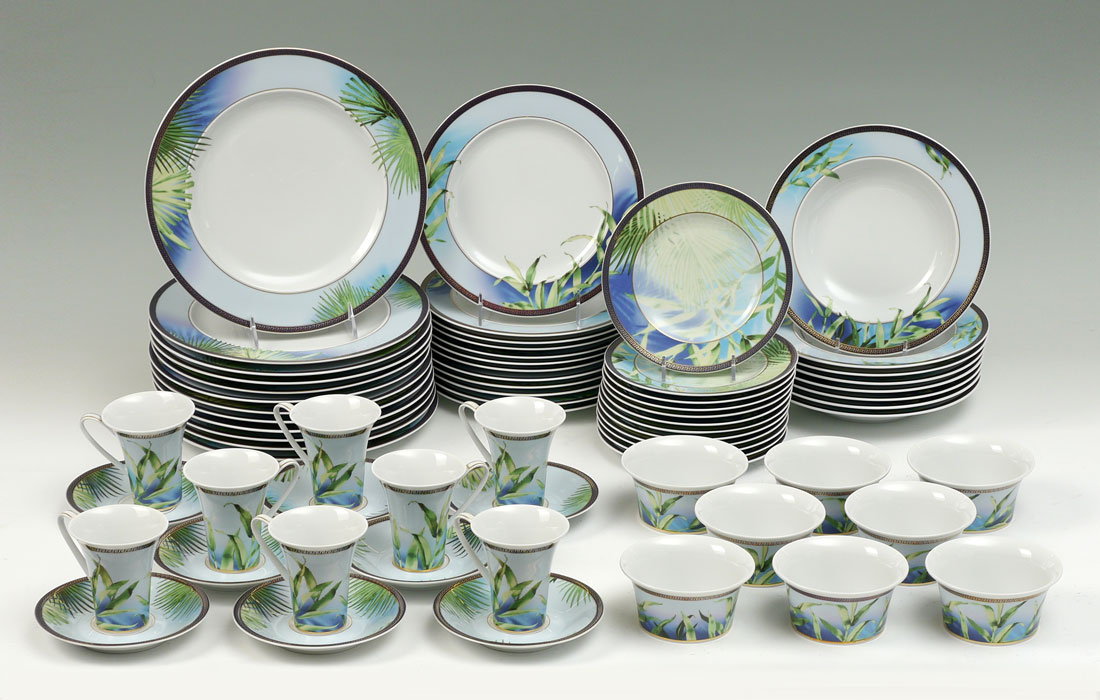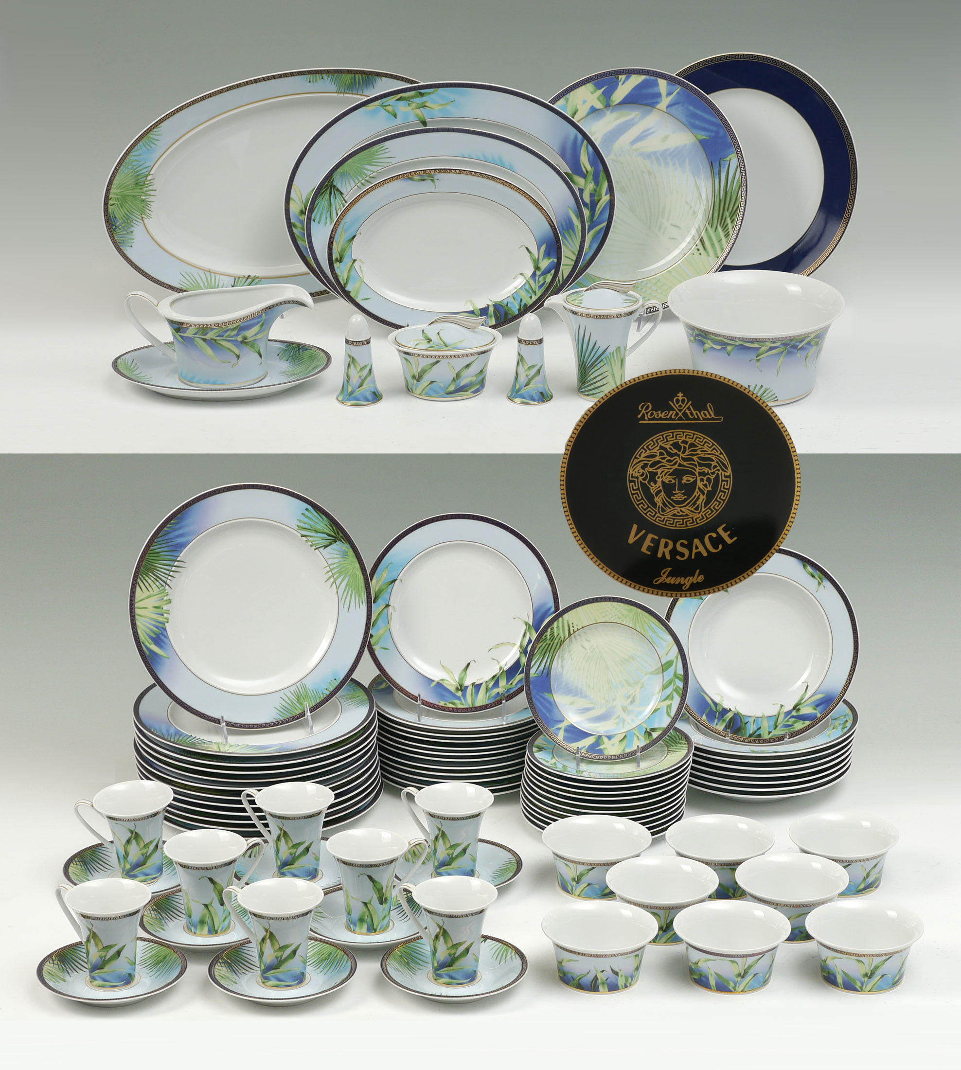 VERSACE JUNGLE PATTERN CHINA SERVICE 8 WITH EXTRAS: From the Versace Collection by Rosenthal, approx. 80 pieces in the Jungle pattern to include 12 dinner plates (10 1/2''), 12 salad plates (8 7/8''), 12 bread plates (7 1/8''), 8 bowls (8 7/8''), 8 bowls (4 1/2''), 8 teacups and saucers, 2 chargers (One with foliate rim, the other with cobalt rim, 12''), fish serving platter (19 3/4'' x 11 1/2''), 3 graduated oval platters, gravy boat, covered creamer, covered sugar, open waste bowl, salt & pepper shakers.