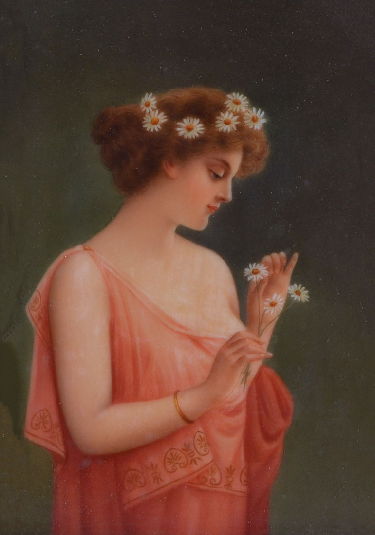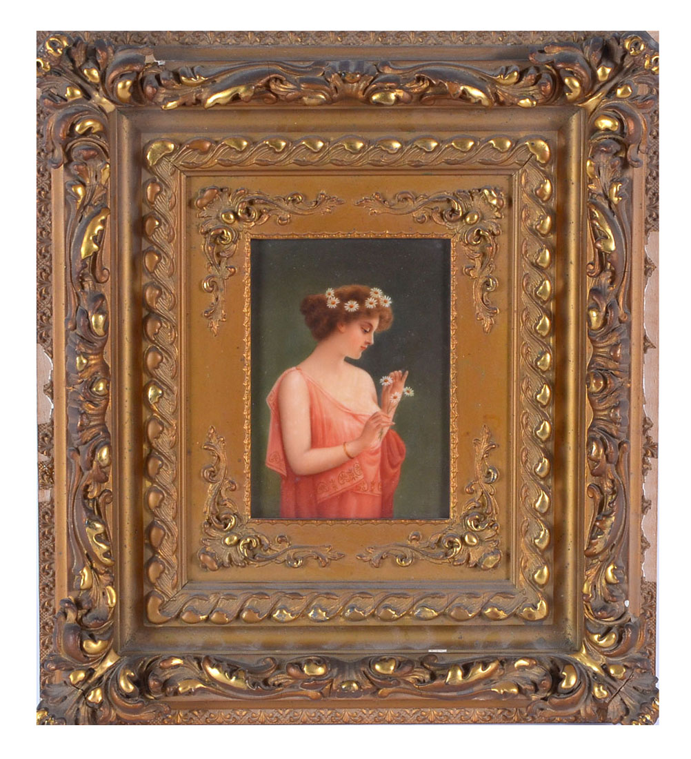 GERMAN MINIATURE PAINTING ON PORCELAIN ''MARGUERITE'': Signed Wagner lower left, 7.25'' x 5.25'', marked Germany verso, titled, framed, 16.5'' x 14.75''.