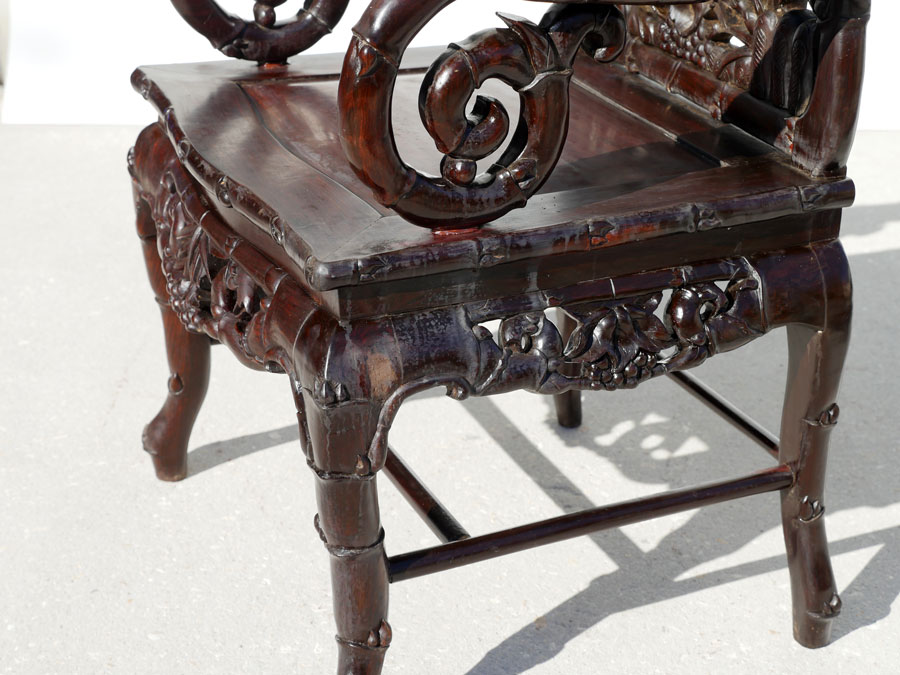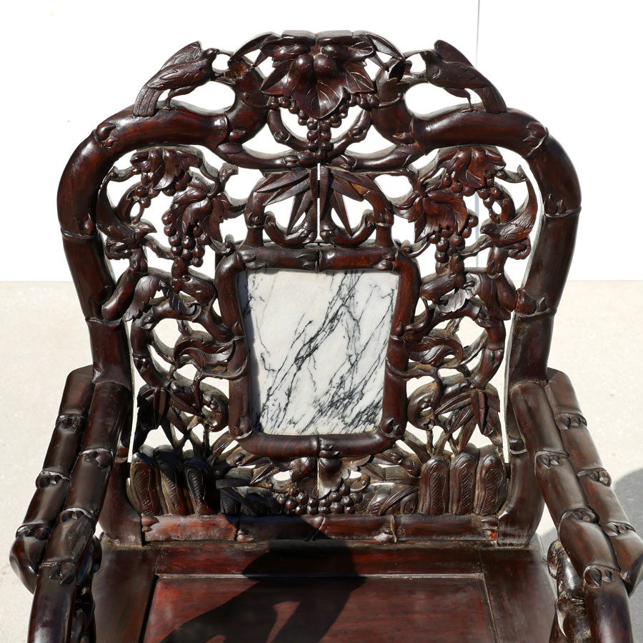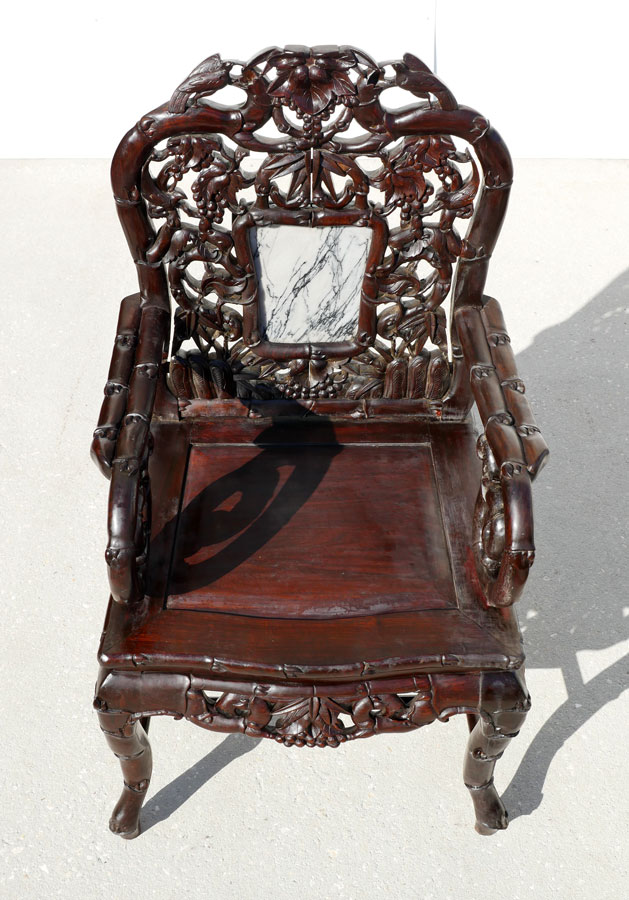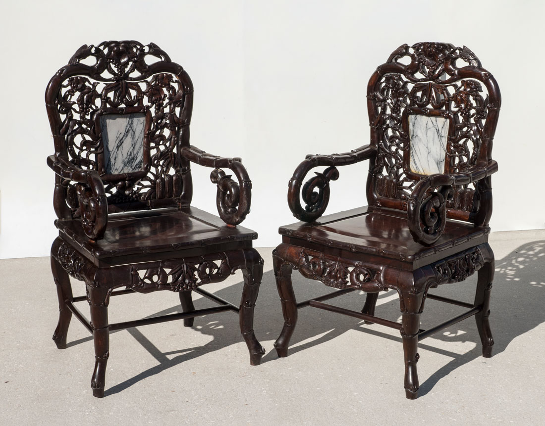 PAIR MARBLE INSERT CARVED ORIENTAL CHAIRS: Heavily pierced carved back with bird and foliate motifs, center inset marble panel, bamboo design arms, openwork skirt, carved legs. Overall measures 42 1/2'' h. x 22 1/2'' x 19 1/2''.