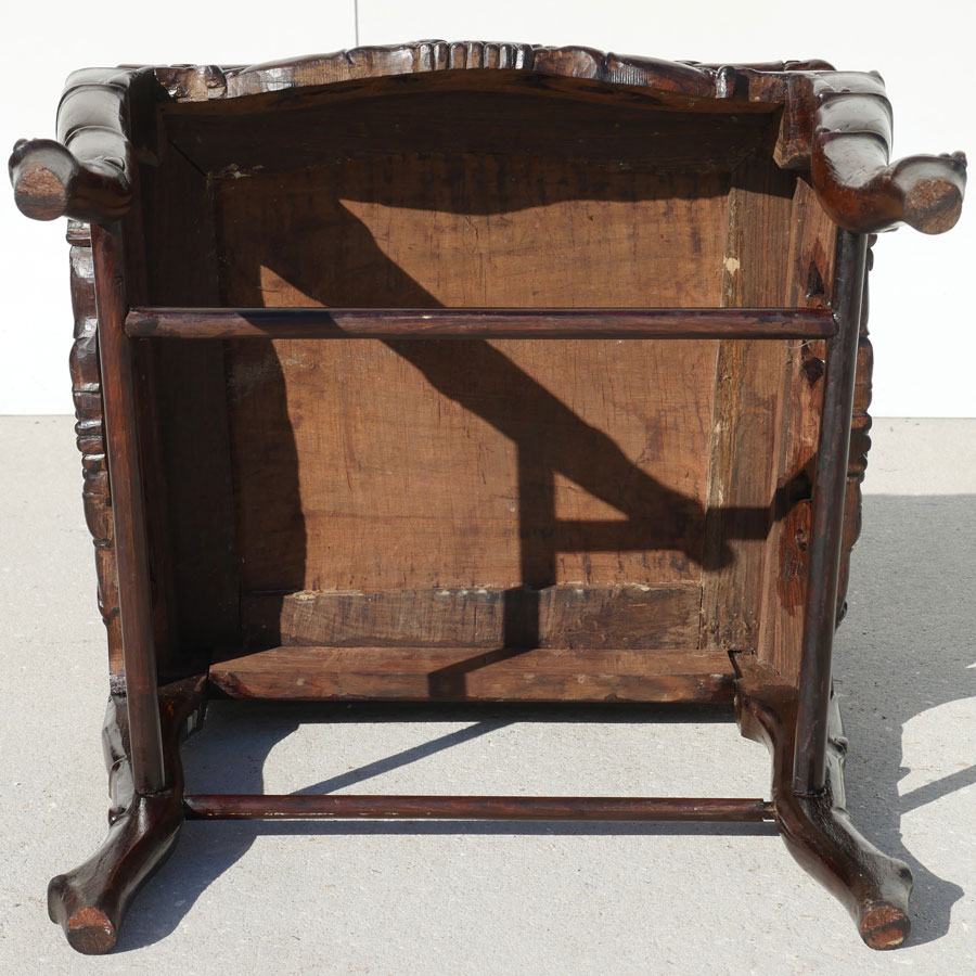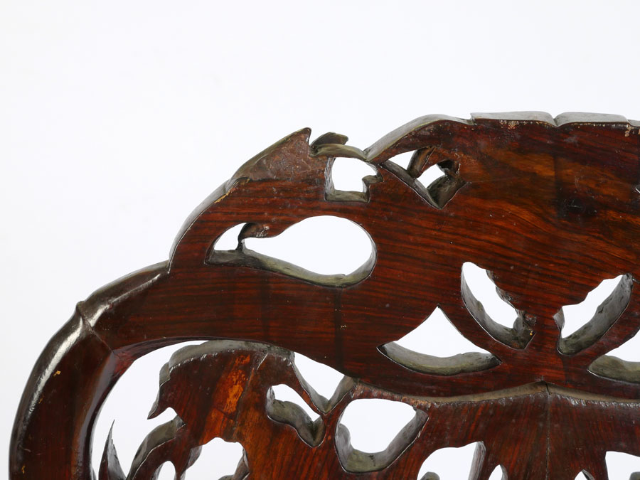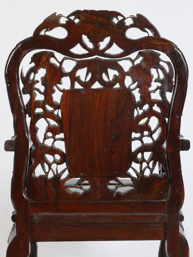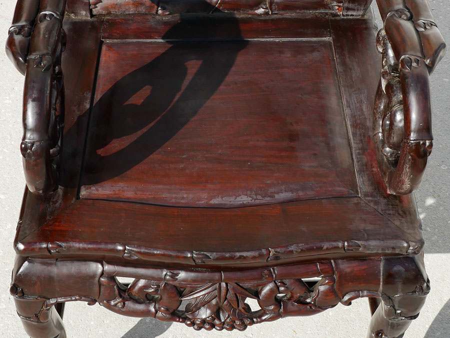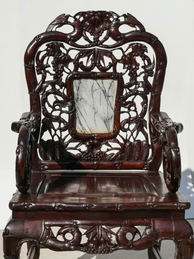 PAIR MARBLE INSERT CARVED ORIENTAL CHAIRS: Heavily pierced carved back with bird and foliate motifs, center inset marble panel, bamboo design arms, openwork skirt, carved legs. Overall measures 42 1/2'' h. x 22 1/2'' x 19 1/2''.