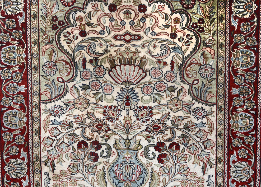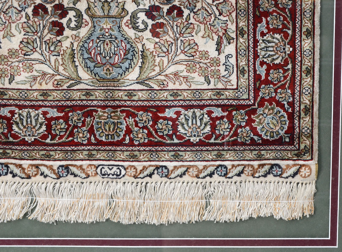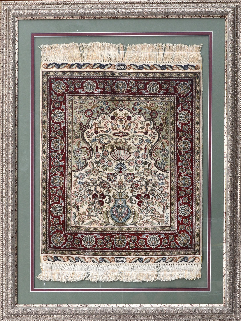 APPROX 30-50 YR OLD PERSIAN QUM FINELY KNOTTED SMALL FRAMED SILK RUG 20'' x 24'': Approx 30-50 yr old Persian Qum finely knotted small framed silk rug . This Qum is incredibly finely woven in an intricate classic prayer rug format. The white ground of the Mihrab or niche has a vase of flowers at the middle base of it with vines that have sprays of flowers and leaves that fill in around the central bouquet. Atop the bouquet is a fan like flower holding leaves and vines that create the look of a crown. Above that are vines, some forming a ''cloud band'' design. St the top and sides of the niche the field is pale green, filled with flowers and vines. There are pale green guard borders and a deep red main border that picks up on the red flowers in the field. Each end has an extra border design woven in silk and gold thread in a raised pattern on a flat background. This and the signature cartouche are extra details that speaks to the quality of this gem of a rug. Framed measures 39 1/2'' x 30 1/4''