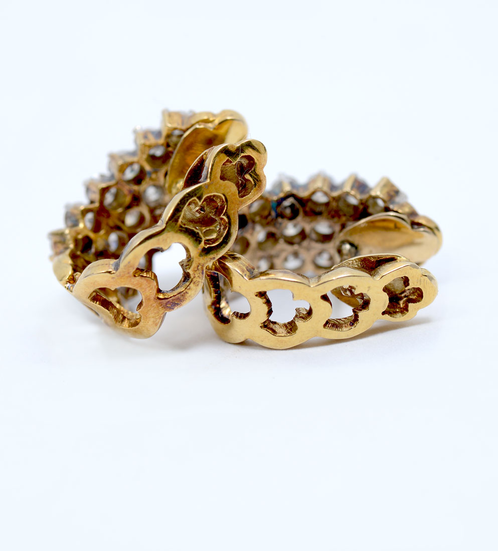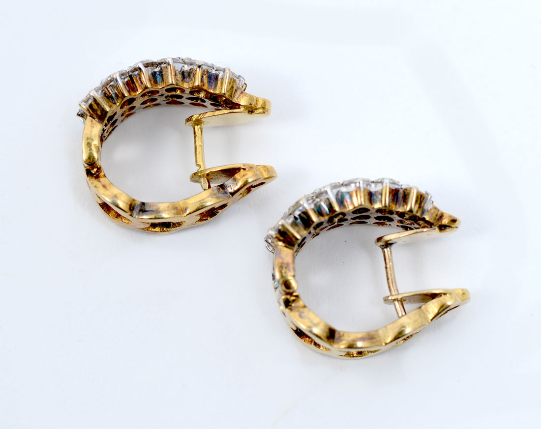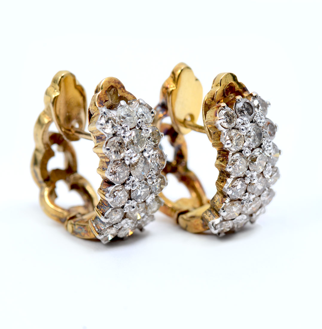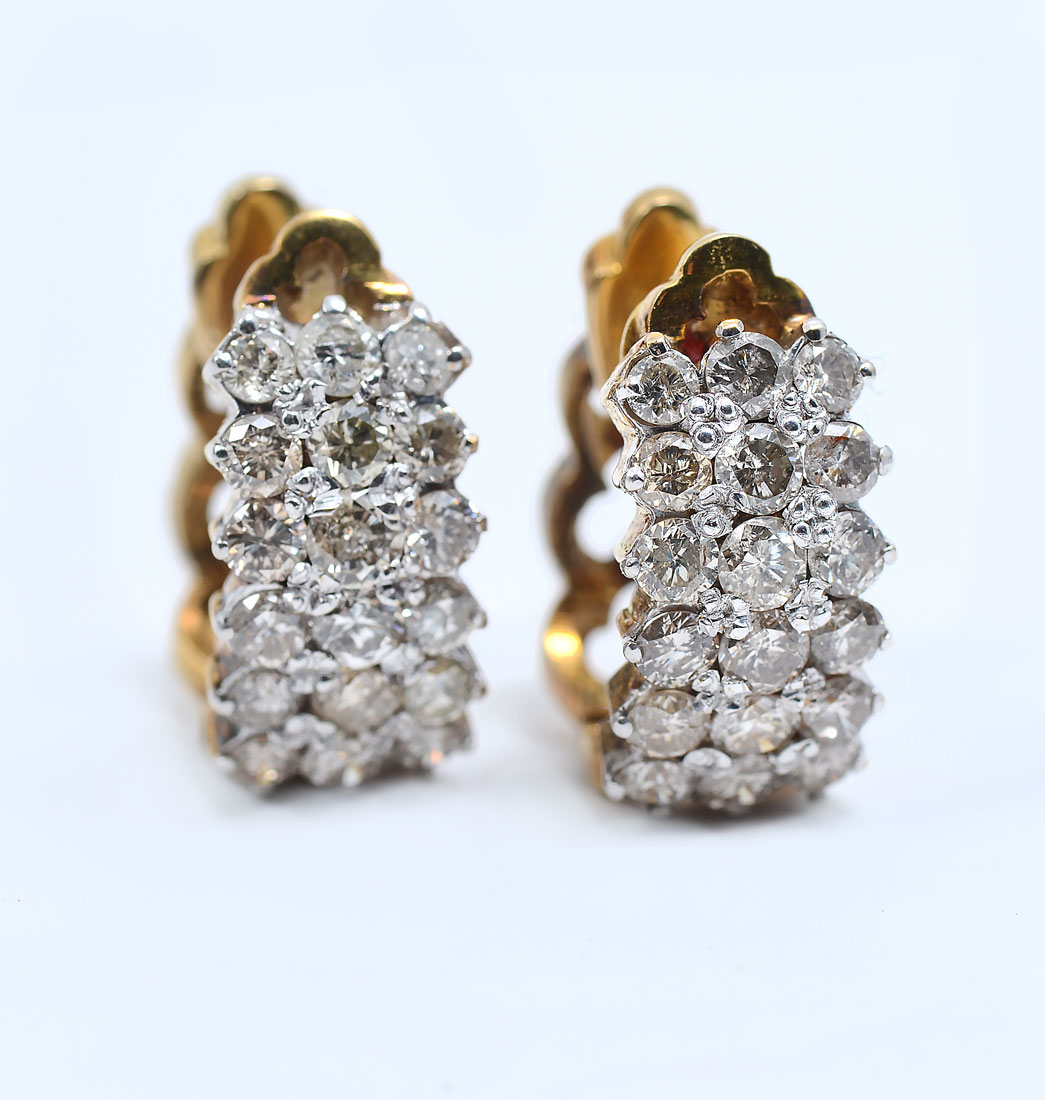 18K 2.00 CTW DIAMOND EARRINGS: 18K yellow gold earrings contain 36 round brilliant cut diamonds. WEIGHT: 2.00 Ct. Approx. Rated SI-I1 in clarity and H-I in color. The diamonds are prong set. Post and hinged clip closures. Weight: 8.6 grams.