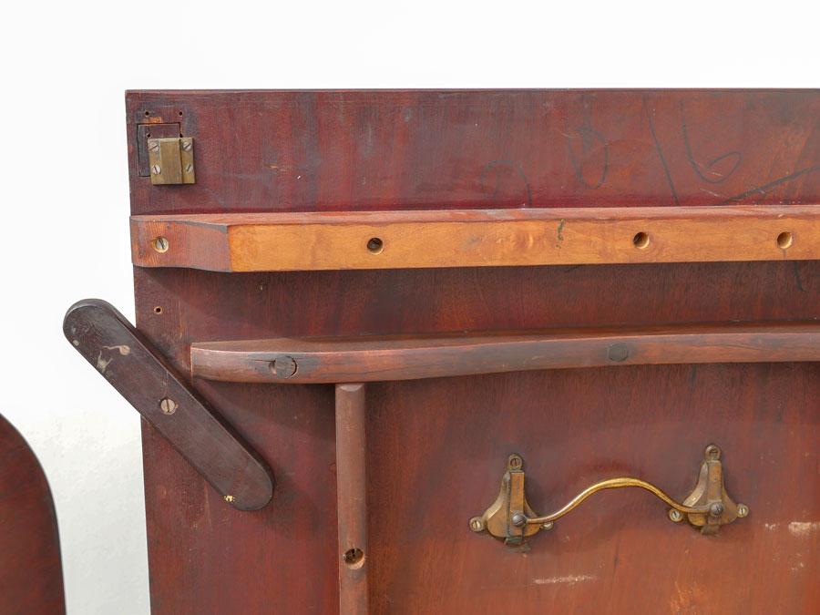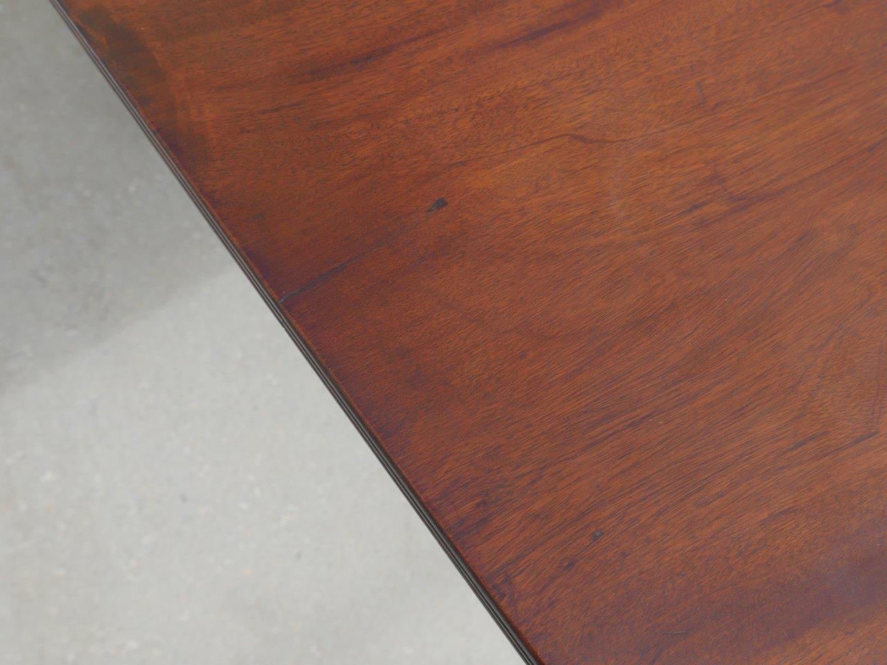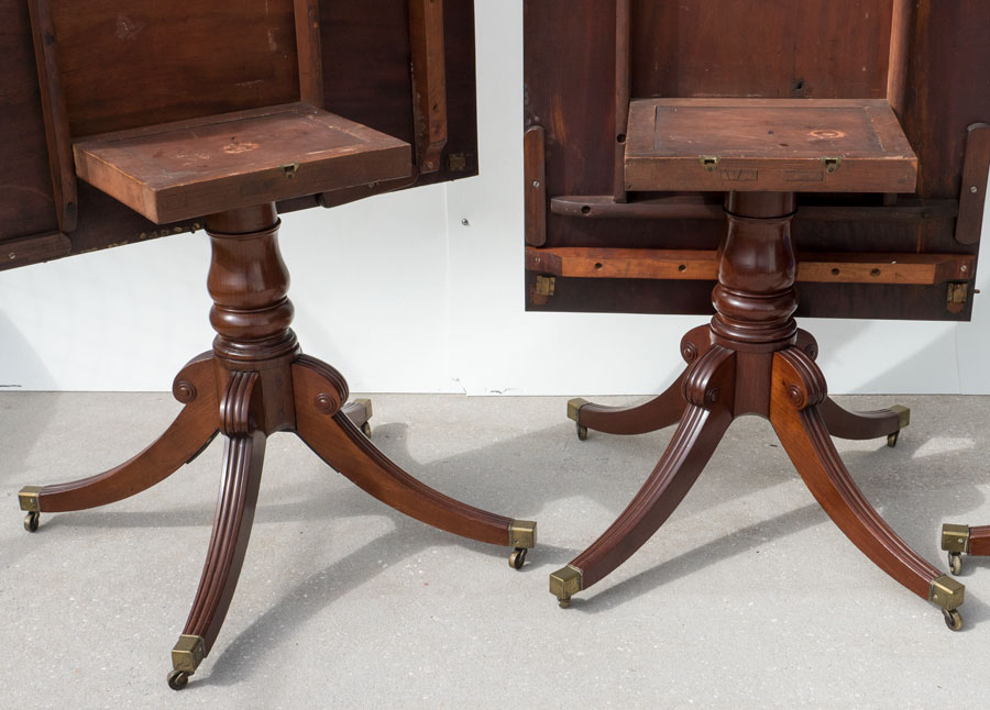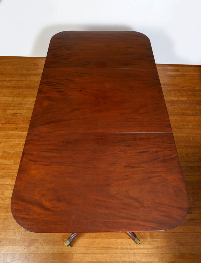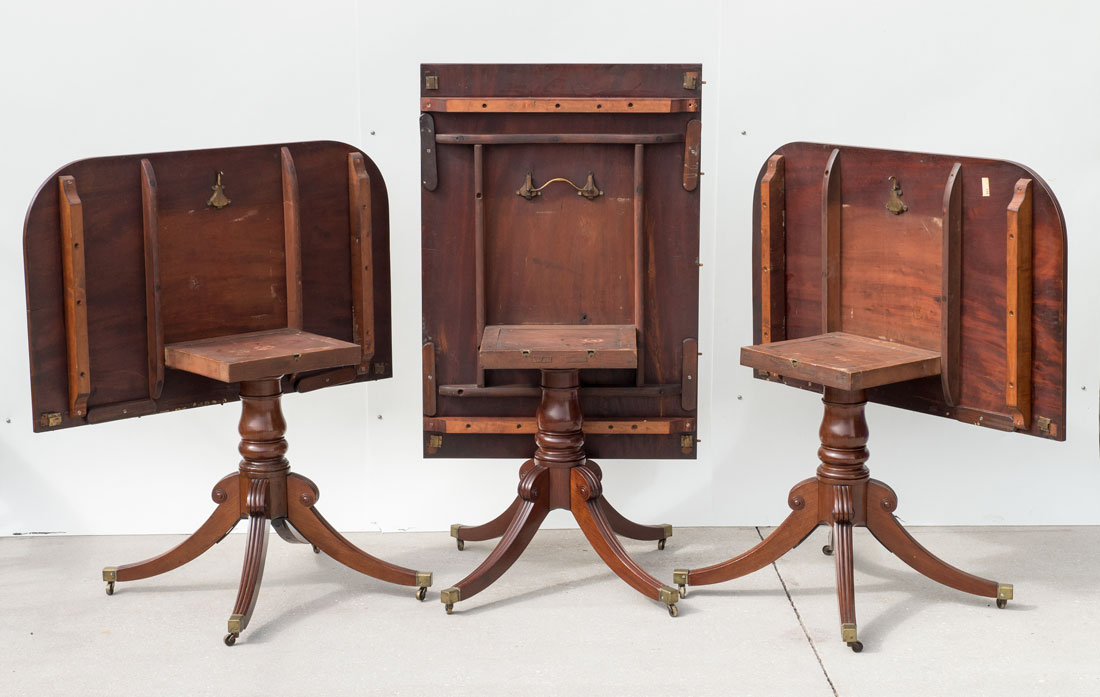 19TH CENTURY 3 PEDESTAL DOUBLE D END DINING TABLE: Mahogany dining table in 3 sections, each section with pedestal base and 4 splayed legs ending in castors. Each section is a tilt top. Overall measures 29'' h. x 88 1/2'' x 46''.
