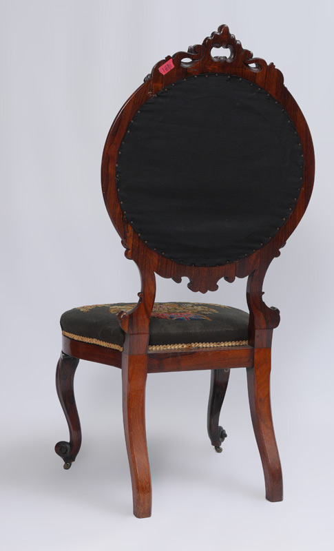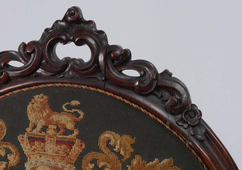 ENGLISH VICTORIAN NEEDLEPOINT SIDE CHAIR: Decidedly British with round back with carved crest and supports. Shaped skirt and legs with carved front legs ending in castors. Needlepoint upholstered with back bearing the Royal Coat of Arms and motto, seat with Union Jack flag, floral and thistle motif. Overall measures 44 1/2'' h. x 20 1/2'' x 21 1/2''.