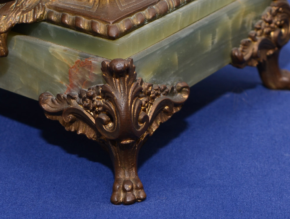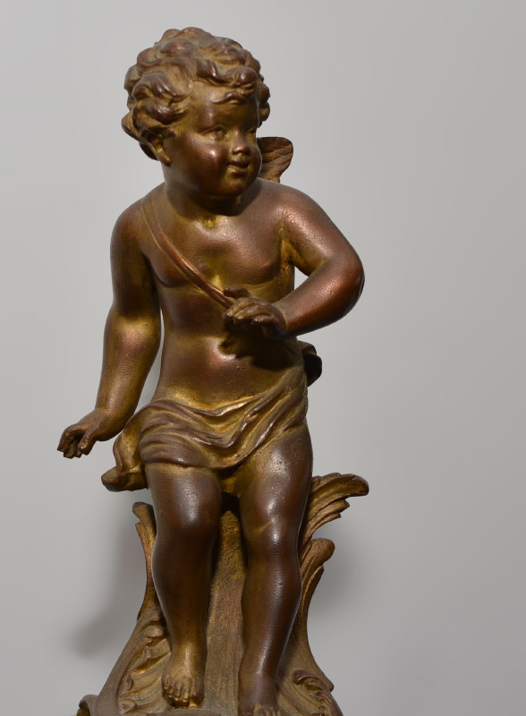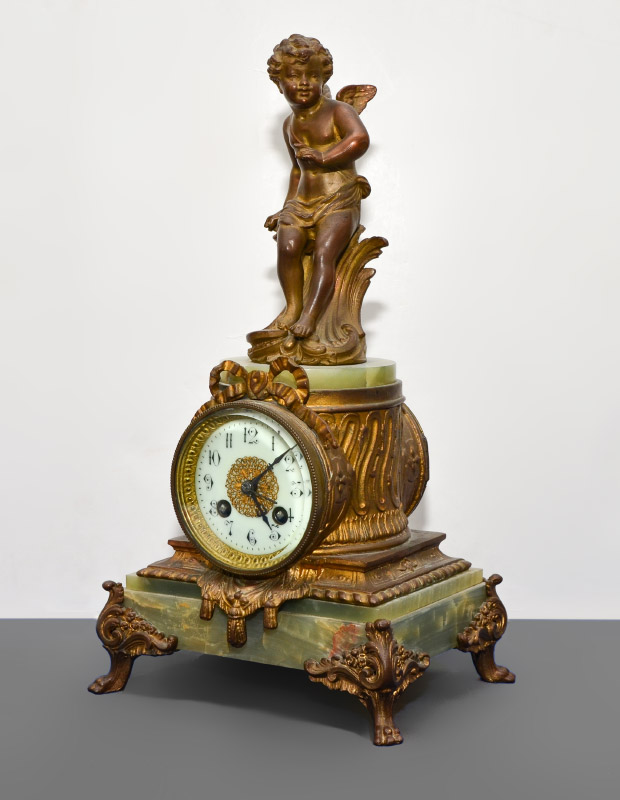 FIGURAL CHERUB AND ONYX FRENCH MANTLE CLOCK: Gilt spelter figural cherub finial, body and legs with onyx accent and base. Porcelain dial with Arabic numerals, French marked time & strike movement with Harris & Harrington importers stamp. Overall measures 15'' h. x 8 1/4'' x 6 1/2''.