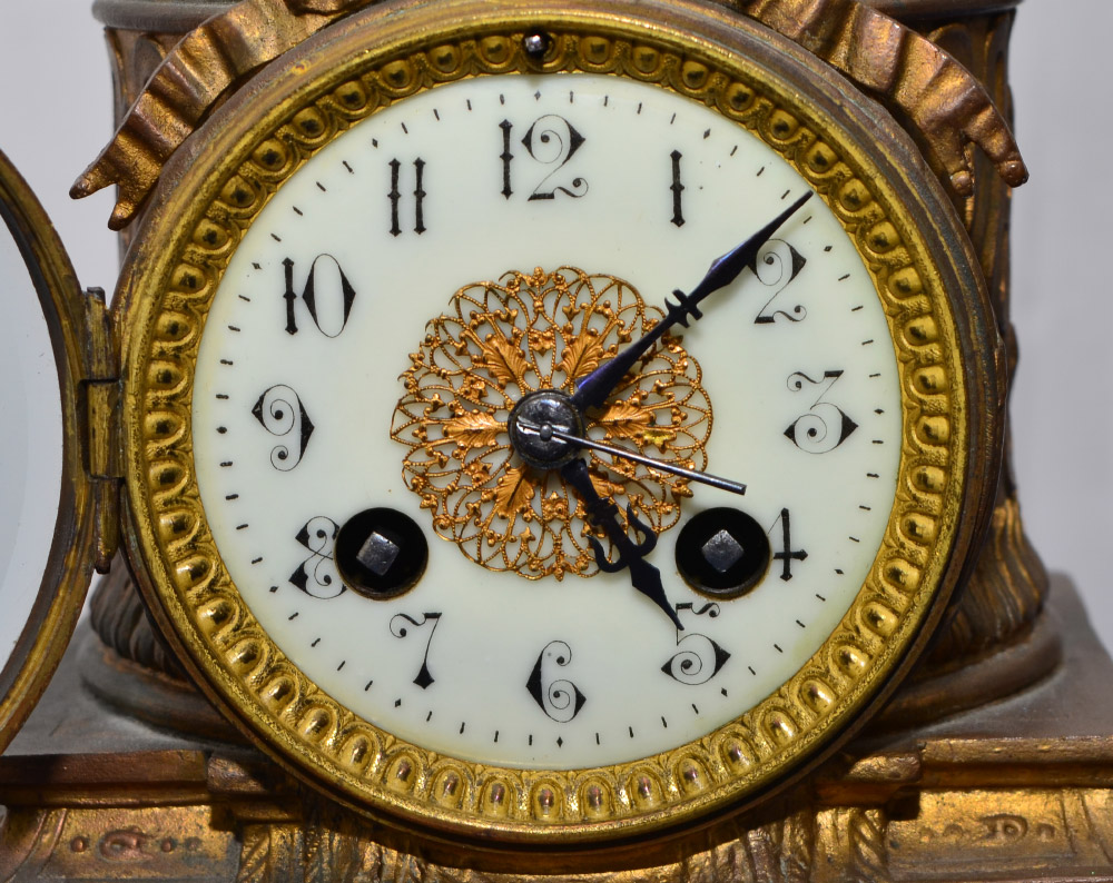 CONDITION: Uneven finish to gilt, currently running however not guaranteed to continue. Pendulum in office.