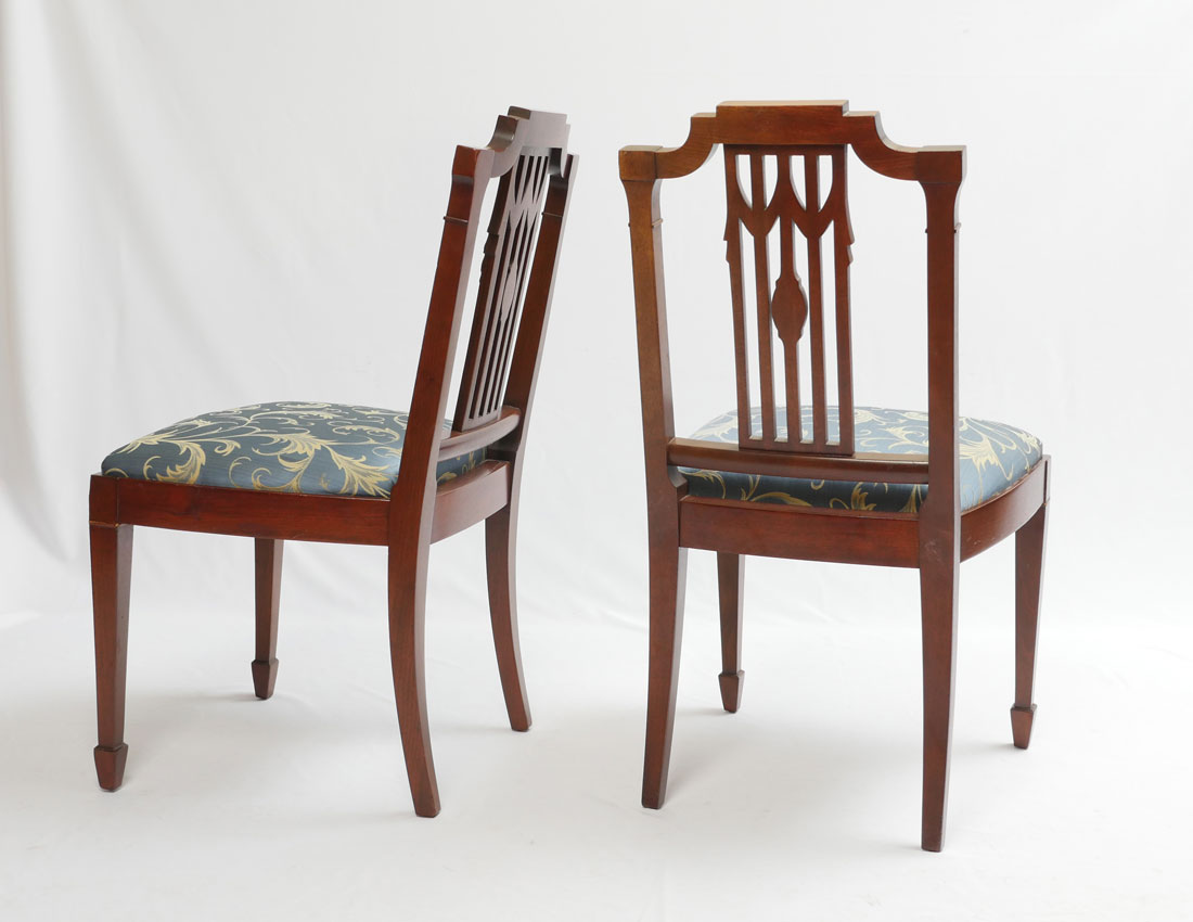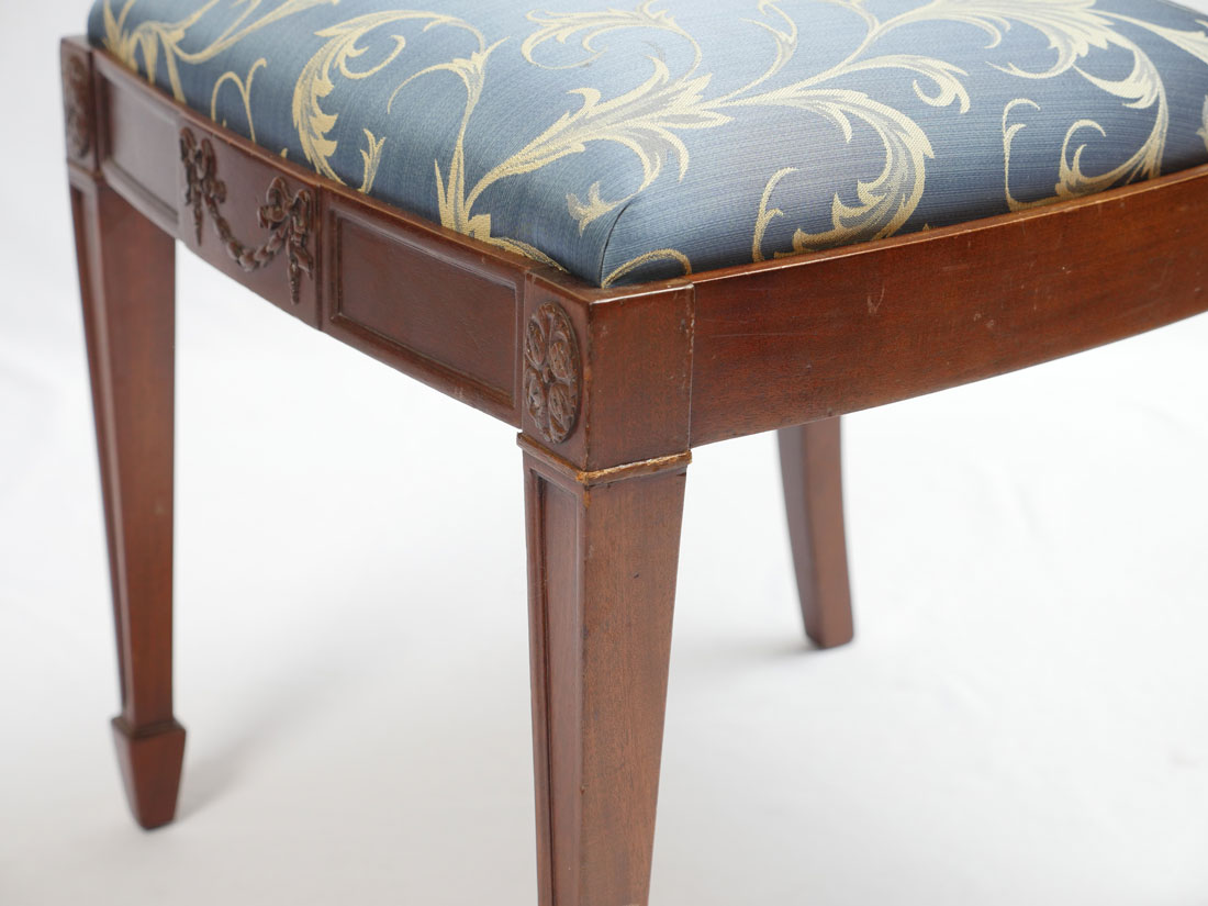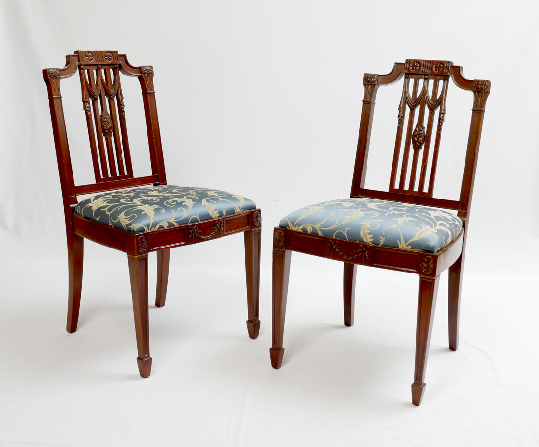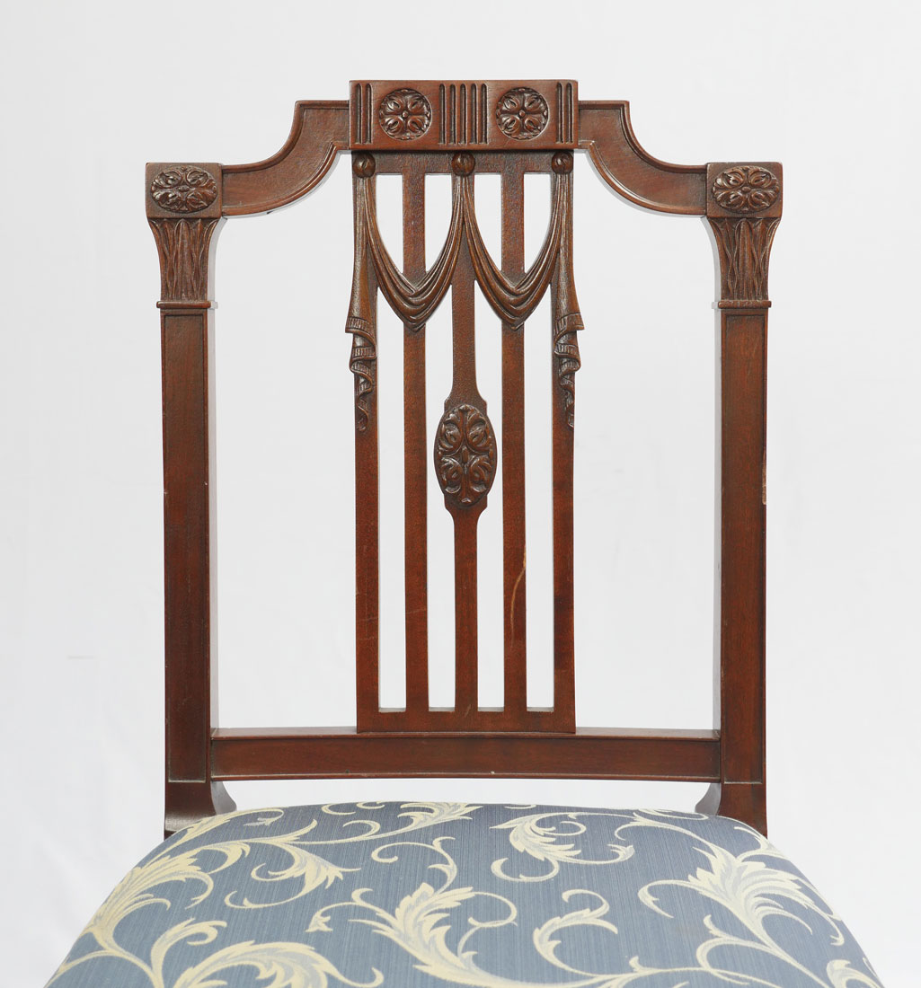 CARVED ROUND MAHOGANY DINING TABLE AND 10 CHAIRS: Table with round top, fluted skirt with carved floral swags, base on 4 shaped legs and castors measures 30'' h. x 60'' dia., the 5 leaves measures 11''. Sold with 10 dining chairs with openwork carved backs, blue and ivory foliates scroll cushions, the single arm chair measures 36 1/2'' h. x 21 1/2'' x 22 1/2''.