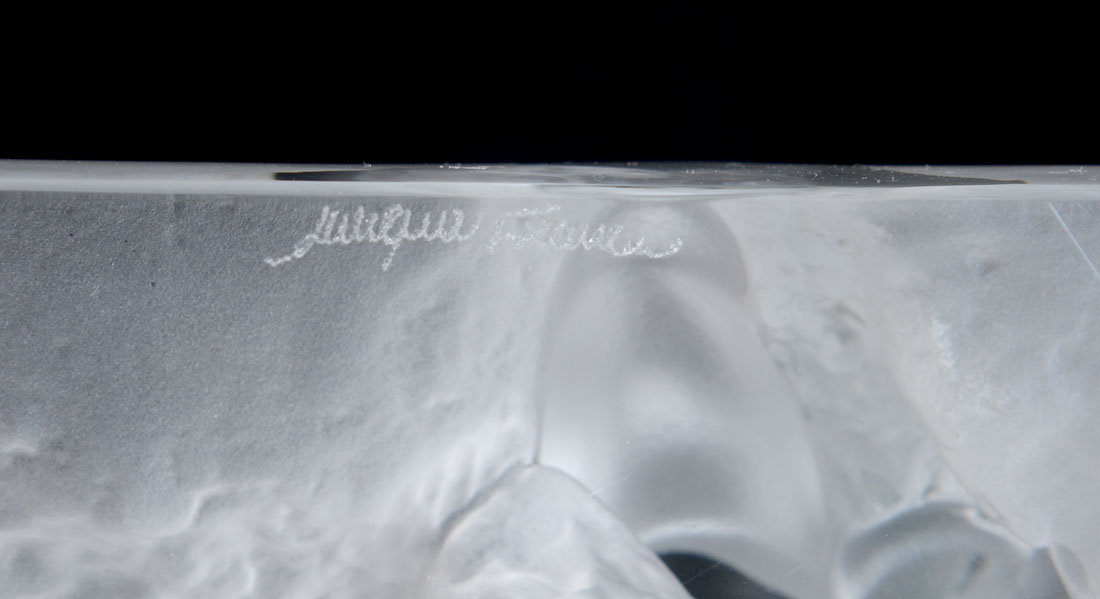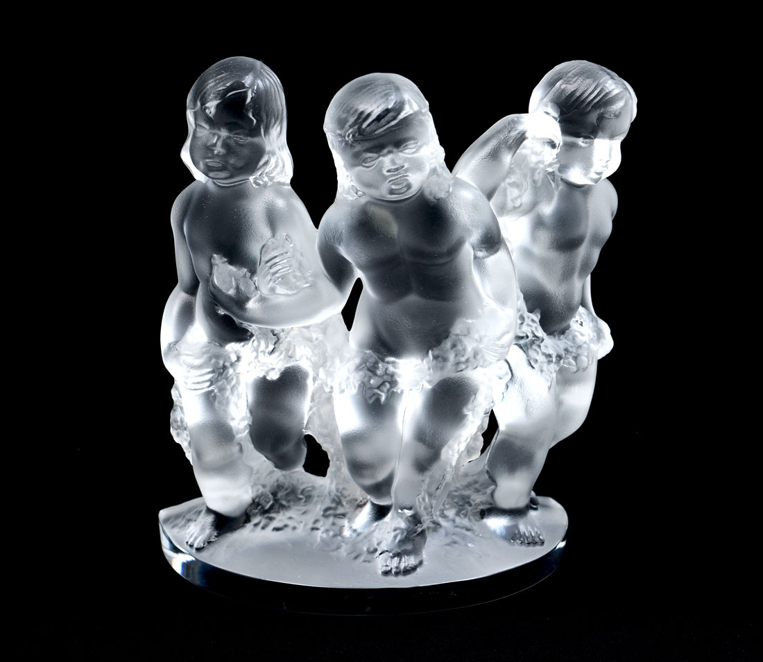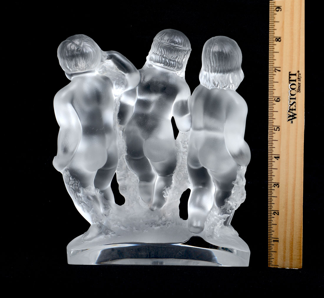 LALIQUE CRYSTAL LUXEMBOURG FIGURAL GROUP: Frosted molded figural group of 3 putti children, signed on clear base, overall 8'' h. x 6 1/2'' x 3 1/4''.