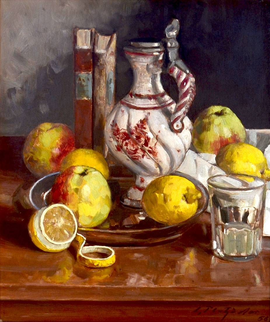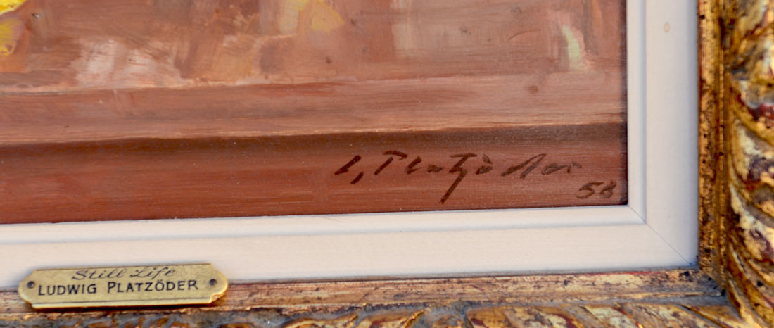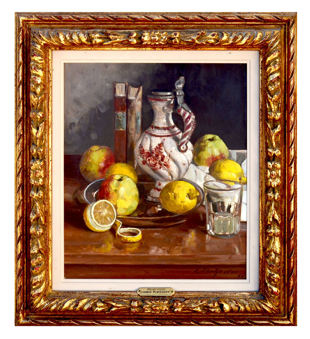 PLATZODER, Ludwig, (German, 1898-1976): ''Still Life with Fruit, Books and Ewer'', Oil/Masonite, sight size is 15.50'' x 13'', singed lower right and dated '58, carved frame is 22'' x 19.75''.