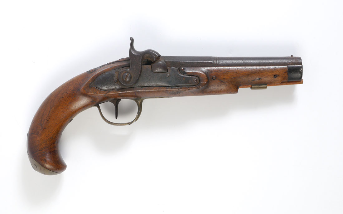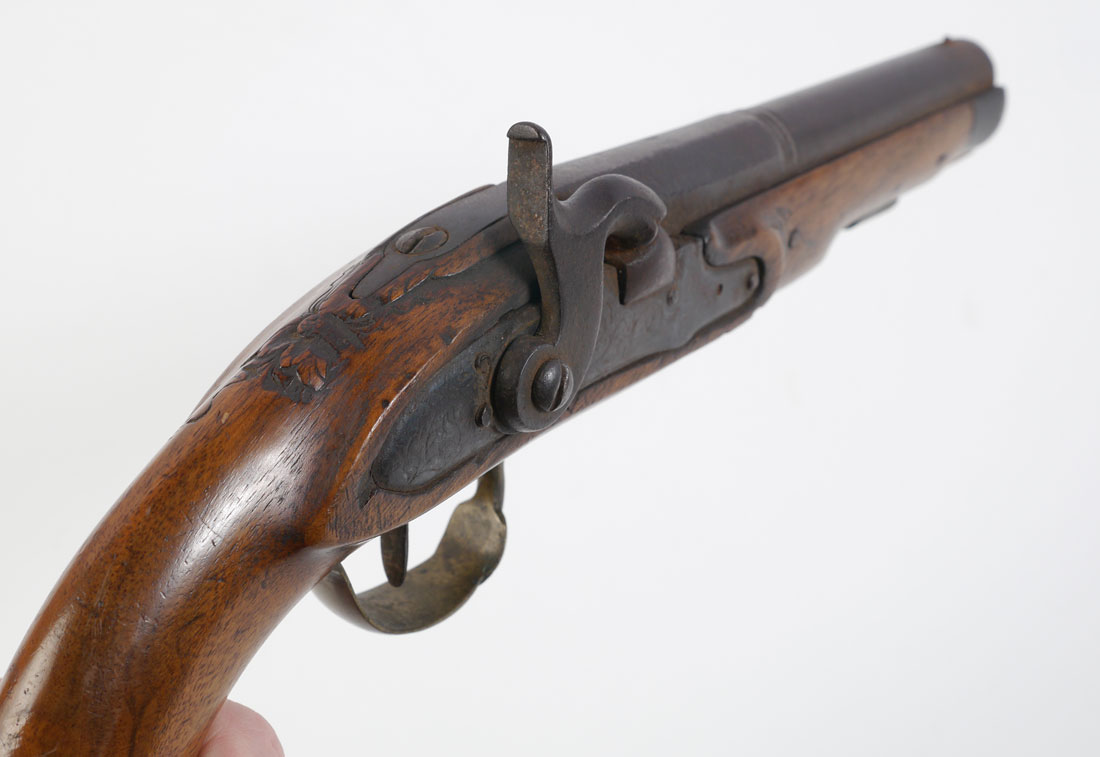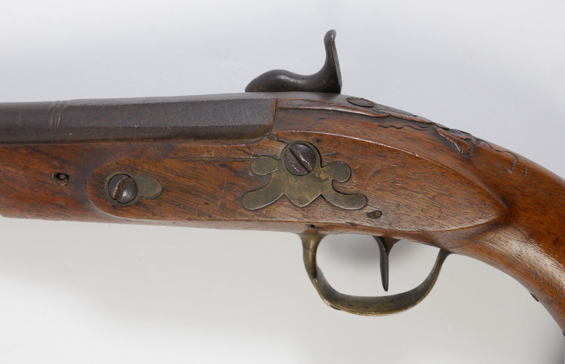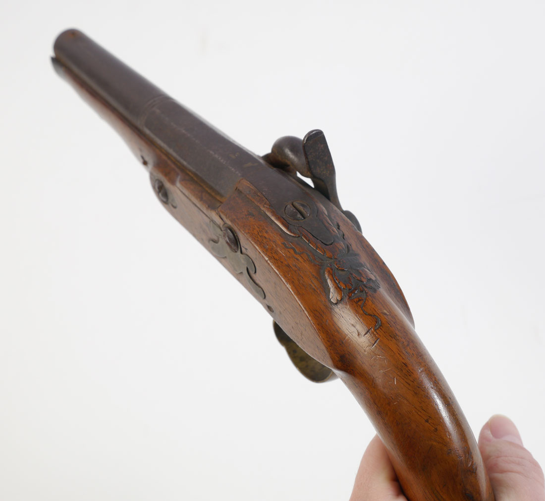 CIRCA 1830'S PERCUSSION BELT PISTOL: Most likely European, 6 3/4'' half octagonal, half round approx. .65 caliber barrel, walnut stock with carving at tang, floral engraved lockplate, brass furniture. Action currently functions, overall 12 1/4'' long.