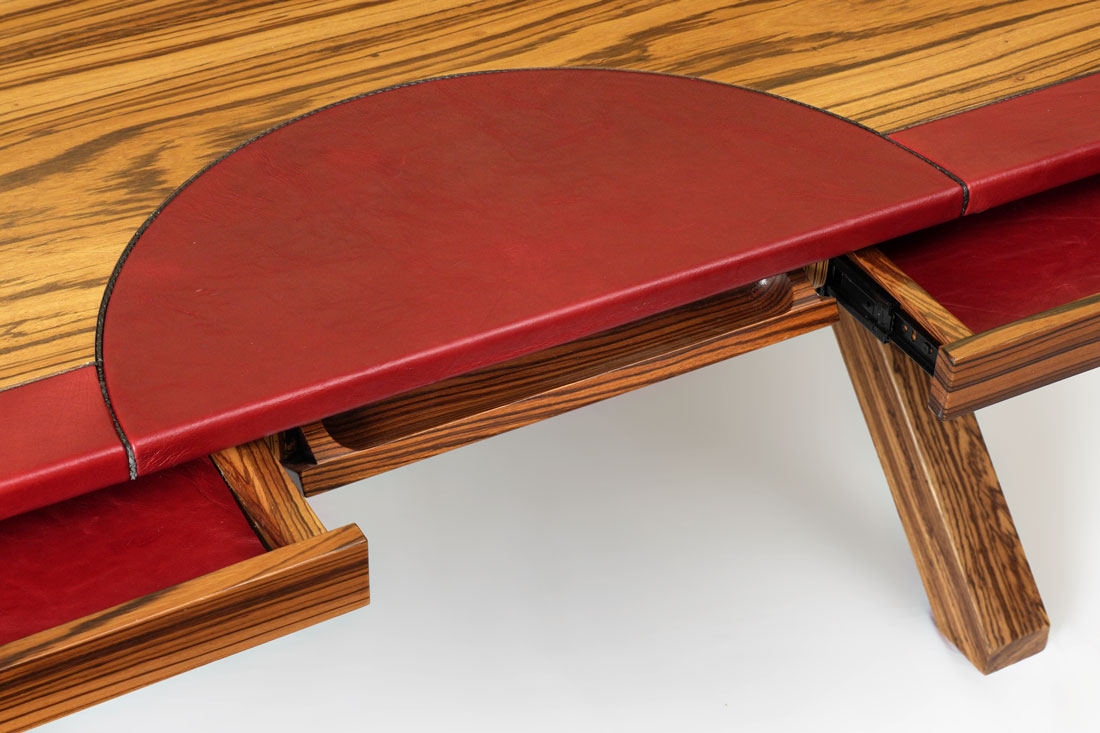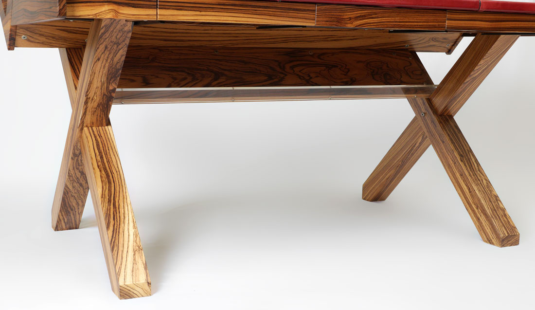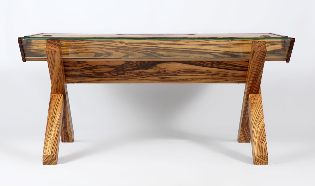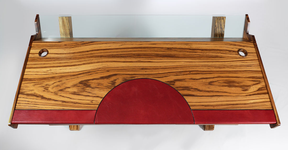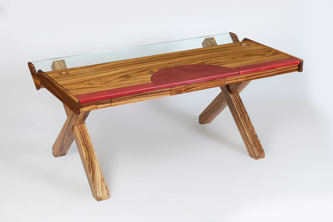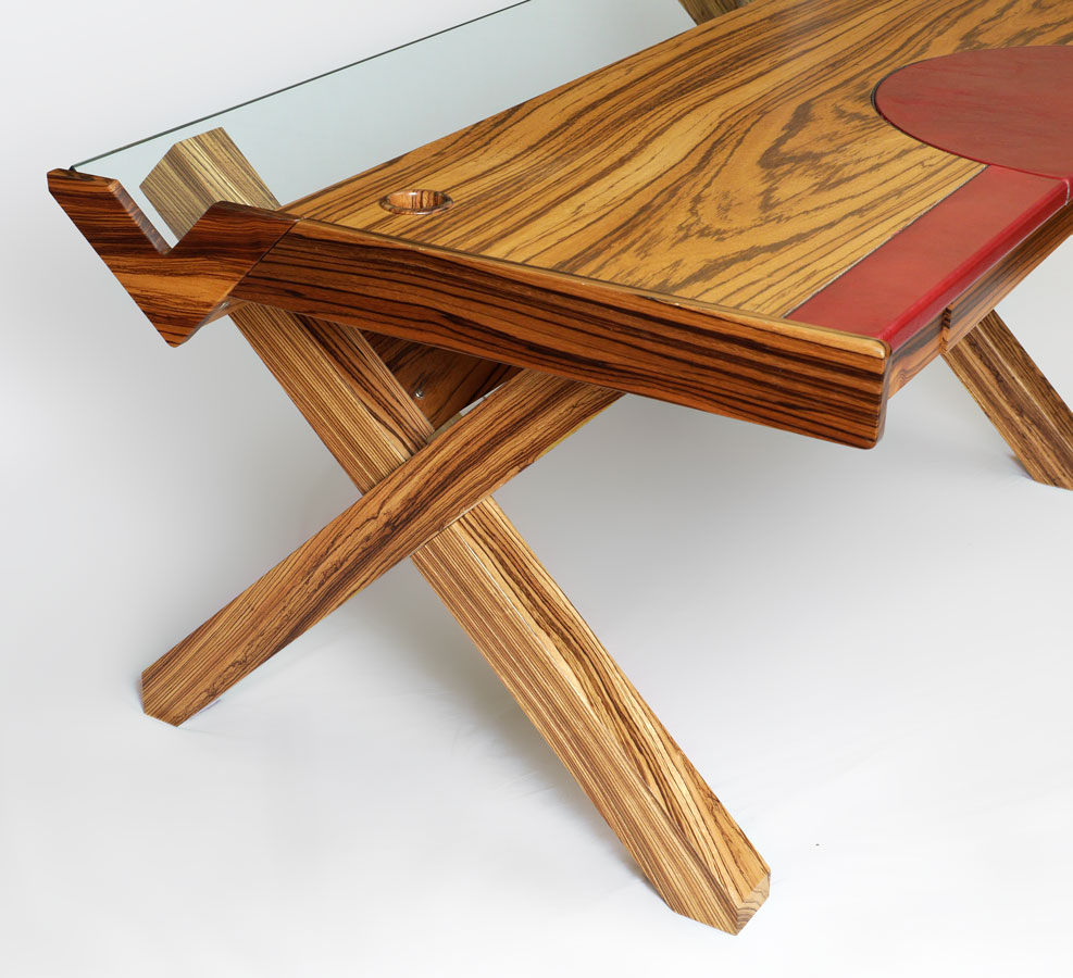 CONTEMPORARY ZEBRAWOOD AND LEATHER EXECUTIVE DESK: A true statement desk, zebra wood with applied red leather to top, a most unique diagonal back shelf with thick glass, acrylic shelf underneath, ''X'' frame legs, no visible makers name or label. 29 1/2'' h. x 64 1/2'' x 36''.