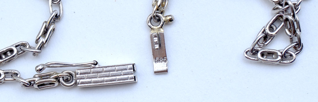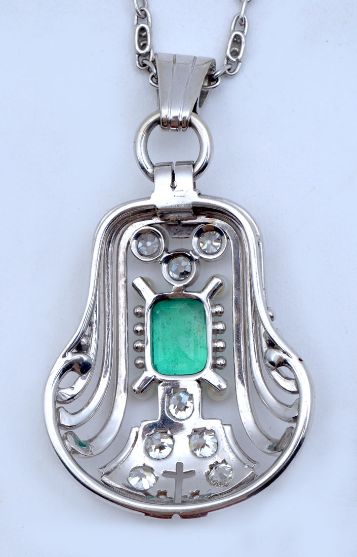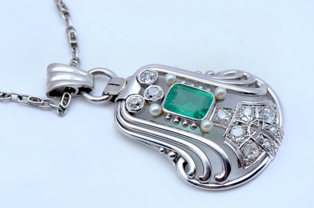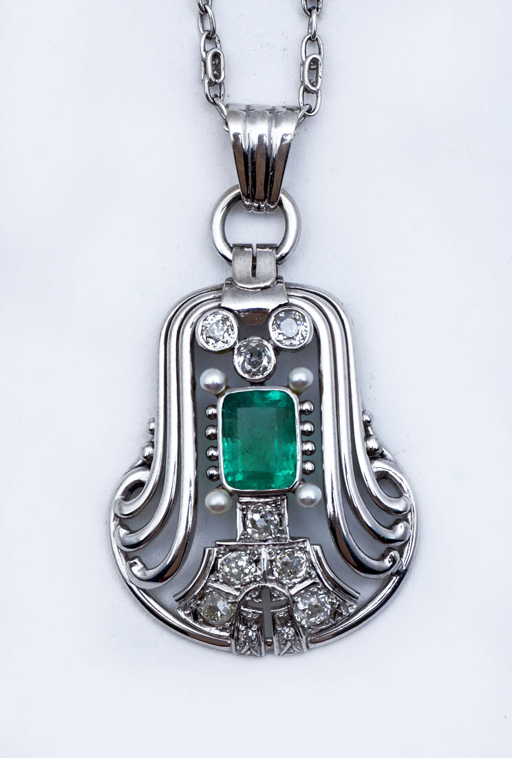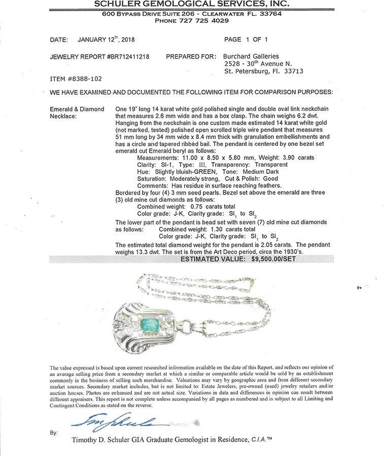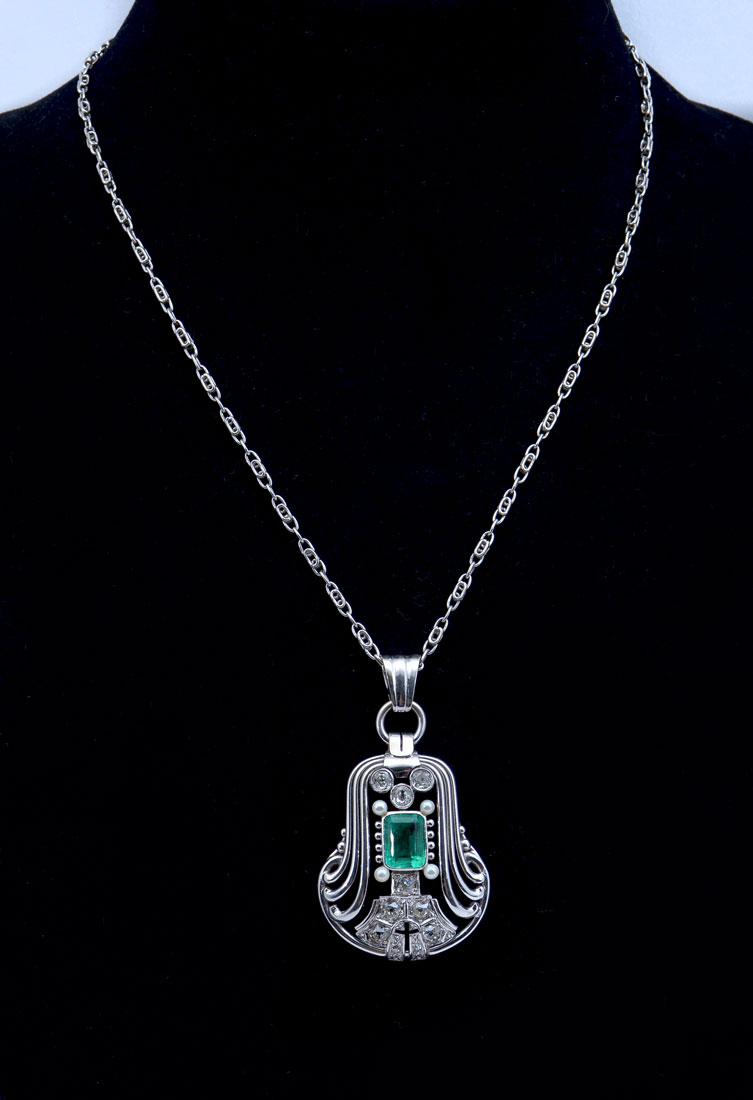 14K ART DECO EMERALD & DIAMOND NECKLACE: Circa 1930's this 19'' 14K white gold chain features a beautiful custom design with 3.90 CT emerald SI-1 clarity (abraded and scratched). The emerald is bordered by 4 seed pearls, 5 old mine cut diamonds at 1.25 carat total weight, J-K Color, SI-1 to SI-2 clarity and 2 old mine cut diamonds at 0.05 carat total weight. Custom design matches 1127 & 1127b. Consignor believes that her grandfather had the suite designed for her grandmother in Germany. Weight approx 30.2 grams. Sold with current Schuler Gemological Services appraisal for $9,500.