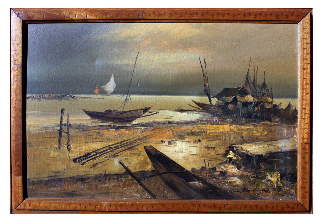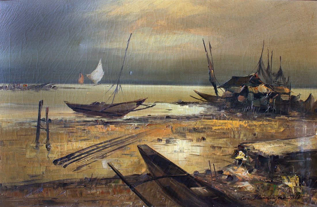 BUENAVENTURA, Cesar, (Filipino, 1922-1983): Riverside Landscape with Boats, Oil/Canvas, 24'' x 36'', signed lower right and dated 1972, framed, 28'' x 40''.