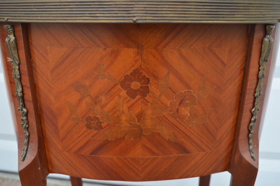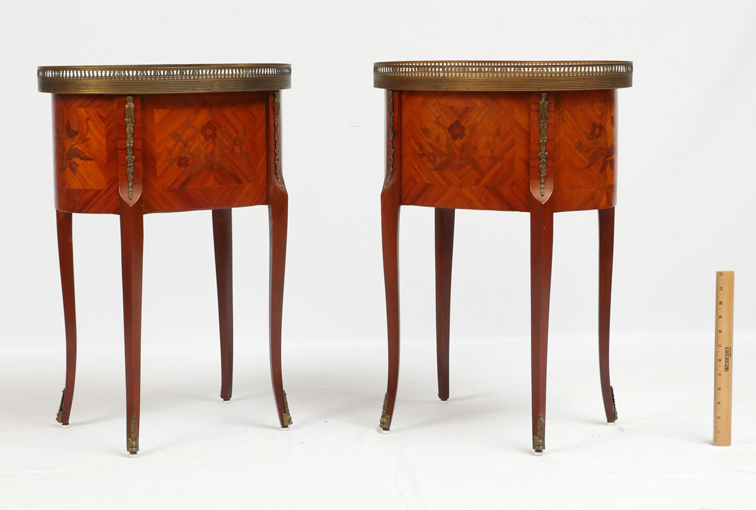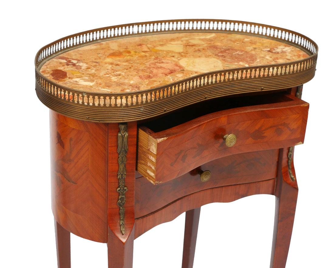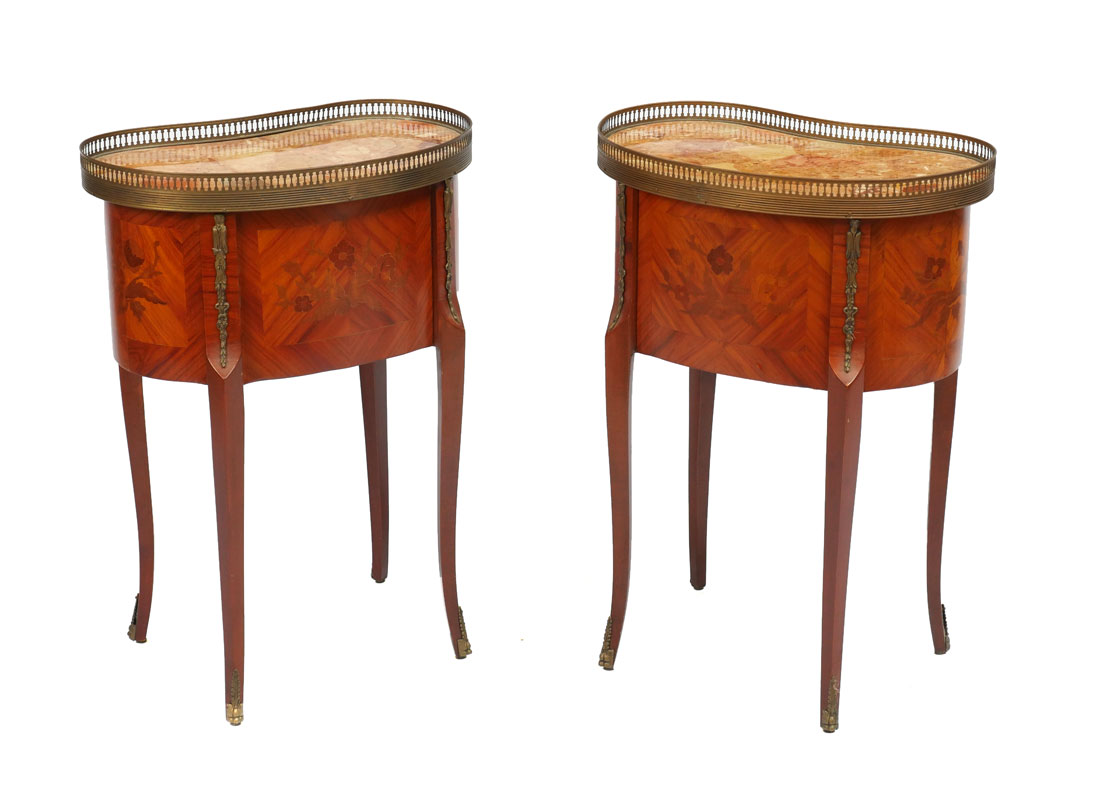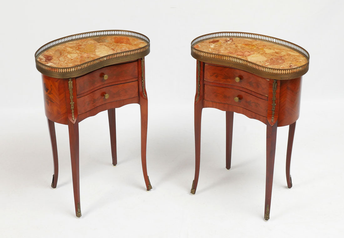 PAIR KIDNEY SHAPED MARBLE TOP END TABLES: Matched pair, pierced brass gallery, shaped marble top, 2 drawers, floral design marquetry inlay, shaped legs, applied gold decorated metal decoration. 26 1/2'' h. x 18 3/4'' x 11 1/2''.