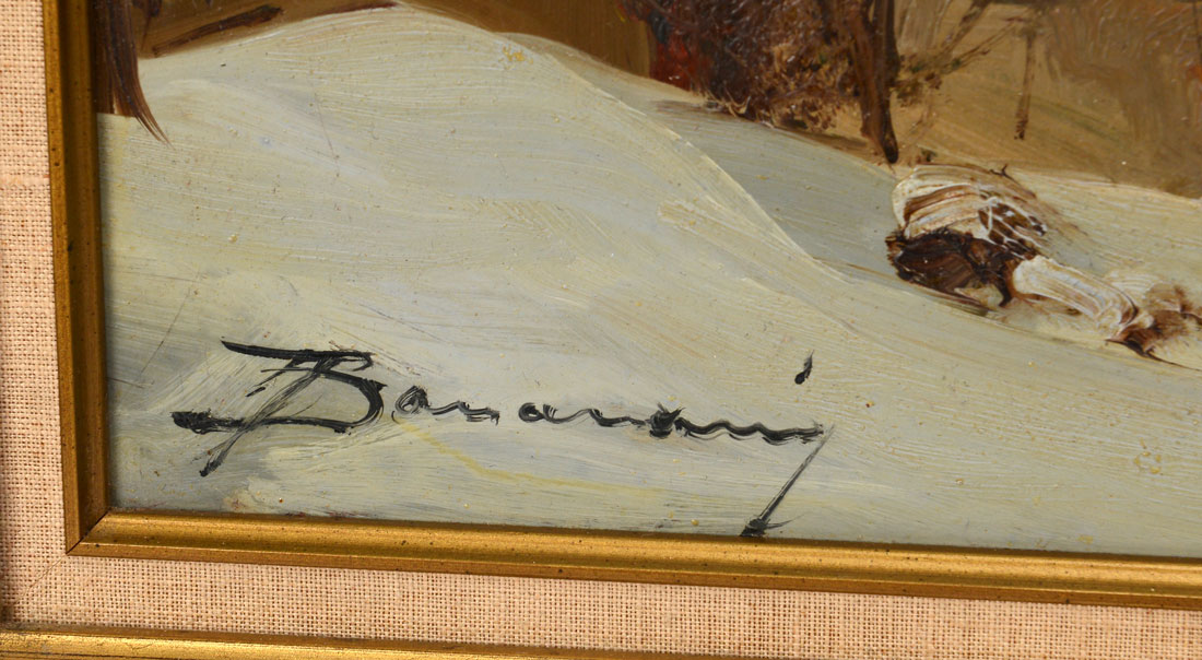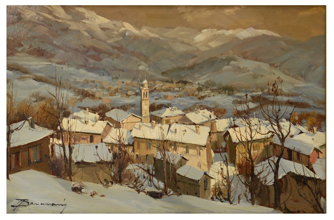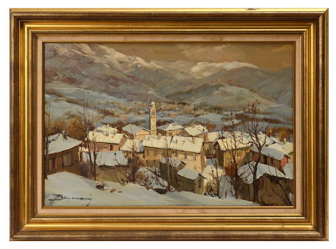 ILLEGIBLY SIGNED WINTER LANDSCAPE PAINTING: Oil/Board, Possibly of a town in Austria called Obertilliach, 1`6'' x 24'', signed lower left, framed, 21'' x 29.5''.