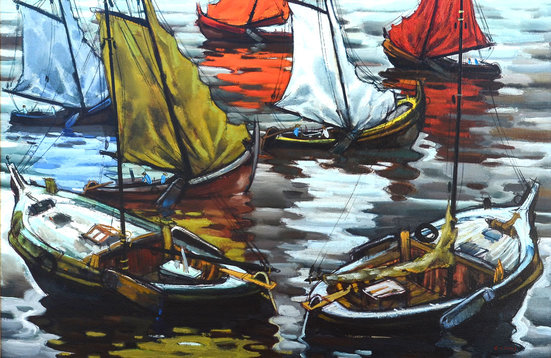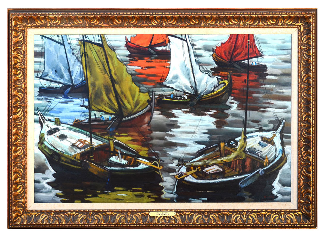 CASAUS, Jesus Mecko, (Spanish, 1926-2002): ''Red Sails'' Harbor Scene, Oil/Canvas, 25.50'' x 39.25'', signed lower right, fine original custom framing is 33'' x 46''.