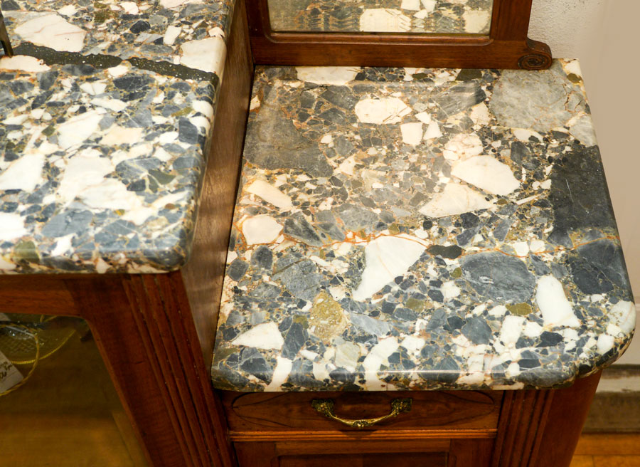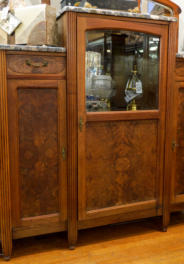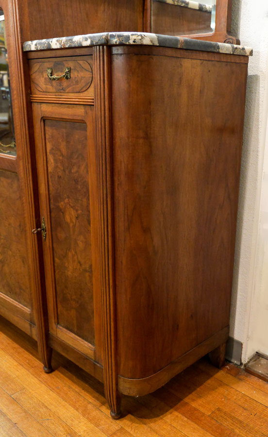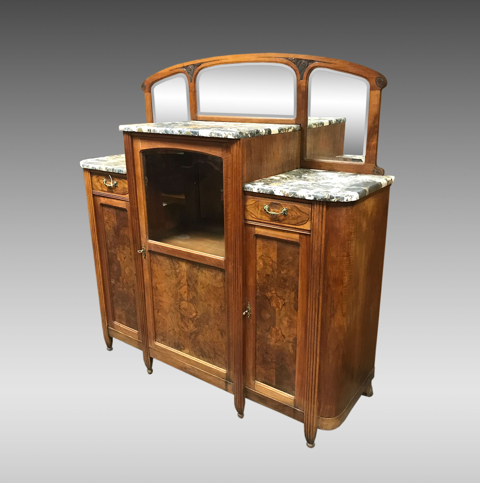 ART DECO MARBLE TOP SIDEBOARD: Arched top rail over 3 beveled mirrors, 3 marble tops, single door step up center section with shaped glass top half, single drawer over single door either side, burl wood veneer fronts, fluted stiles, 66 3/4'' x 62'' x 20 3/4''.