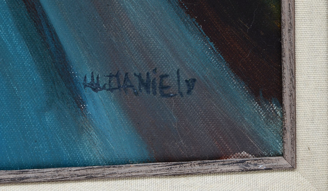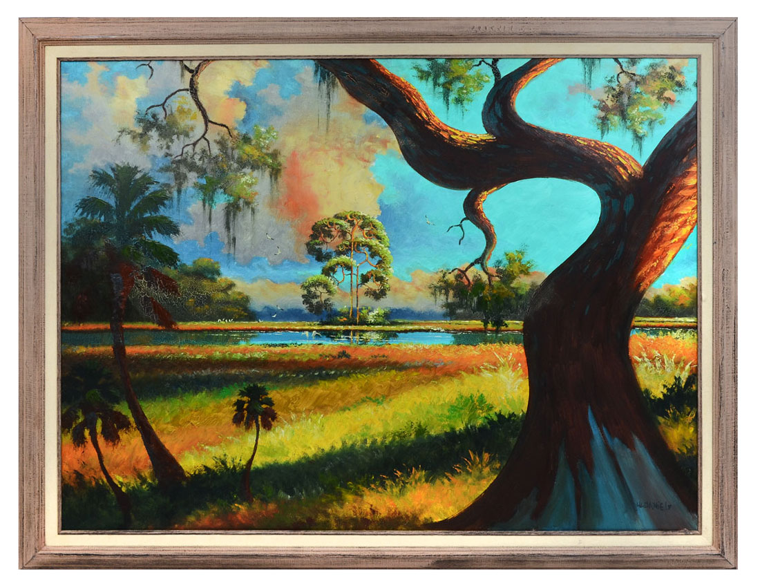 DANIELS, Willie, (American, 20th Century): Florida Highwaymen vibrant backwaters scene with unusual trees in foreground as well and birds in flight, Oil/Canvas, signed and dated lower right, 30'' x 40'', framed 35 1/2'' x 40''. CONDITION: Craquelure.