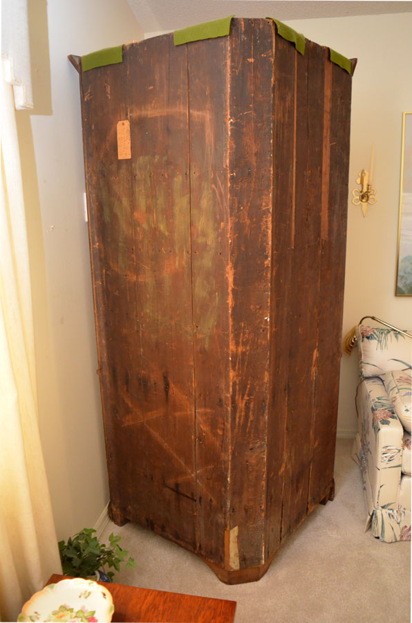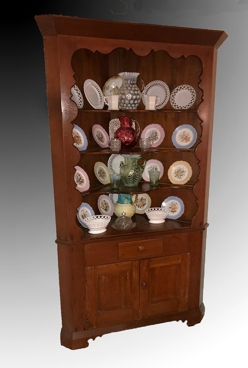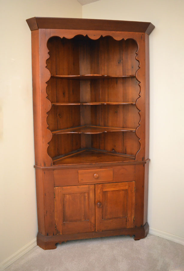 19TH CENTURY CHERRY CORNER CABINET: Open front with scalloped frame, 3 serpentine shaped shelves over single small drawer over double blind doors, bracket feet. Overall 82'' h. x 46 1/2'' x 24''.