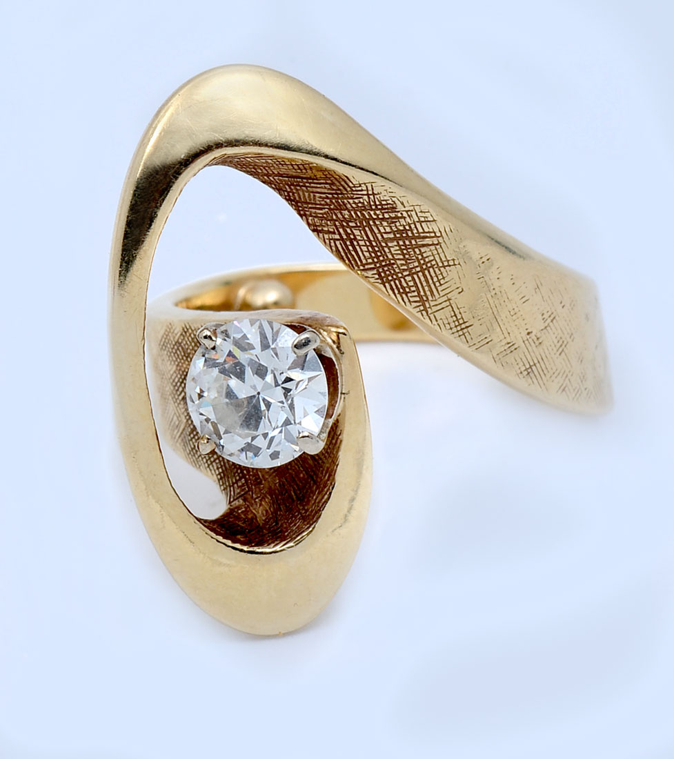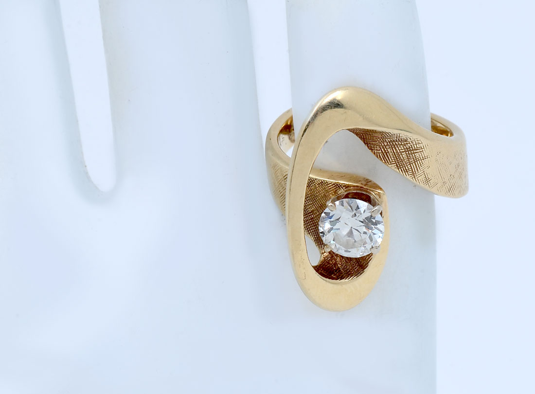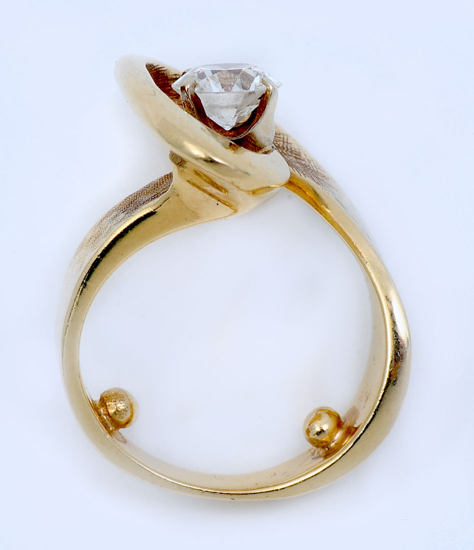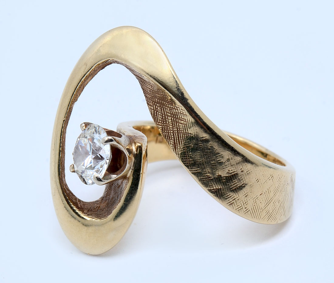 14K .90 CT. DIAMOND RING: 14K yellow gold ring contains one round brilliant cut diamond. WEIGHT: .90 Ct. Approx. Rated VS1 in clarity and H in color. The diamond is prong set. Weight: 9.1 grams. Size: 5