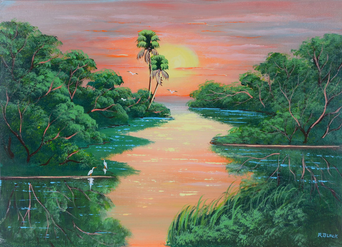 BLACK, Al, (American, 20th Century): Florida Highwaymen St. Lucie River vibrant sunrise scene with birds, Oil/Canvasboard, signed lower right, 18'' x 24'', unframed.