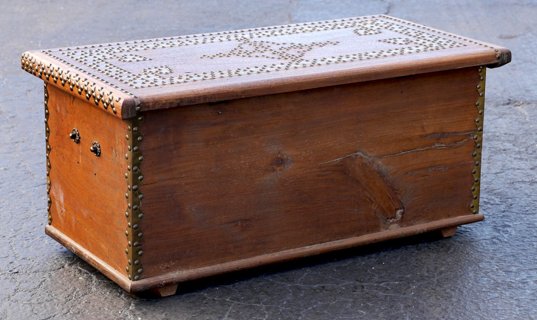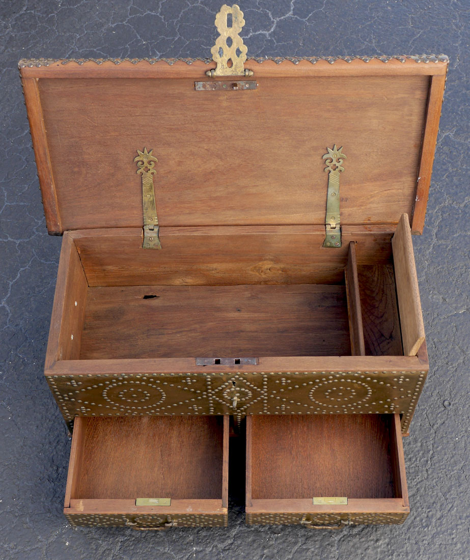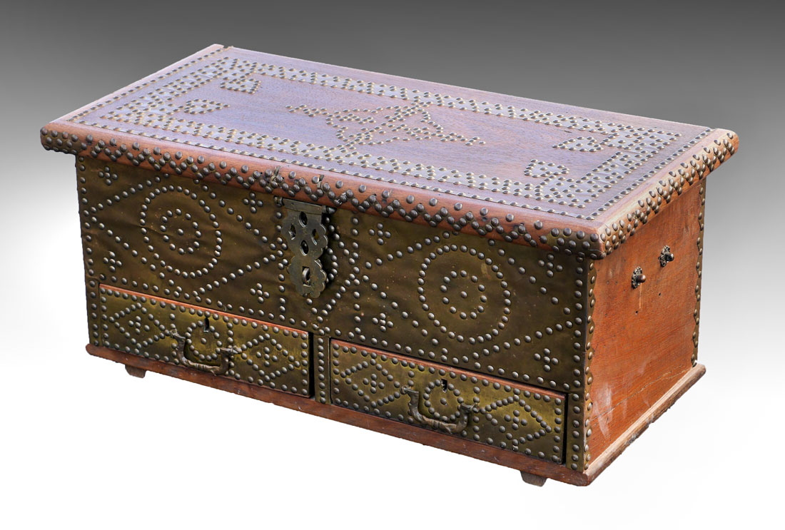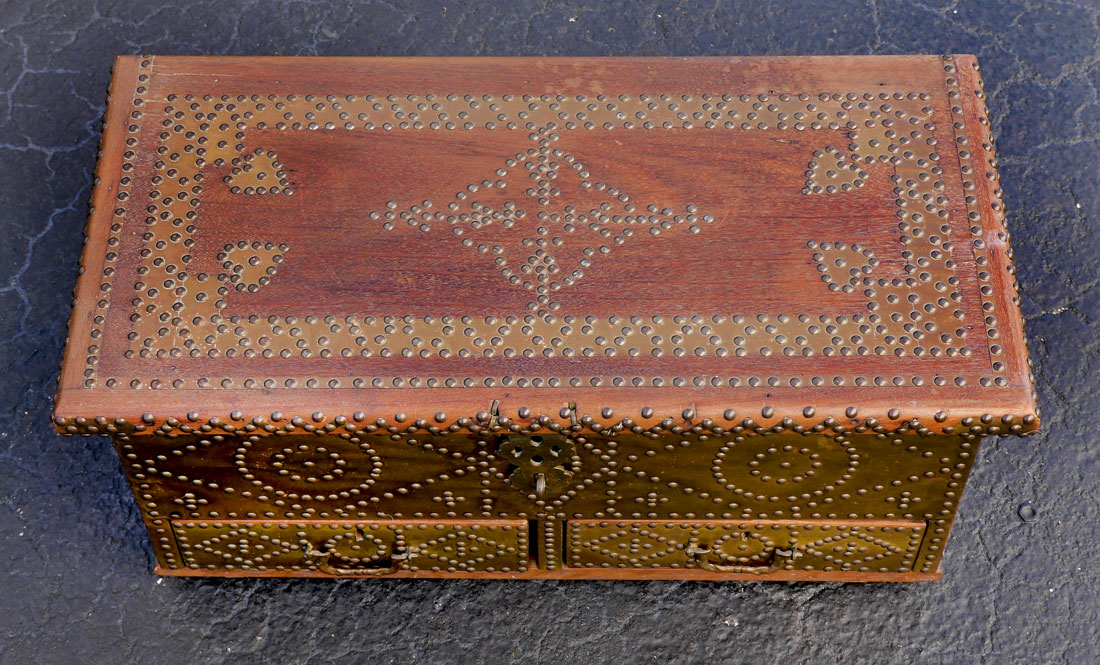 MIDDLE EASTERN BRASS CLAD & TACKED CHEST: Small blanket or dower chest, hinged lid, top and sides with applied brass decoration and iron tack designs, 2 lower drawers. Fitted interior with lidded compartment, overall measures 13 1/2'' h. x 29 1/2'' x 14 3/4''.