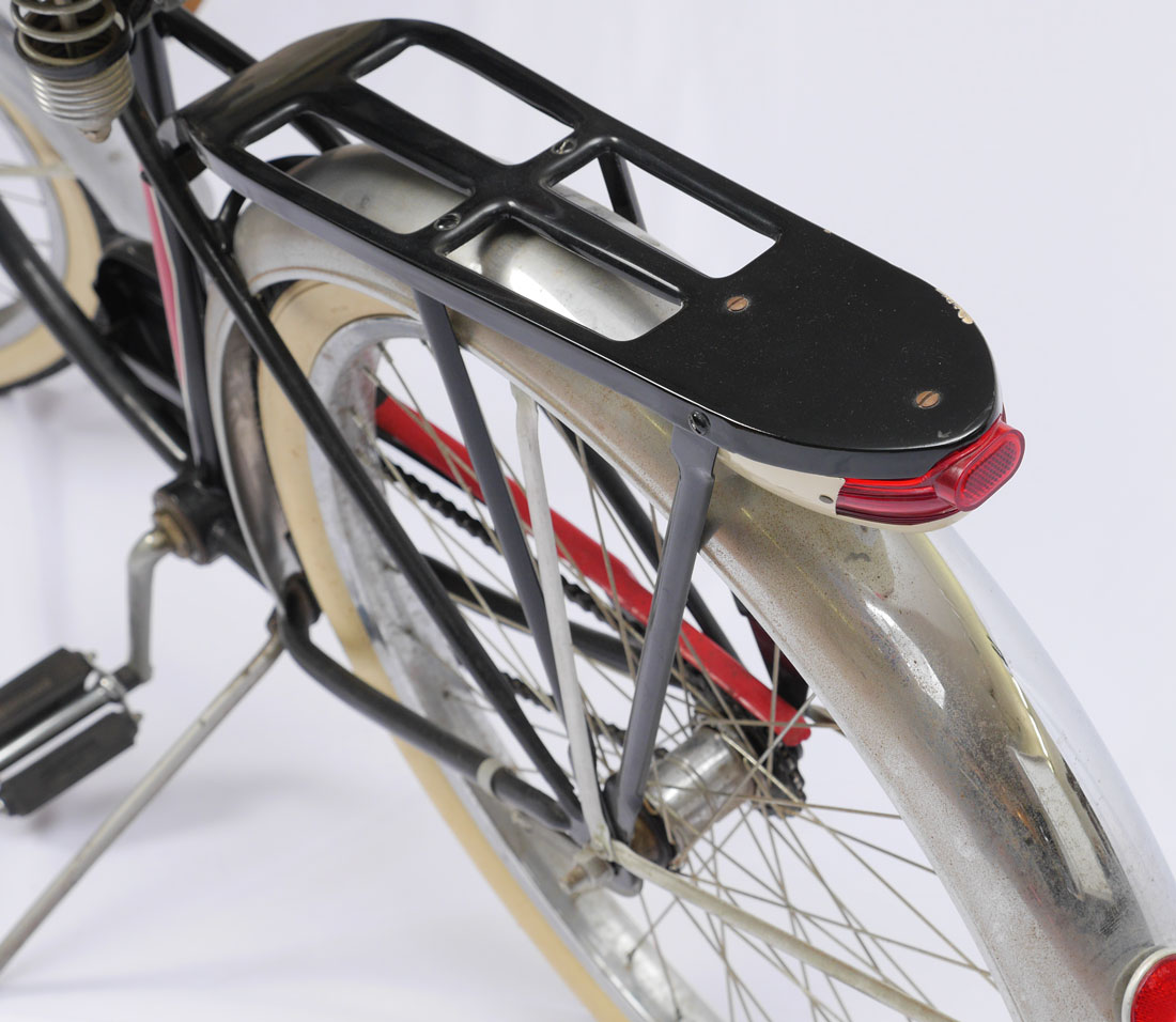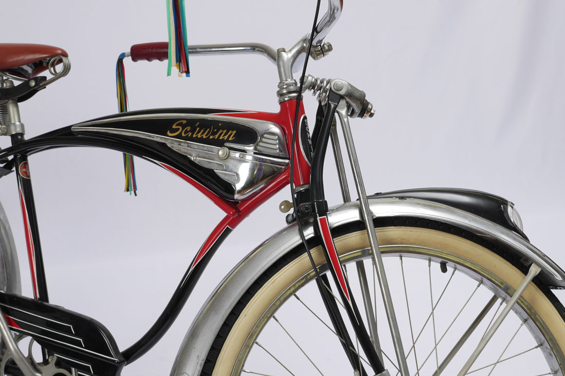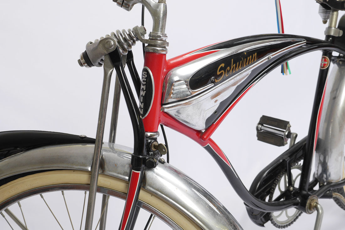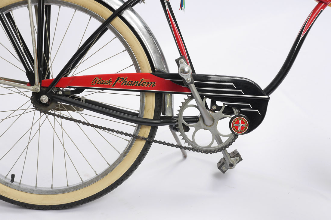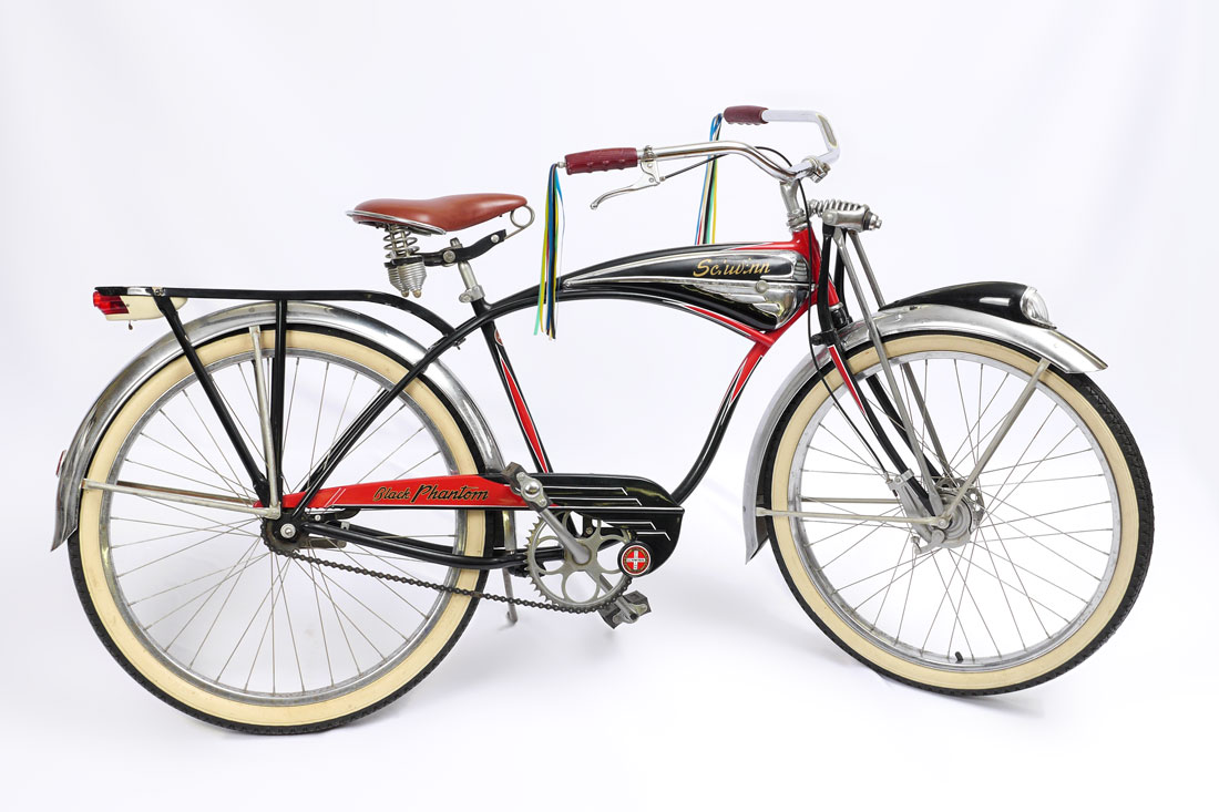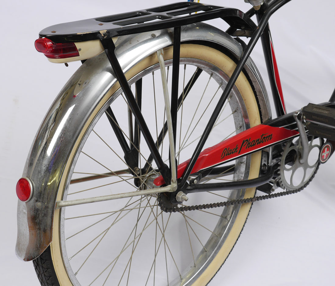 VINTAGE 1950'S SCHWINN BLACK PHANTOM BICYCLE: Locking front fork, front and rear lights, black, red, and chrome decoration, Schwinn and Black Phantom decals. Bendix rear brake, Persons balloon seat. To the best of our knowledge all original.