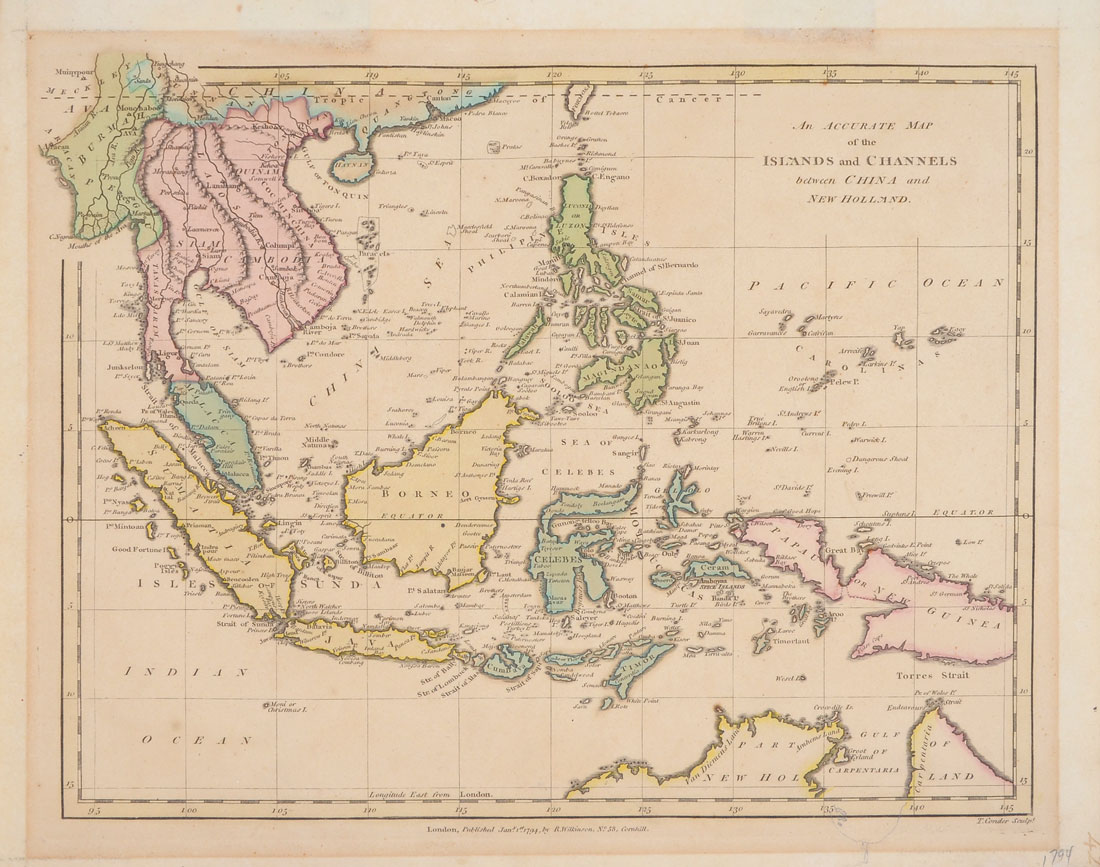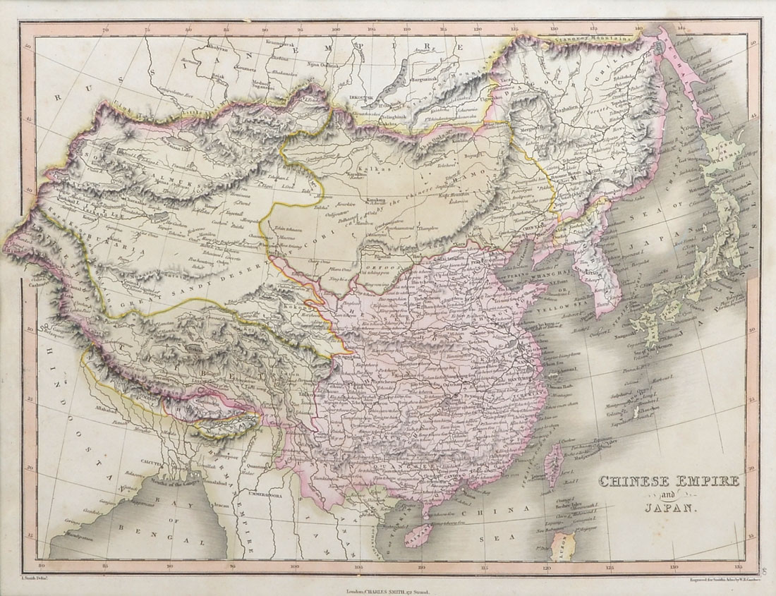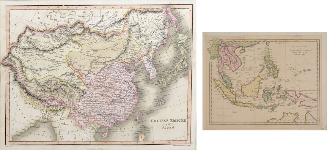2 EARLY MAPS OF CHINA, JAPAN, AND AUSTRALIA: 2 maps total to include 1) ''An Accurate Map of the Islands and Channels between China and New Holland (Australia), published London, 1794, R. Wilkinson, hand tinted 10 1/2'' x 12 3/4''. 2) ''Chinese Empire and Japan'', published London, Charles Smith, circa 1836, sight size 11 1/4'' x 14 1/2'', matted 16 3/4'' x 21 1/2''.