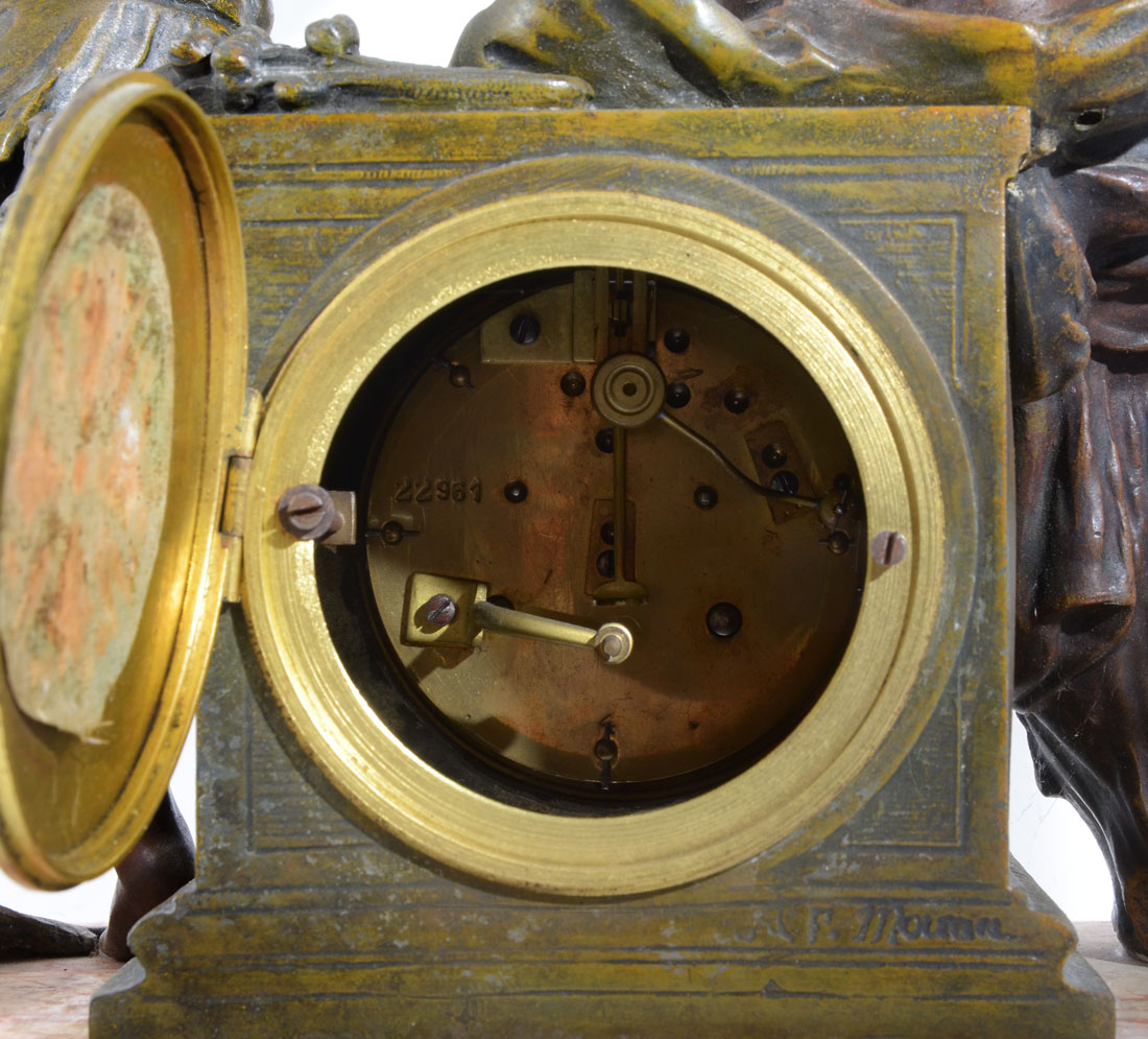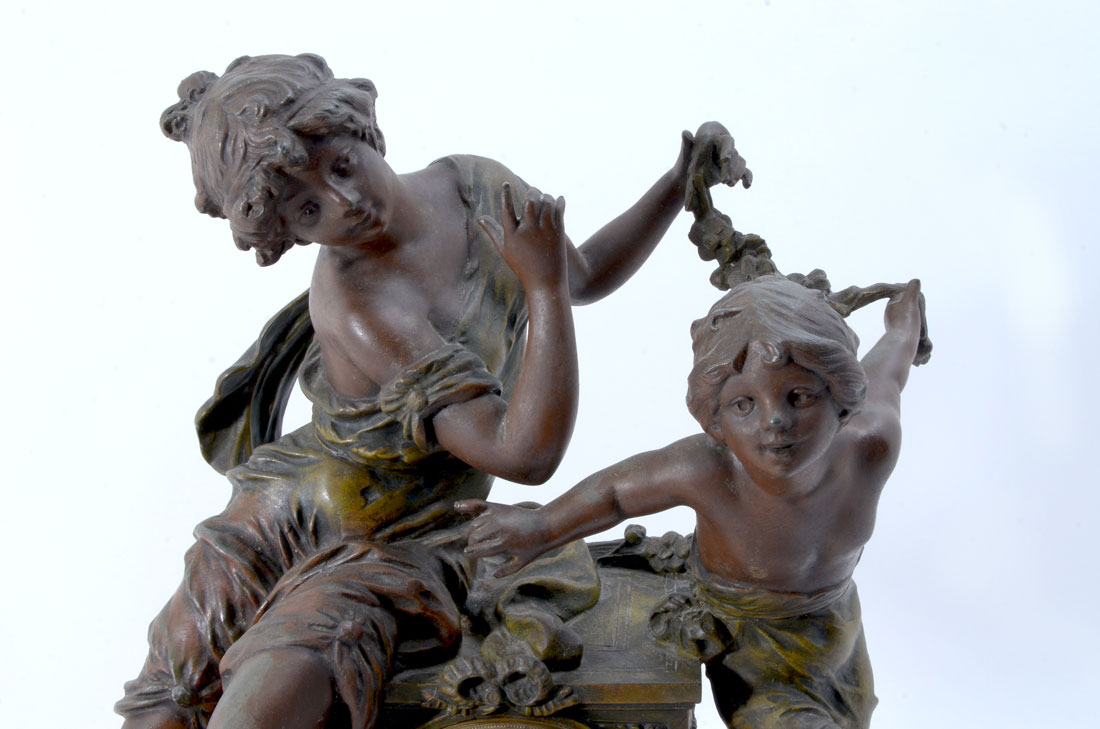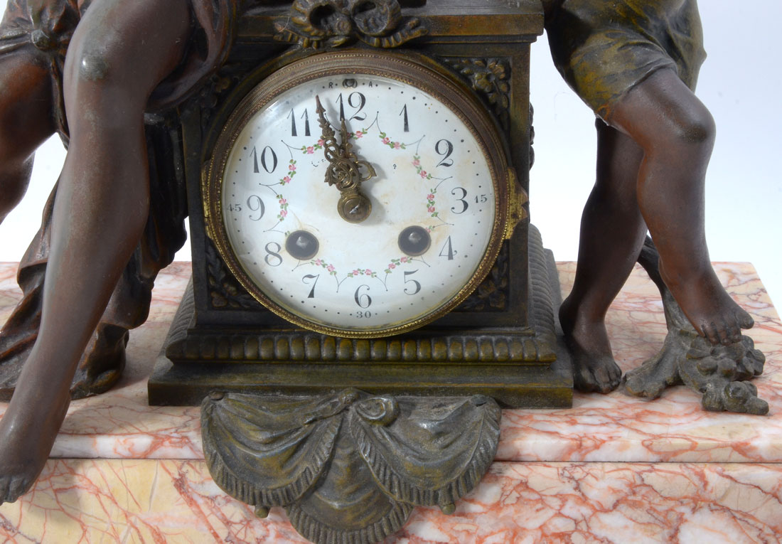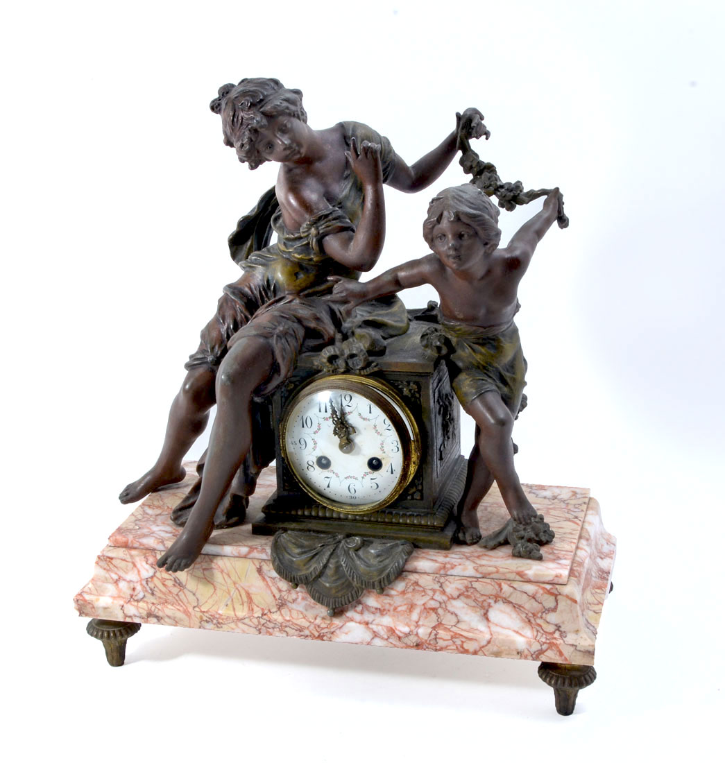 AFTER MOREAU FRENCH FIGURAL MANTLE CLOCK: Patinated cast spelter figural group of seated woman and child with garland, pink variegated marble base on 4 feet. Hand painted porcelain dial with partial dealer name, floral garland, Arabic numerals. Unmarked French time and strike movement, overall measures 17'' h. x 15'' x 7 1/2''.