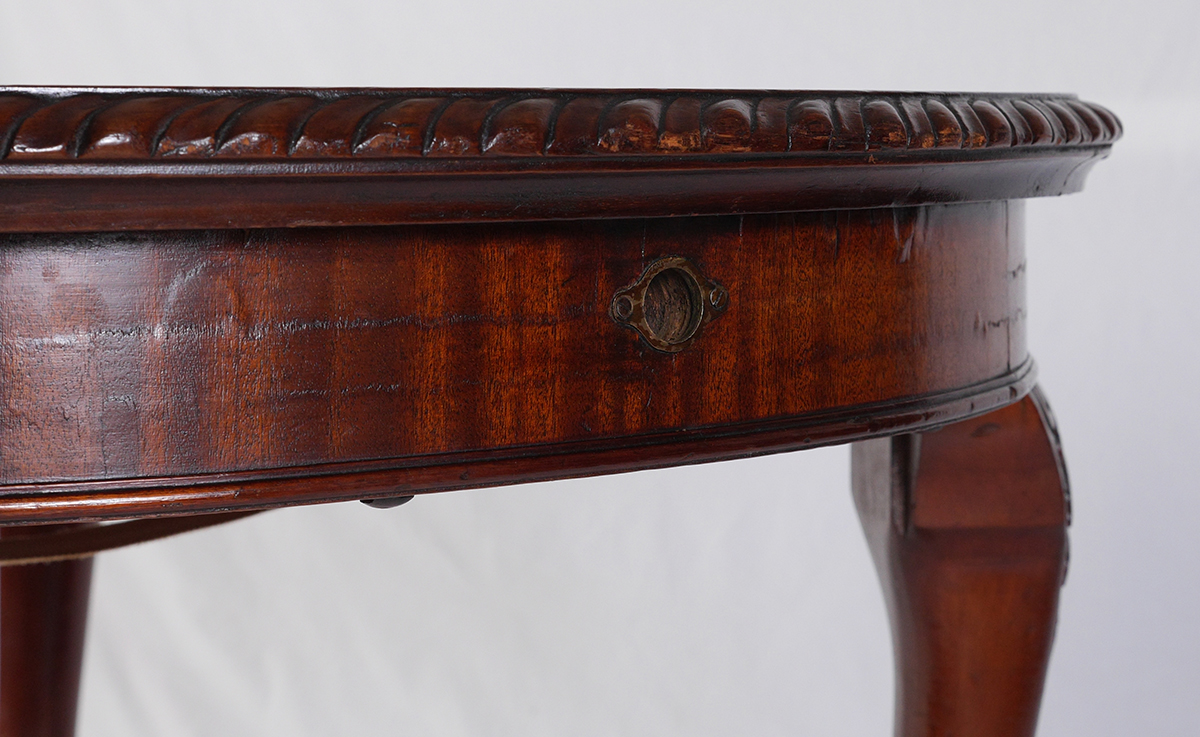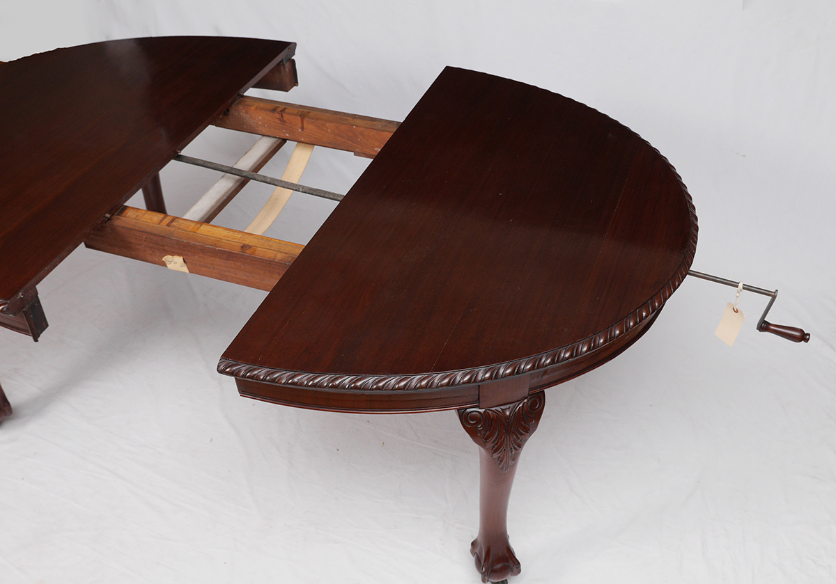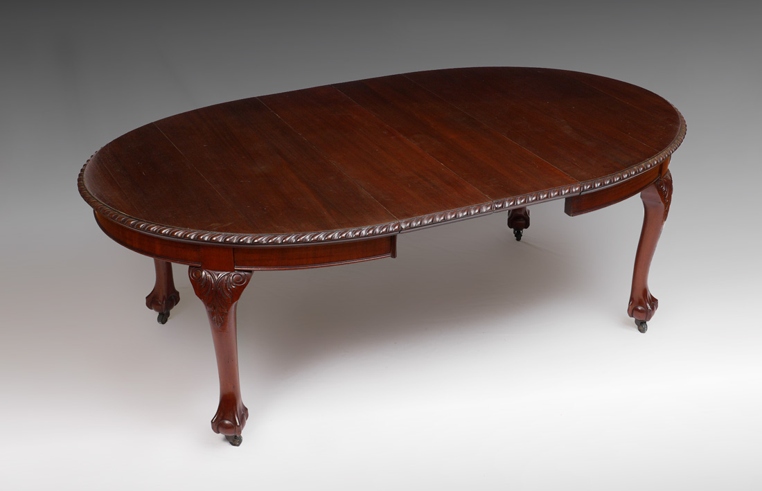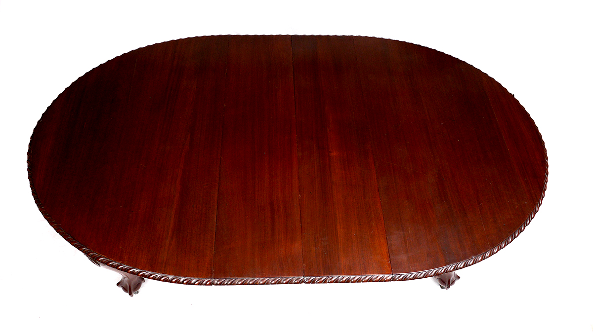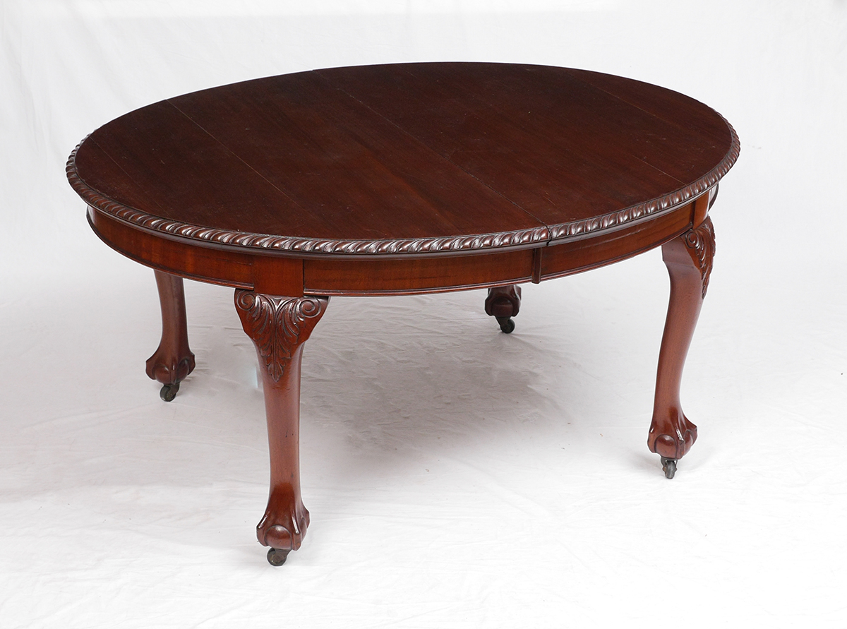 VICTORIAN CARVED DINING TABLE WITH LEAVES: Oval top with gadroon border, carved and shaped legs with acanthus leaves at joints, ending in ball claw and ball feet, mechanical crank driven slide, 29 1/4'' h. x 58 1/2'' x 47 3/4'', the two leaves 11 1/2''.