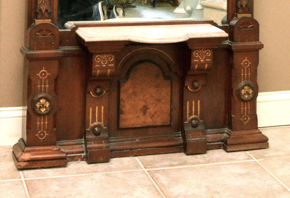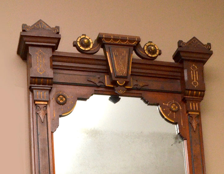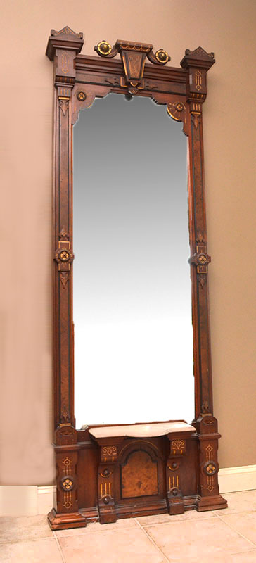 HIGH VICTORIAN WALNUT PIER MIRROR: Center crest with carved gilt accents, frame with applied carved and burl veneer decoration, lower shaped marble shelf. 98'' h. x 35 1/2'' x 10 1/2''.