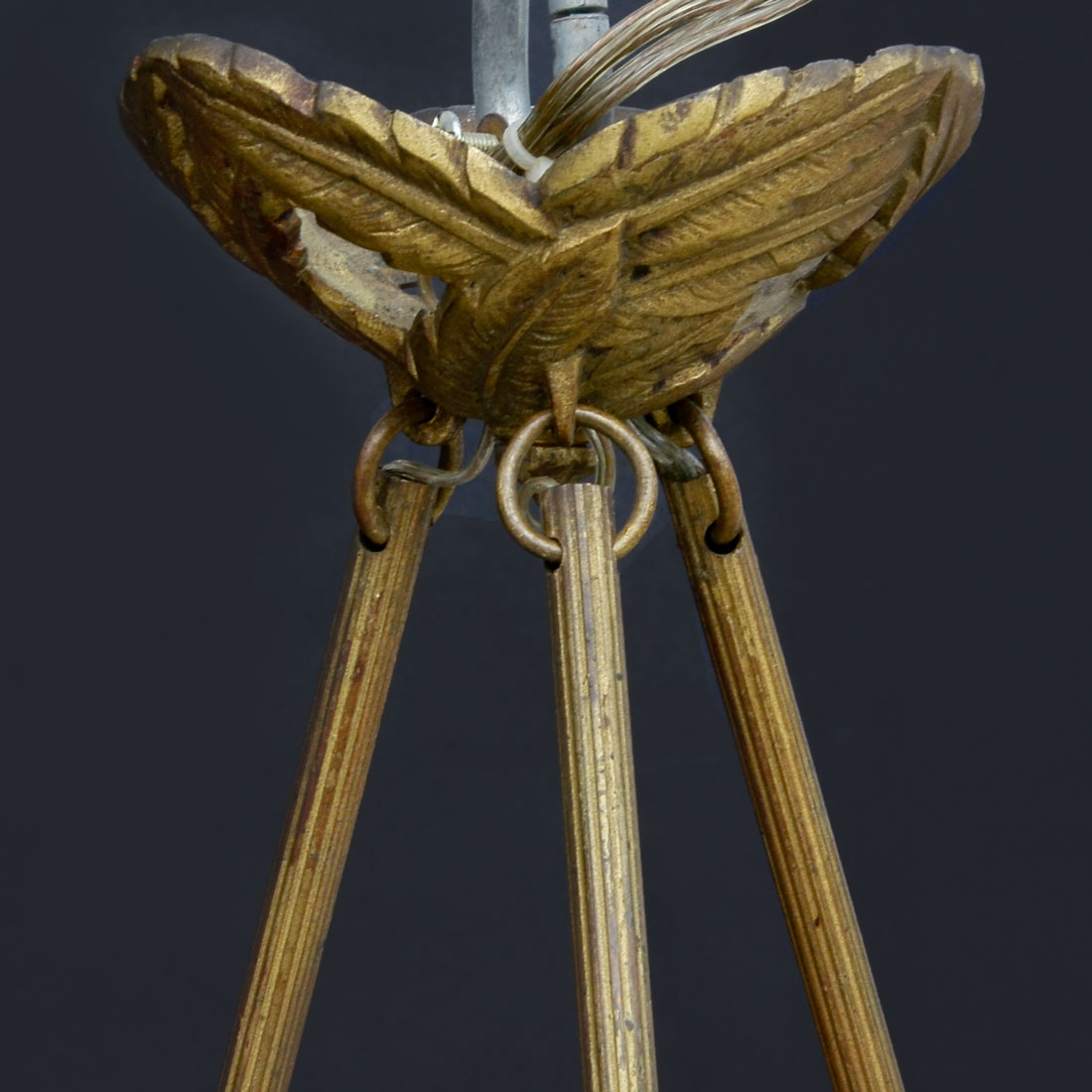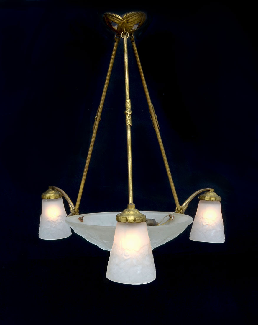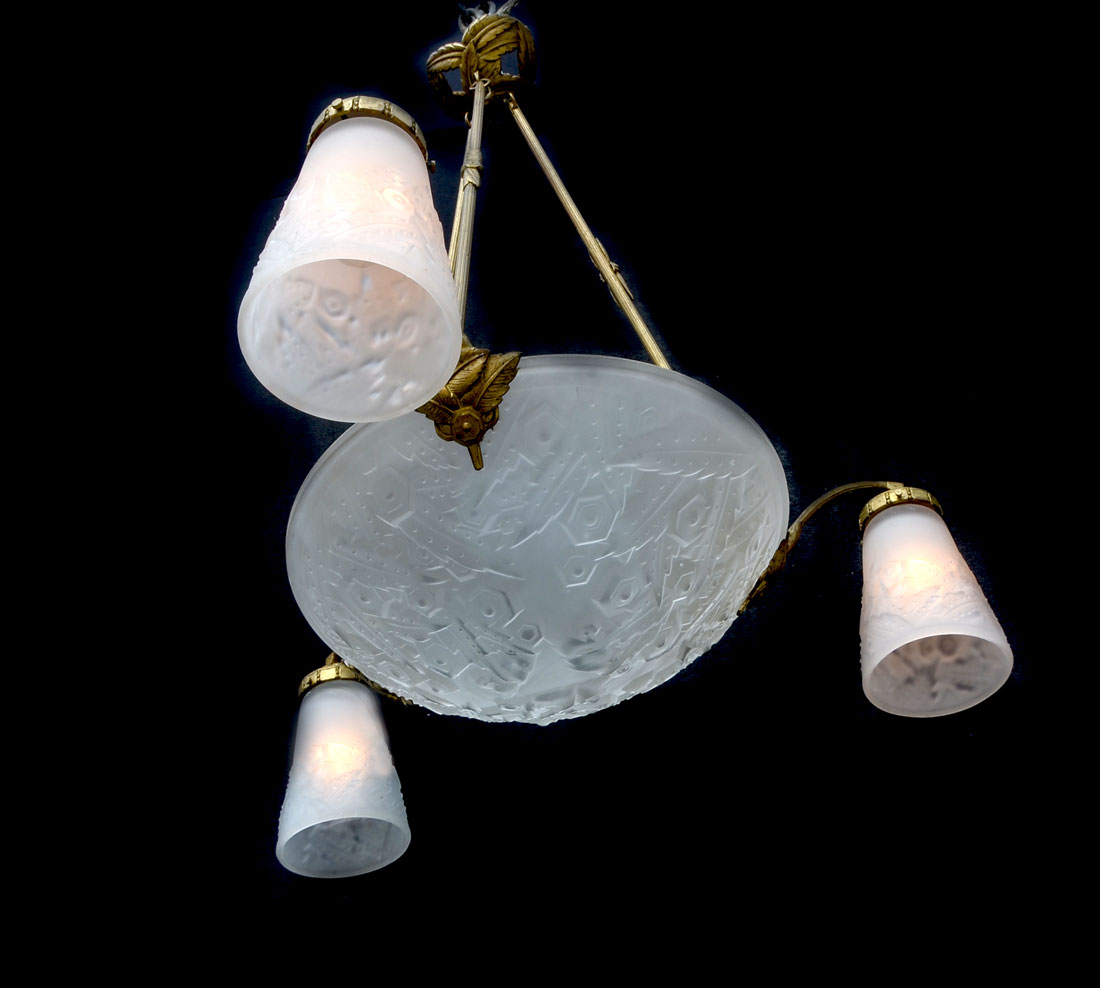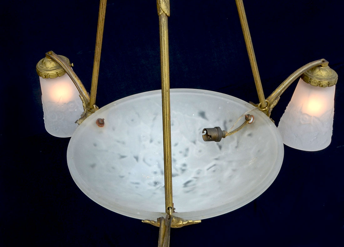 FRENCH ART DECO 3 LIGHT CHANDELIER: Cast brass supports and ceiling cap, shaped arms, molded frosted bowl shape center glass with stylized geometric foliate motif, measures 26 1/2'' h. x 22 1/2'' dia. 3 matching shades measures 5 1/2'' h. x 4 1/4'', fitter rim 2 1/4''.