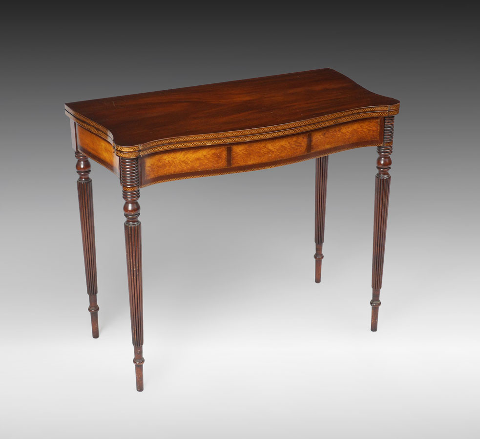 SHERATON MAHOGANY INLAID GAME TABLE: Serpentine flip top with parquetry inlaid trim, skirt with burl veneer accent panels, fluted and tapered legs. Overall measures 29 3/4'' h. x 35'' x 17 1/4''.