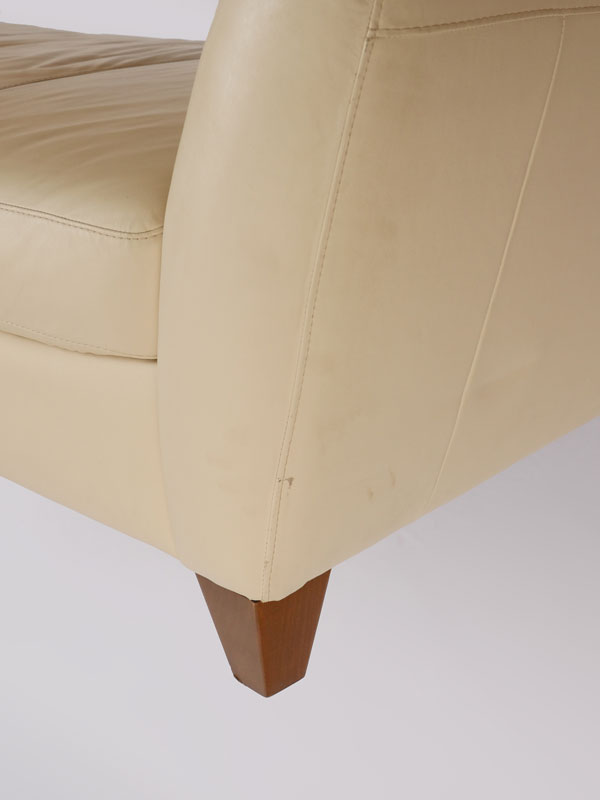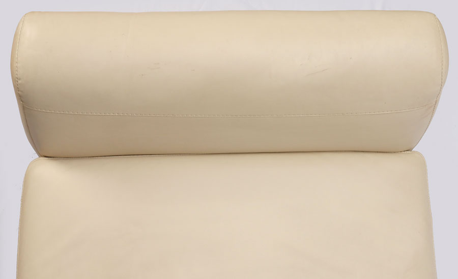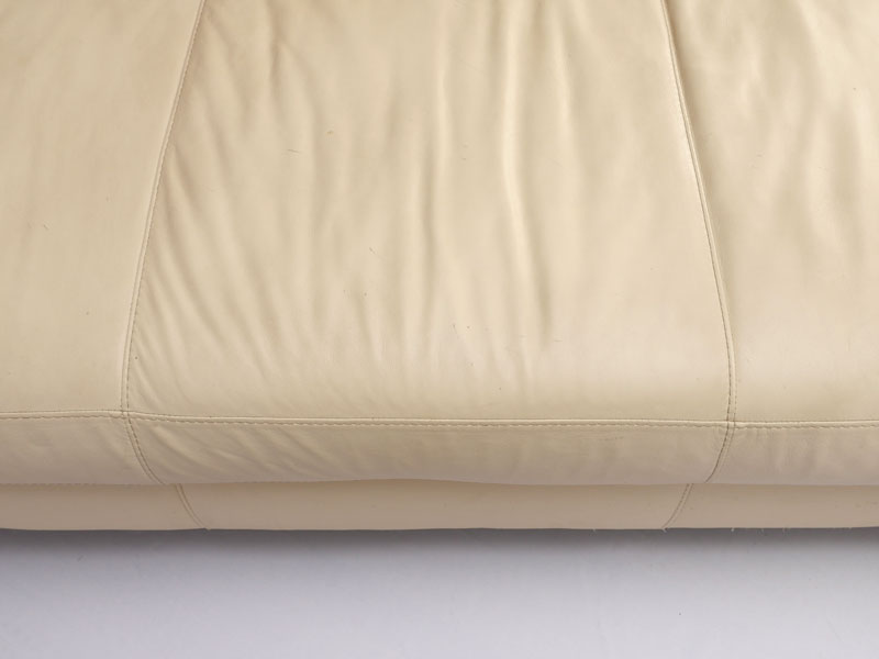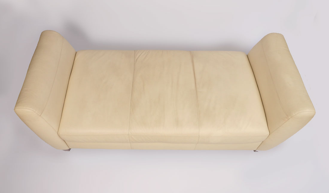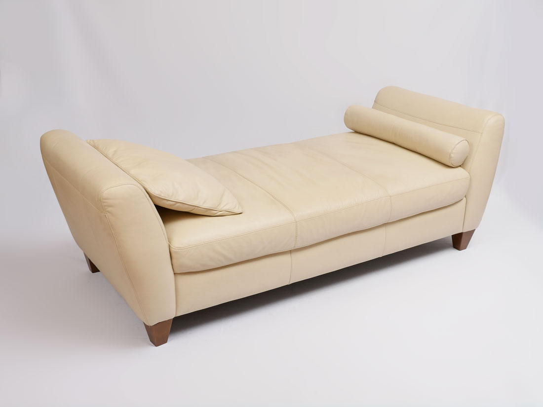 ITALIAN LEATHER DAY BED / SOFA: Cream leather upholstered day bed with 2 throw pillows. Overall measures 28'' h. x84'' x 32''.