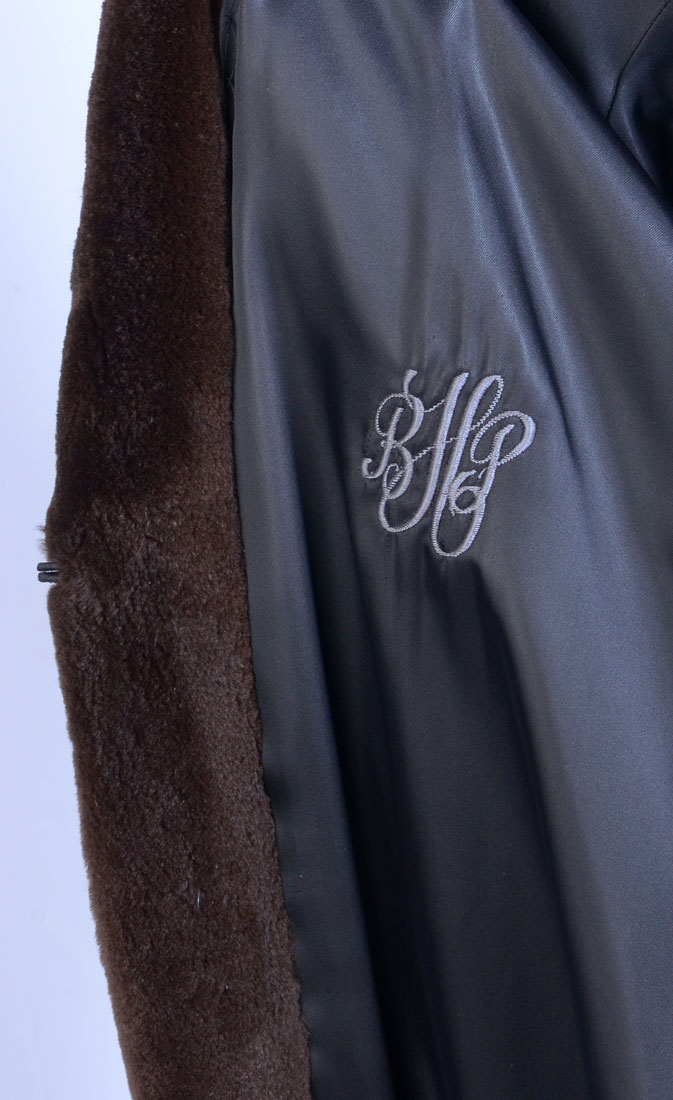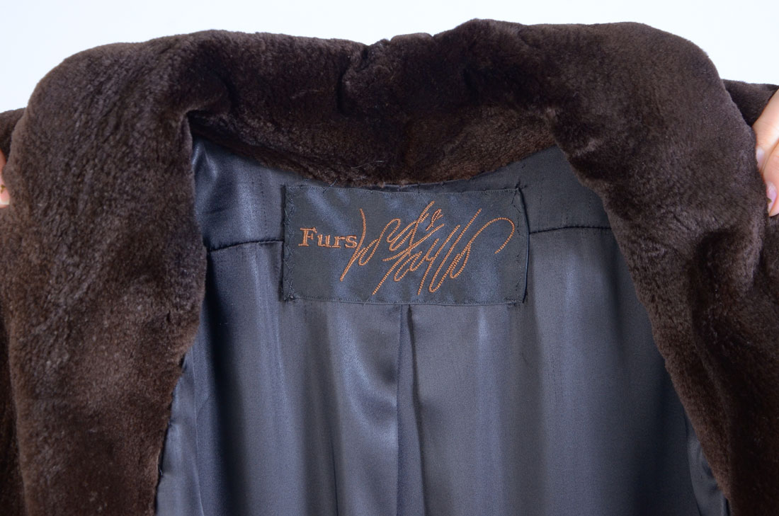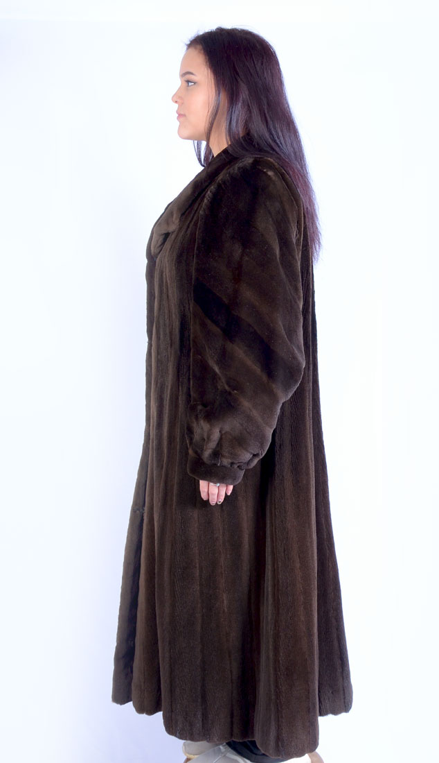 LORD & TAYLOR FULL LENGTH BROWN MINK: Lustrous to the touch, this sheared mink has two outer slit pockets and 4 hook and eye closures. Length is 48'' from the shoulder to the hem, 18'' from shoulder to shoulder and 29'' from shoulder seam to arm cuff.