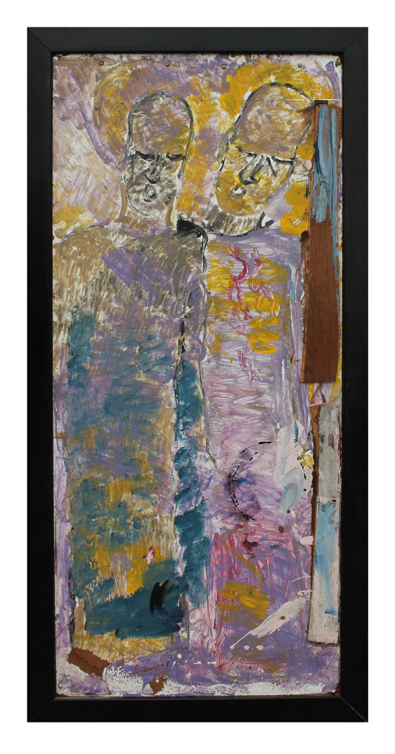 YOUNG, Purvis, (American, 1943-2010): ''Two Standing Figures'', Oil/Masonite with Applied Wood paneling, 48'' x 21.50'', framed 52.50'' x 26''.