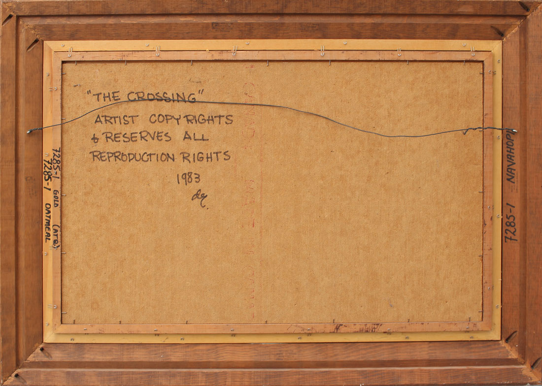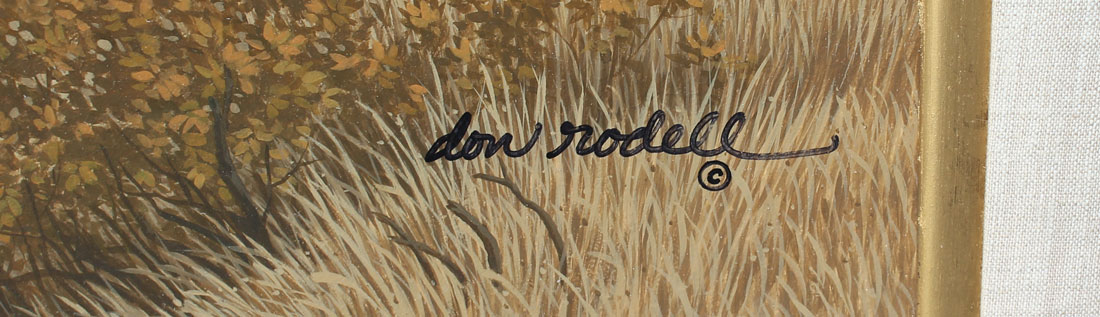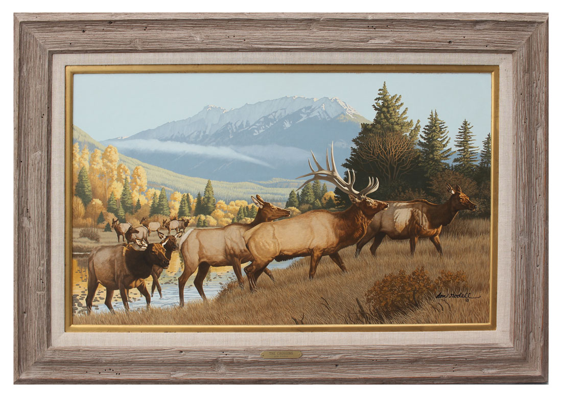 RODELL, Don, (American, 1932-2003): The Crossing, ''Scene Depicts Elk Crossing a River in a Vast Western Landscape'', Oil/ Masonite, sight size is 22'' x 36'', signed lower right, titled and dated 1983 verso, framed 33'' x 47''.
