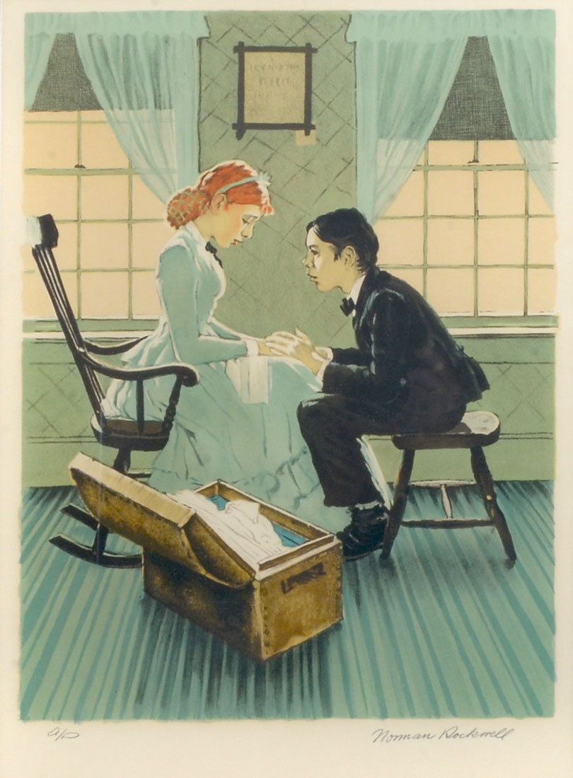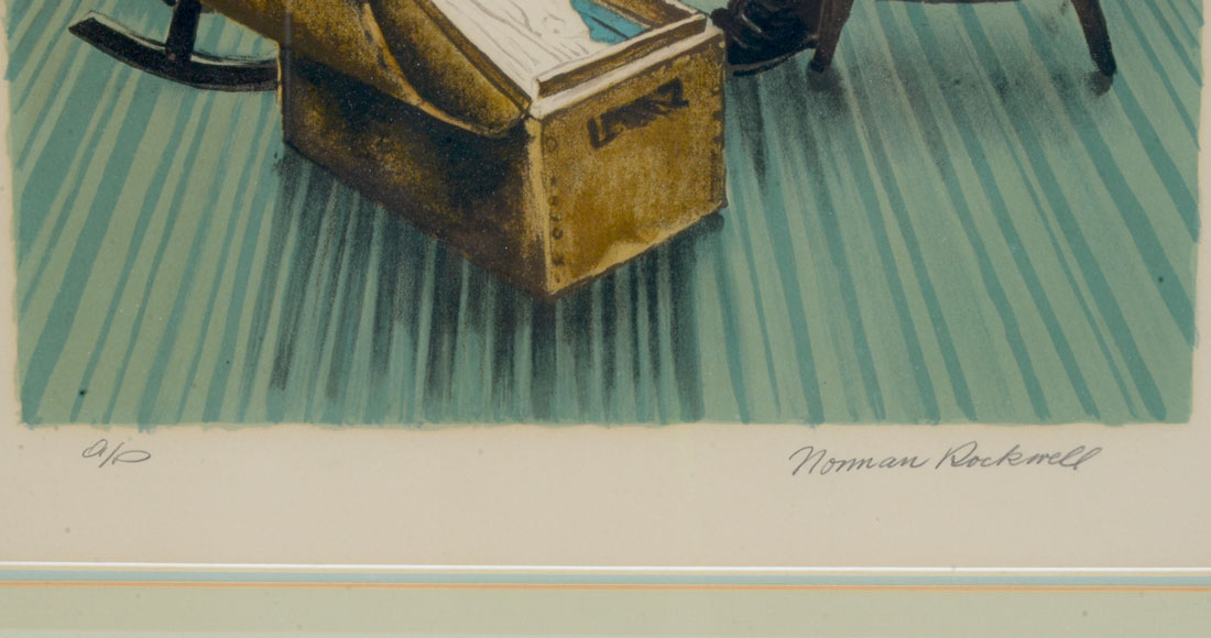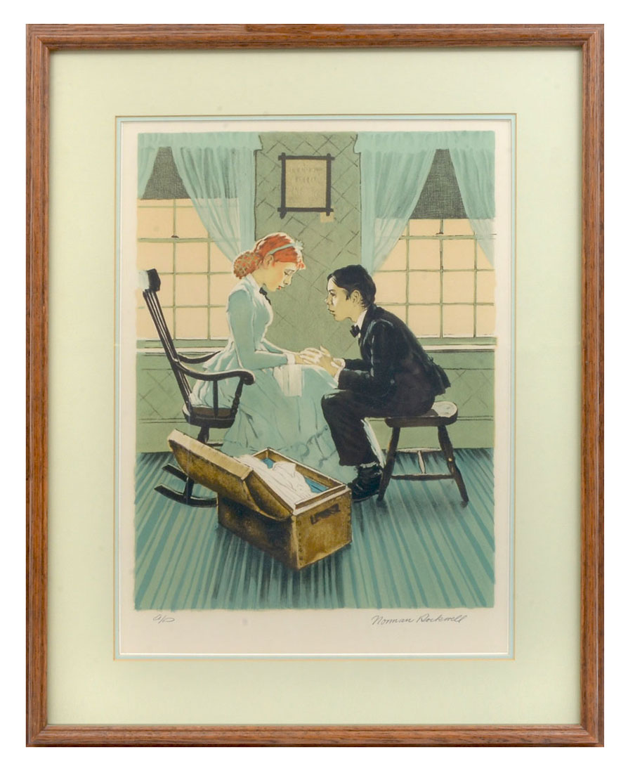 NORMAN ROCKWELL OFFSET LITHOGRAPH COURTING SCENE: Lithograph, sight size is 20'' x 14.50'', marked A. P. lower left for artist proof, pencil signed lower right, framed 27.50'' x 21.50''.