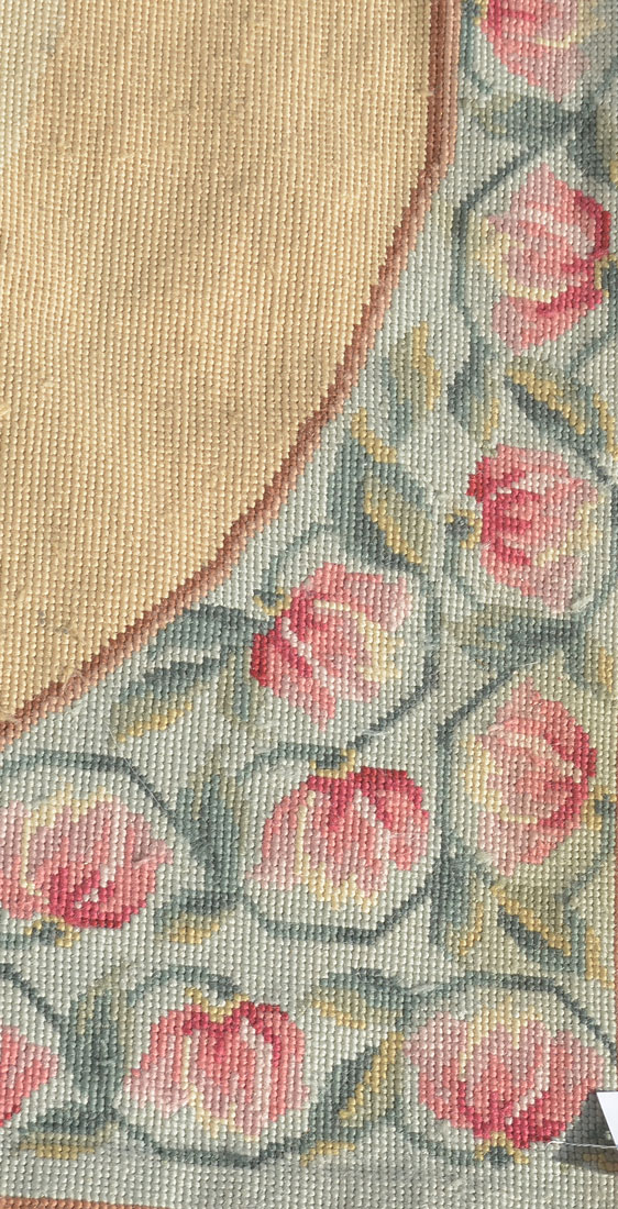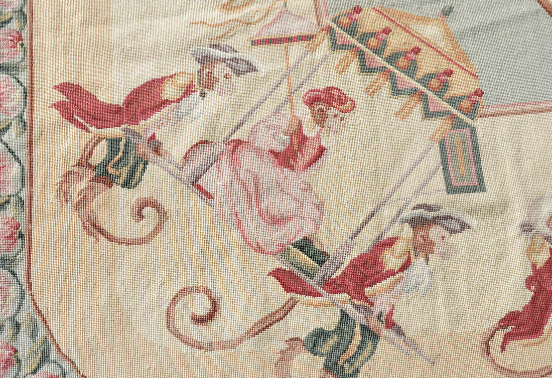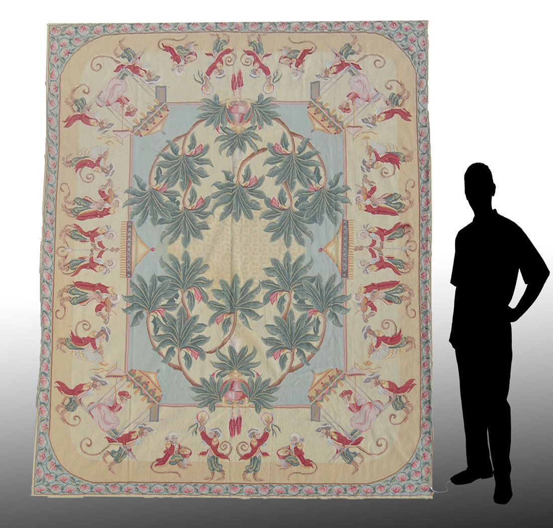 APPROX 15-30 OLD CHINESE AUBUSSON WOOL NEEDLEPOINT FLATWEAVE RUG, 7'10'' X 9'9'': Approx 15-30 yr old Chinese Aubusson wool needlepoint flatweave rug, (put size here). This whimsical needlepoint rug has a pattern that is composed of a field of coconut trees with a procession of monkeys dressed in red and green suits parading around edge of the center field. Some are playing tambourines or drums, some are carried in a traveling chair with an umbrella, and some have wigs or hats to complete their outfits. This rug would certainly be a conversation piece for your home.