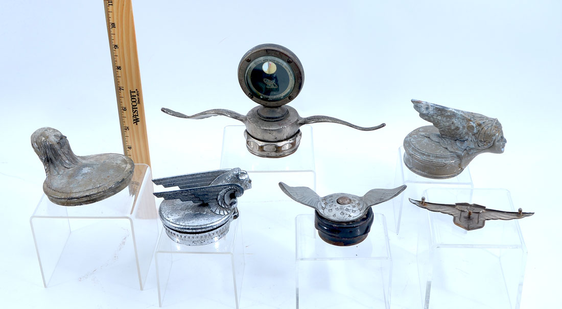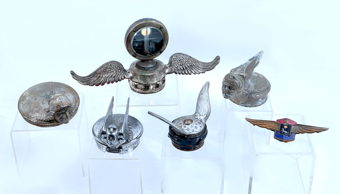 6 PIECE EARLY AUTOMOBILE CAR MASCOTS: An assembled collection of 5 car radiator caps / mascots and a badge. To include 1) 1929-1931 Chevrolet Viking. 2) 1928 Buick Female Goddess. 3) 1928 Pontiac Indian. 4) Unknown winged helmet. 5) Boyce Moto Meter with wings. 6) Unknown D. L. Auld badge, enameled shield with knight head, wings and dog.