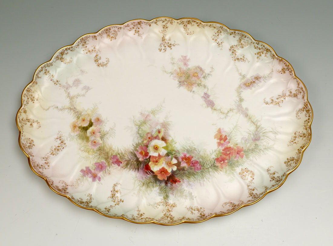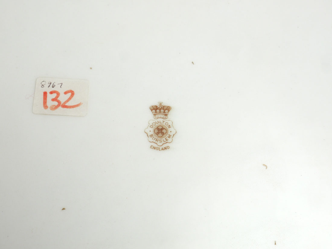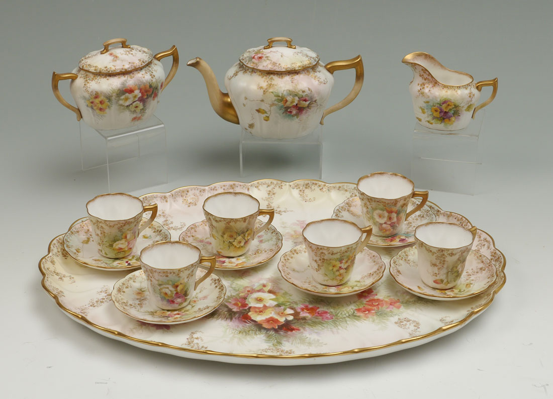 ROYAL DOULTON BURSLEM TEA SERVICE WITH TRAY: 16 pieces by Doulton Burslem, circa 1891-1901, hand painted floral motifs, to include teapot (4 3/4'' h. x 8 1/2''), open creamer, covered sugar, 6 teacups and saucers, tray with scalloped edge (19 1/2'' x 14 3/4'').